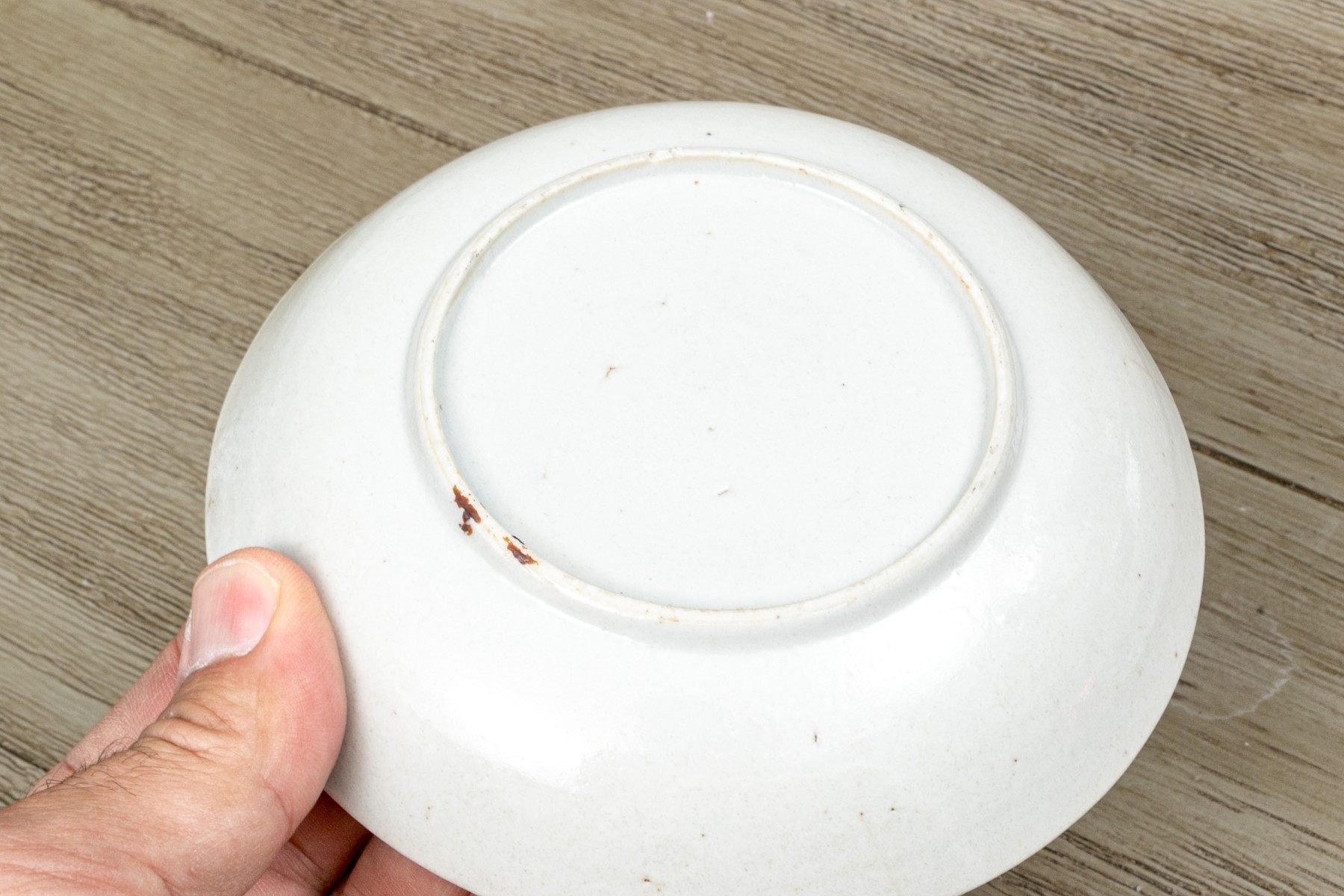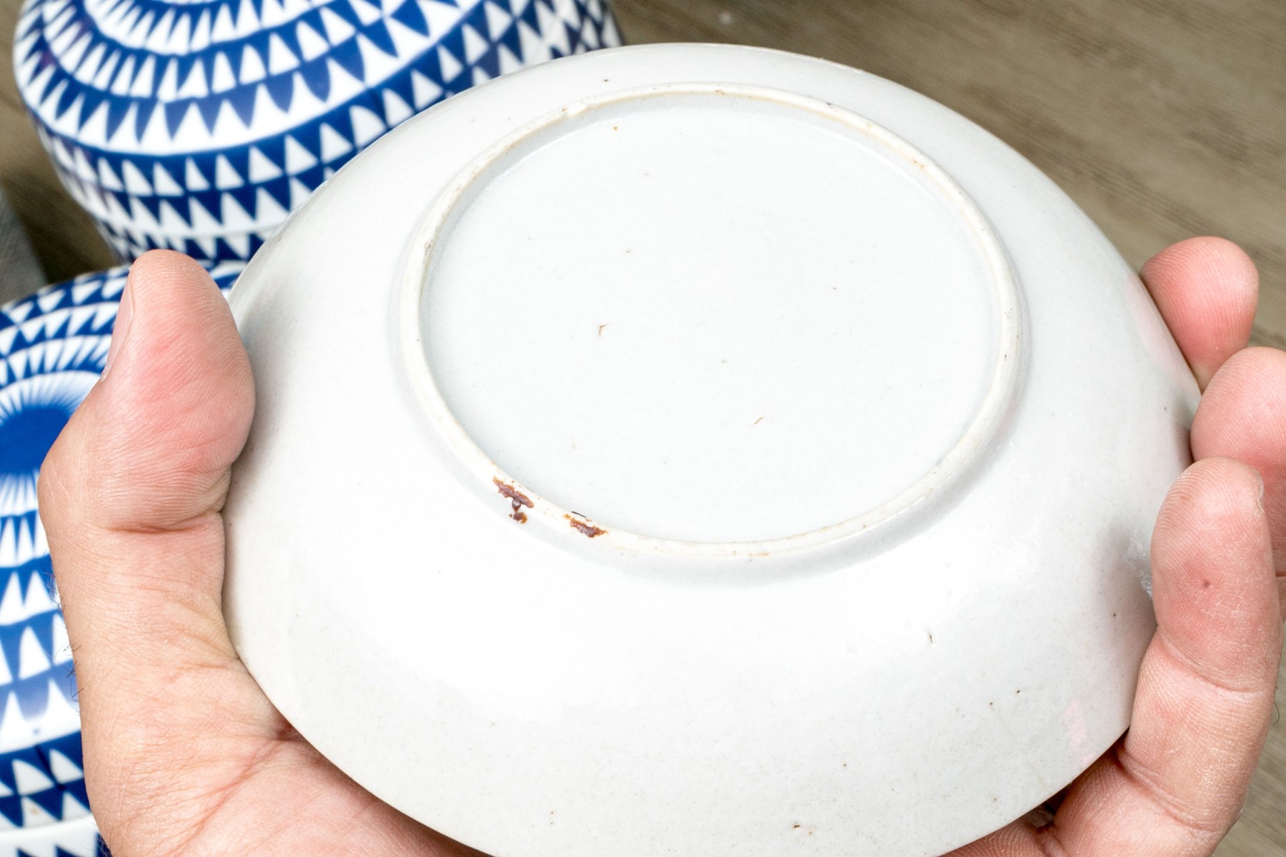 Presents well overall. The largest dish has some discoloration and a negligible nick to the foot.