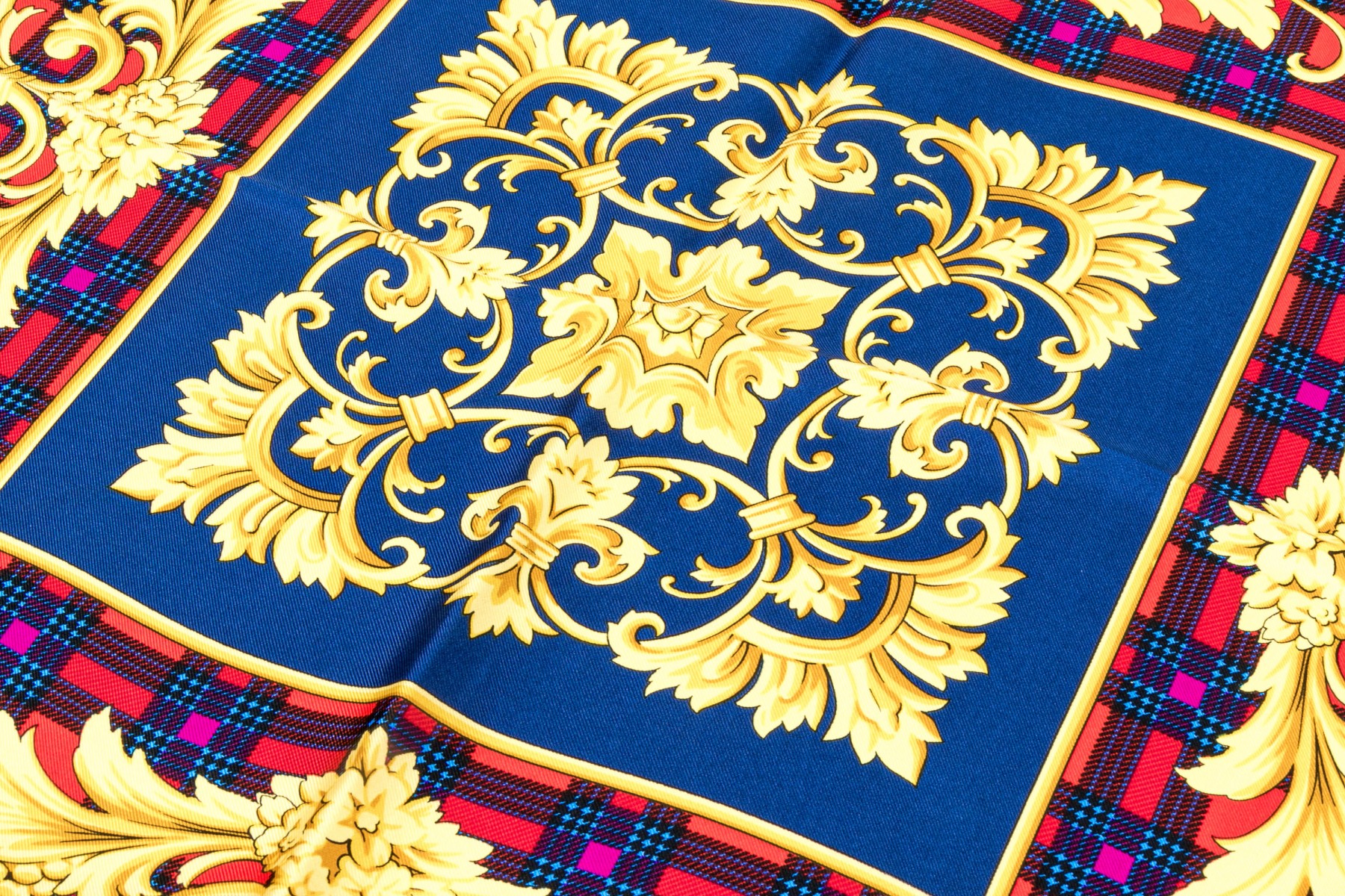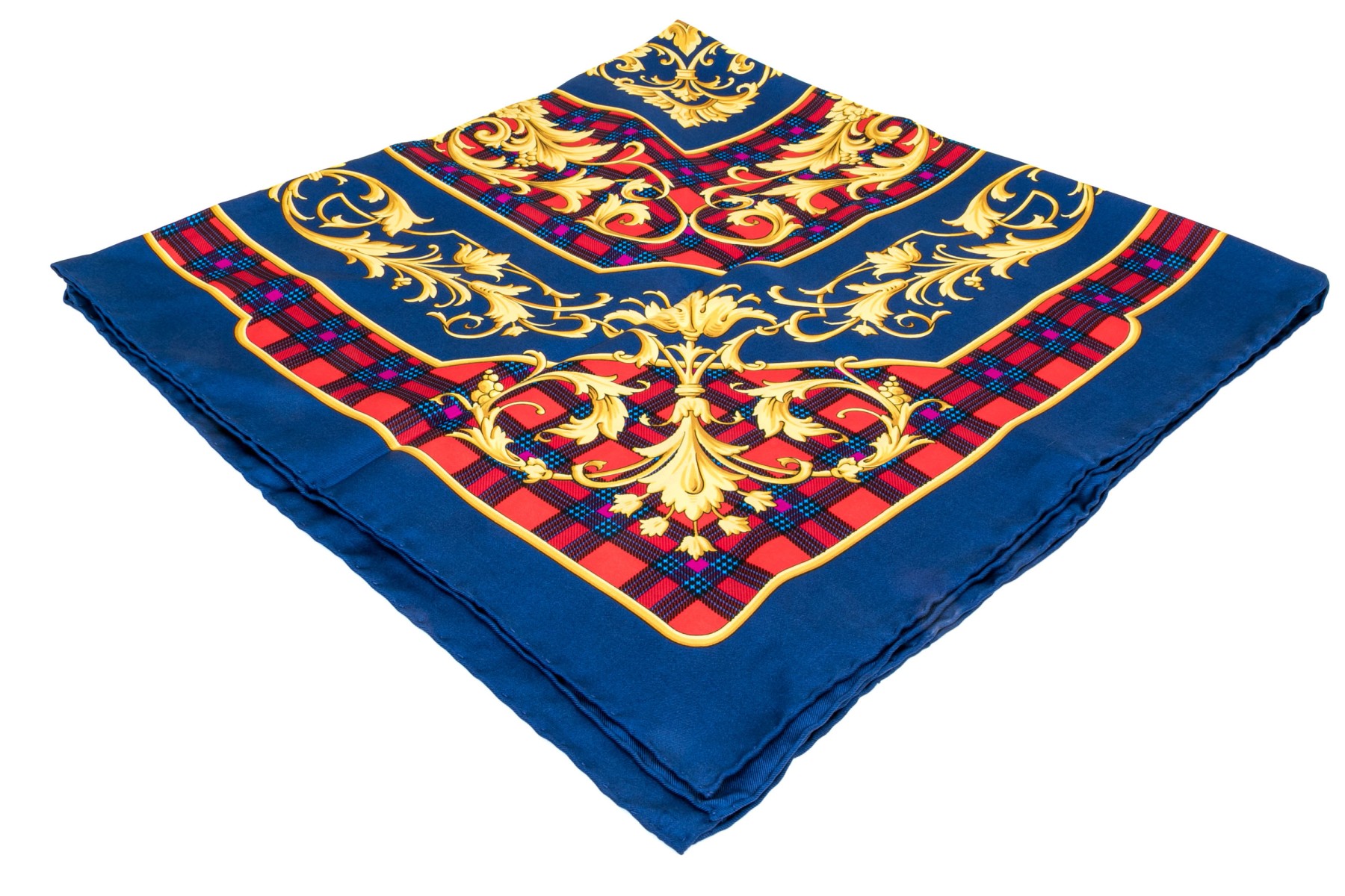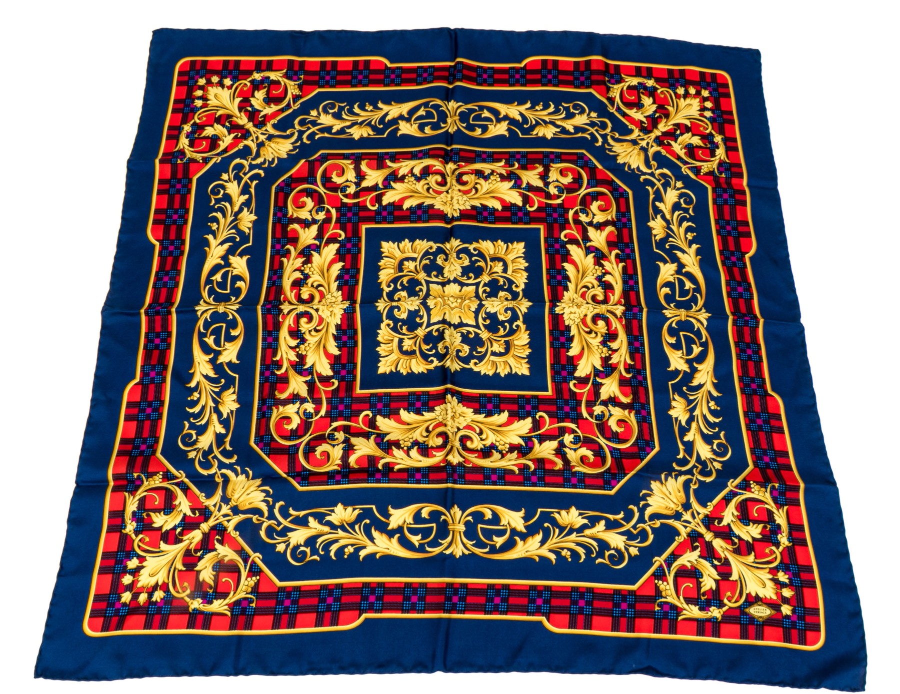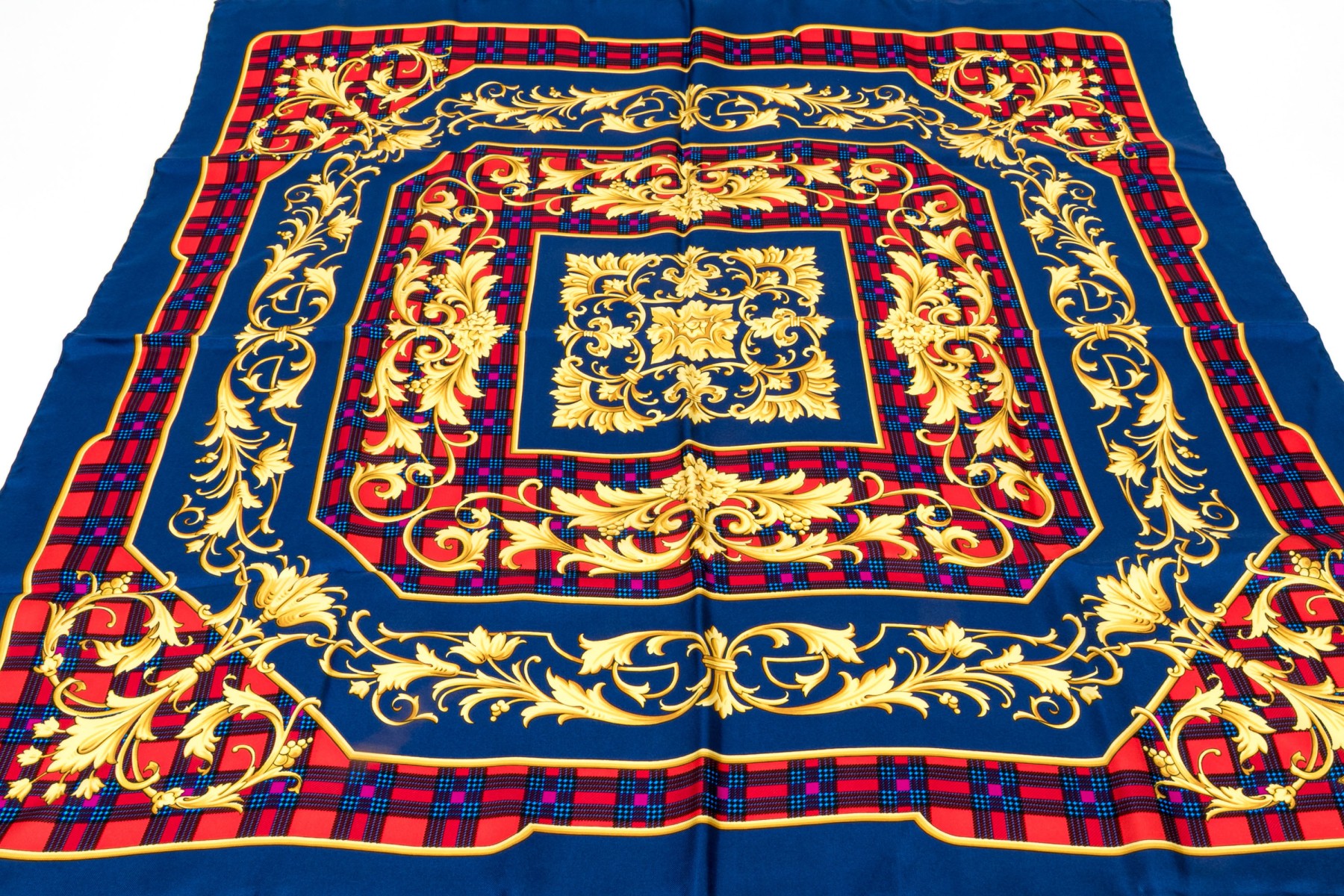 Atelier Versace classic blue red and gold toned vintage silk scarf