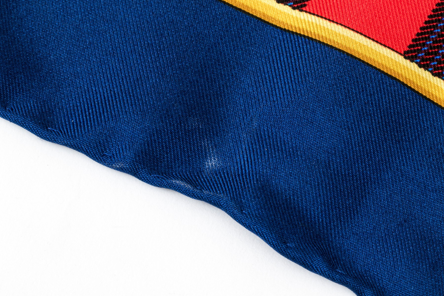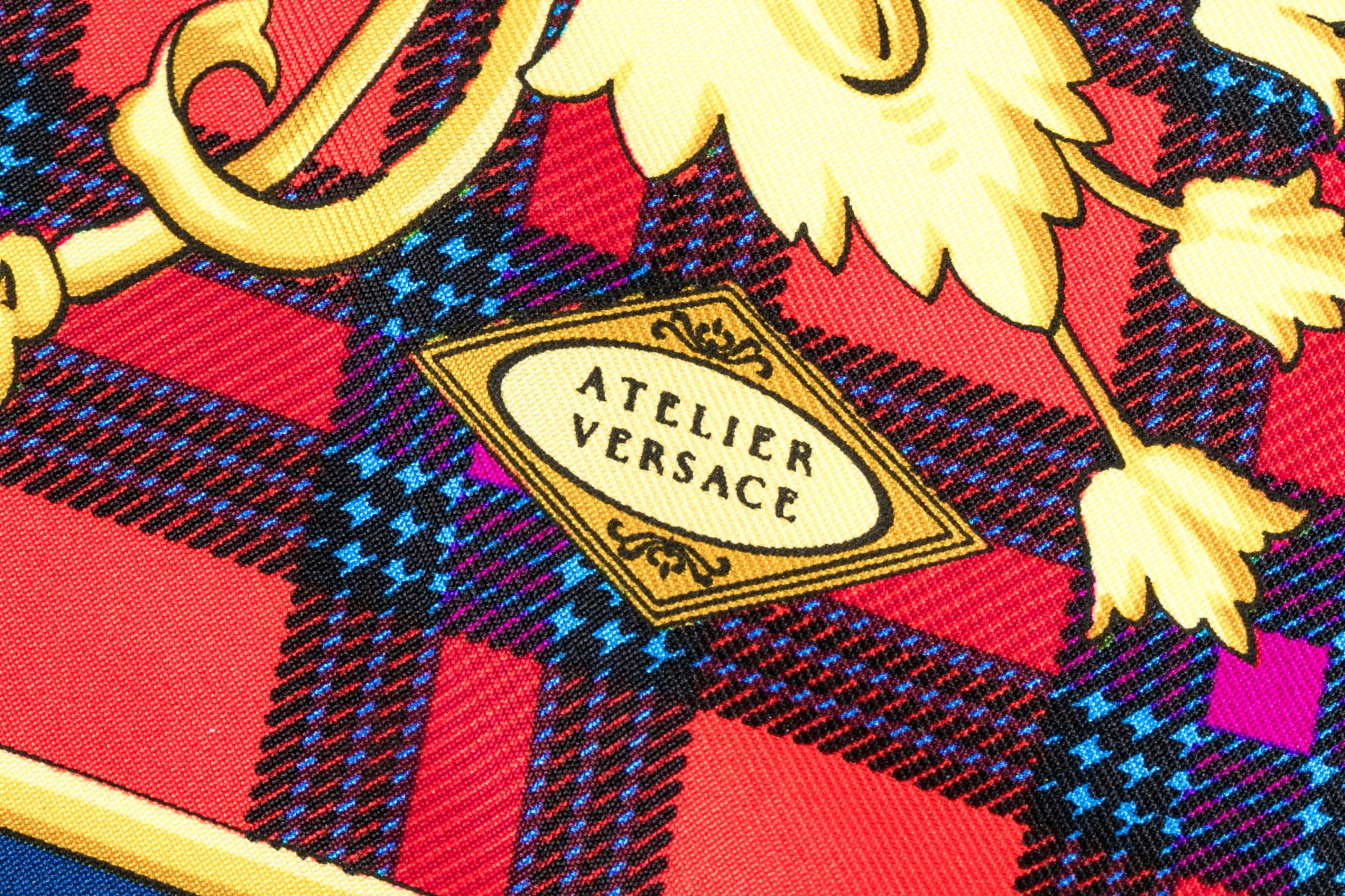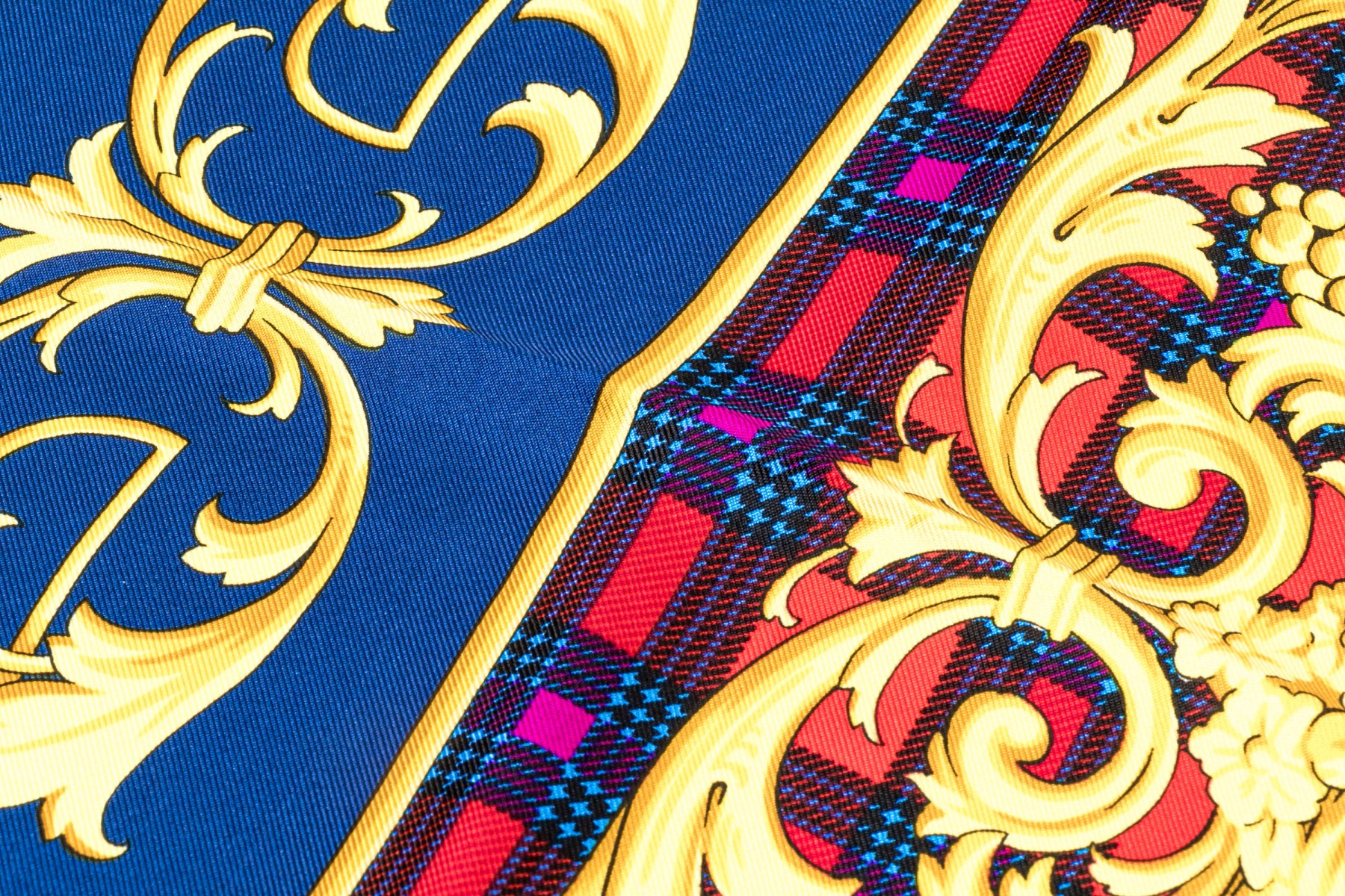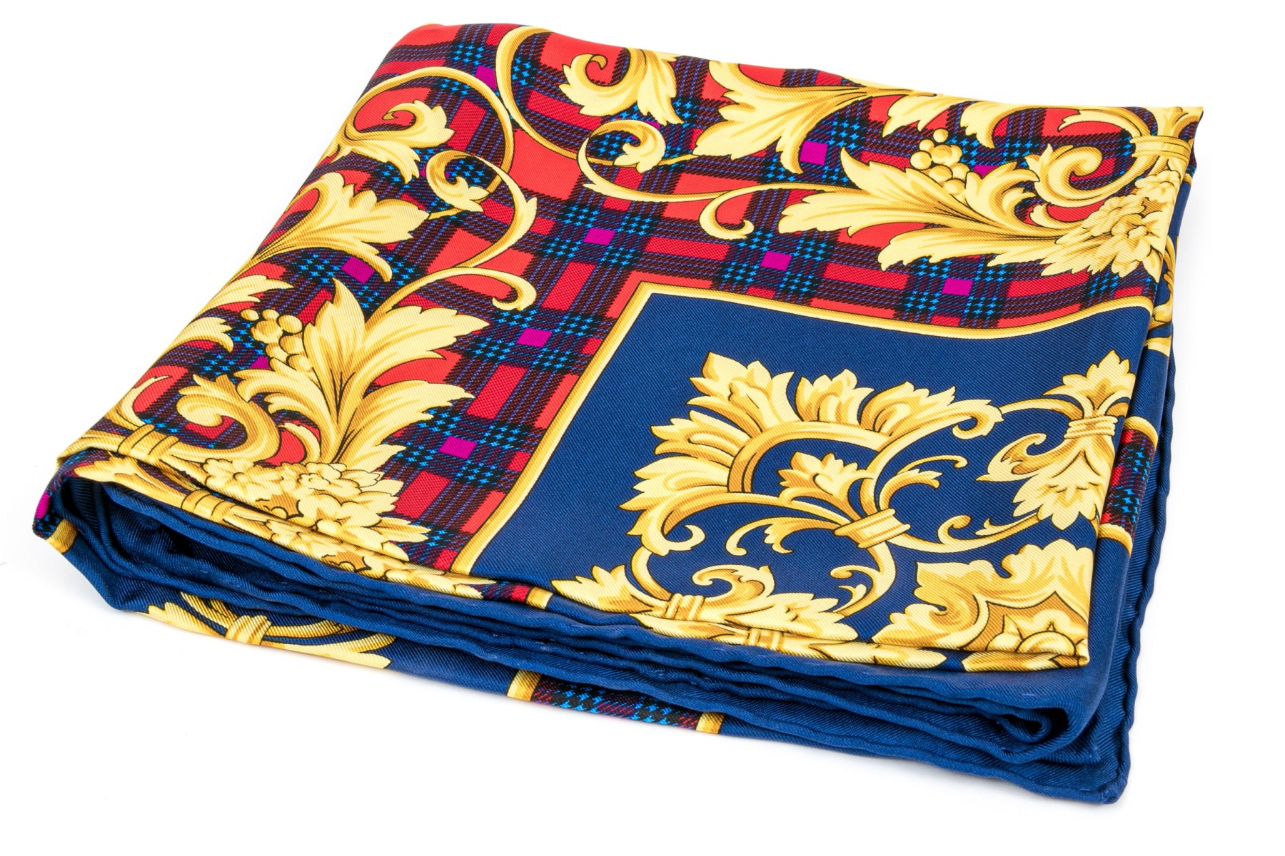 Atelier Versace classic blue red and gold toned vintage silk scarf