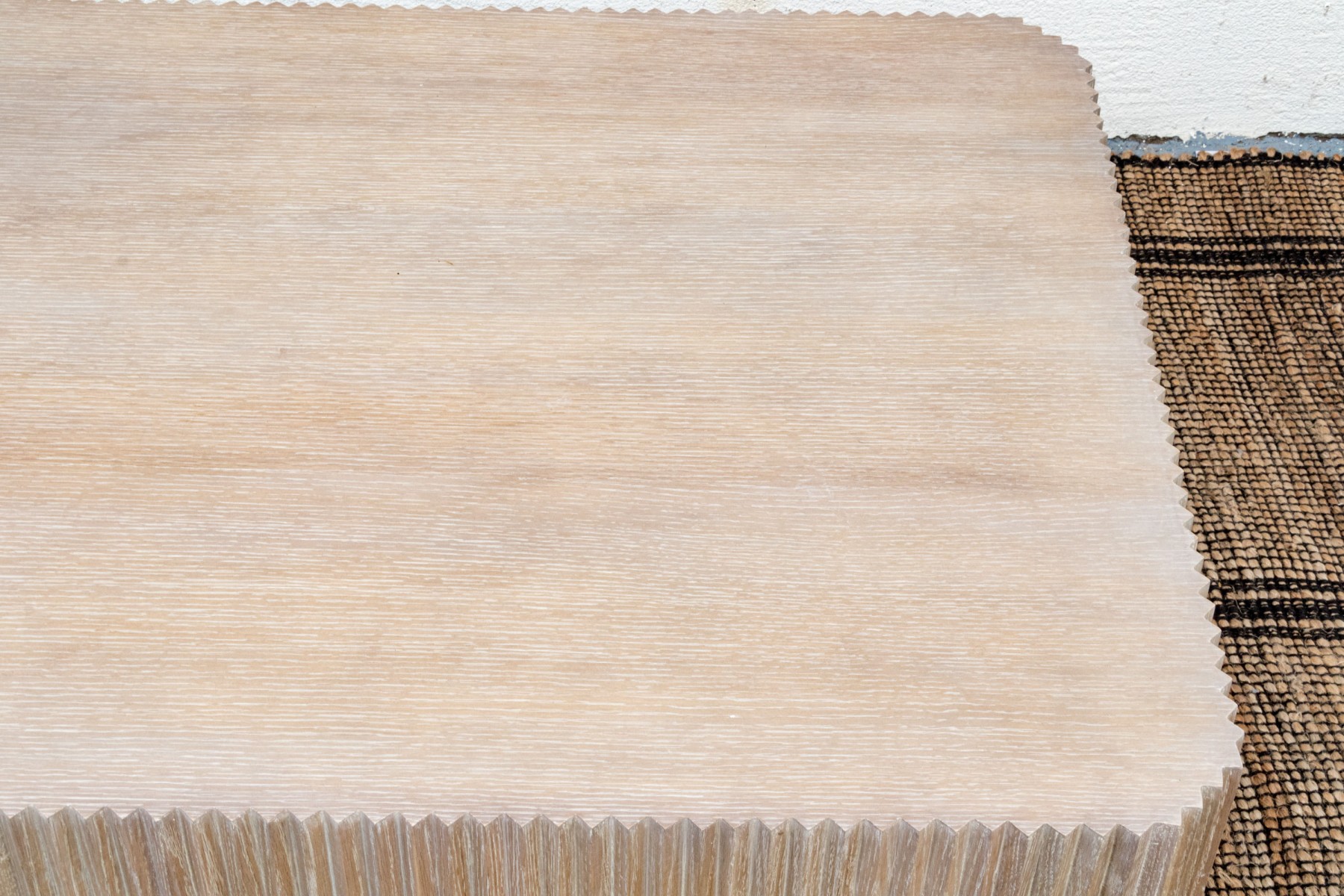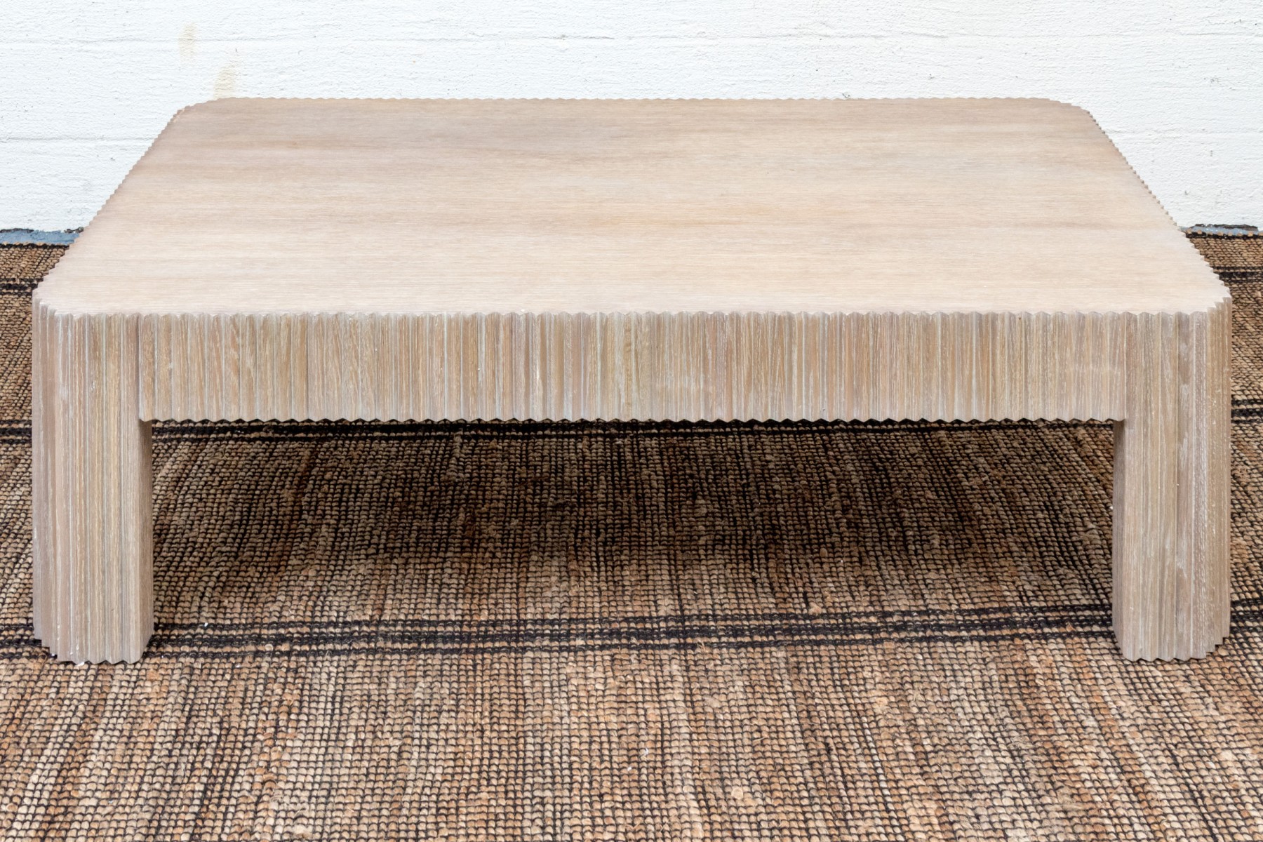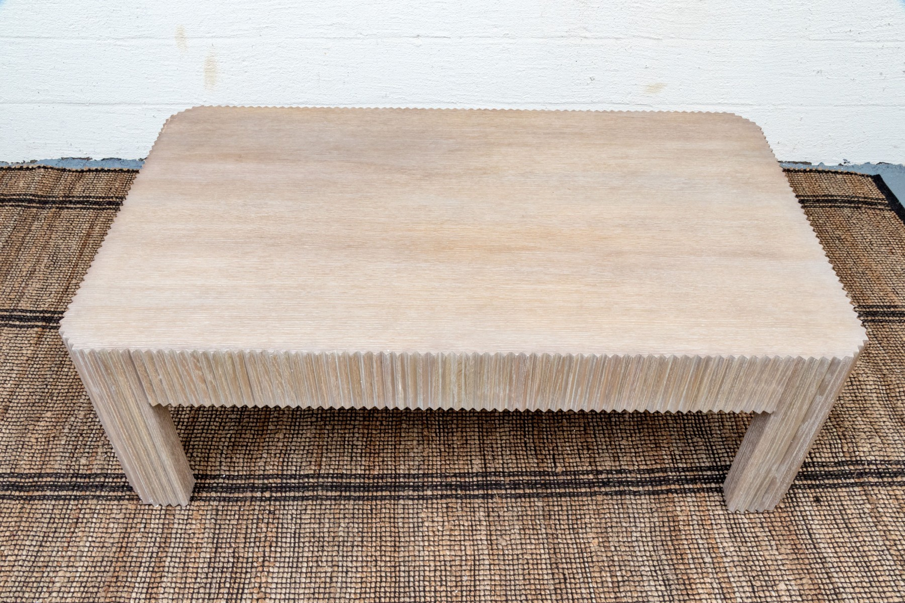 An attractive solid wood coffee table with a rounded rectangular form in ashen light brown with a wonderful naturalistic aesthetic. Detailed with a fluted exterior around the apron and bracket legs.