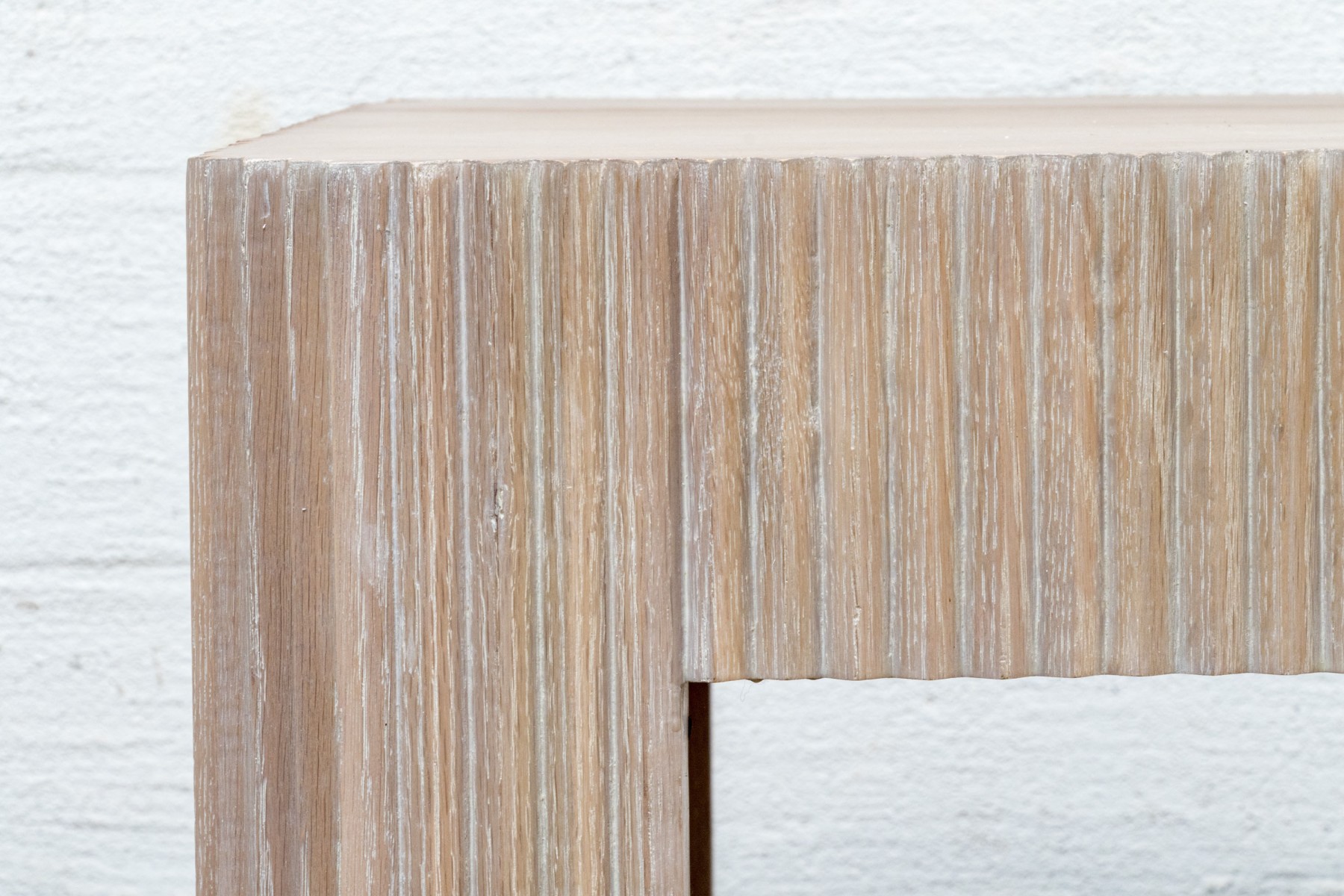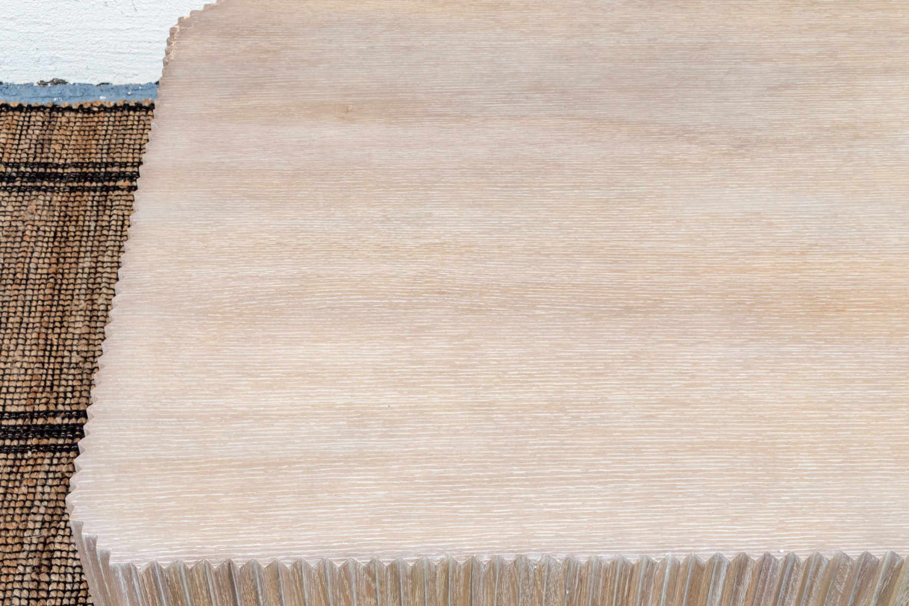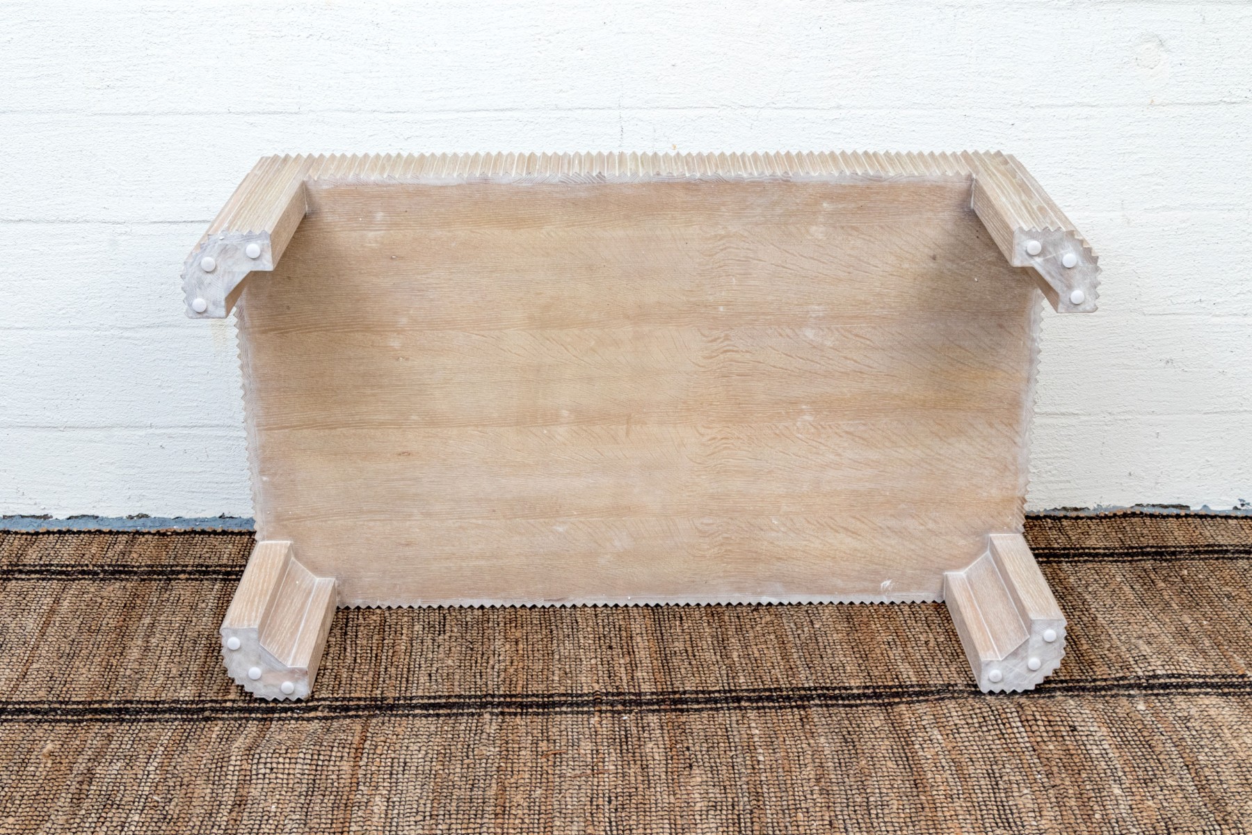 An attractive solid wood coffee table with a rounded rectangular form in ashen light brown with a wonderful naturalistic aesthetic. Detailed with a fluted exterior around the apron and bracket legs.
