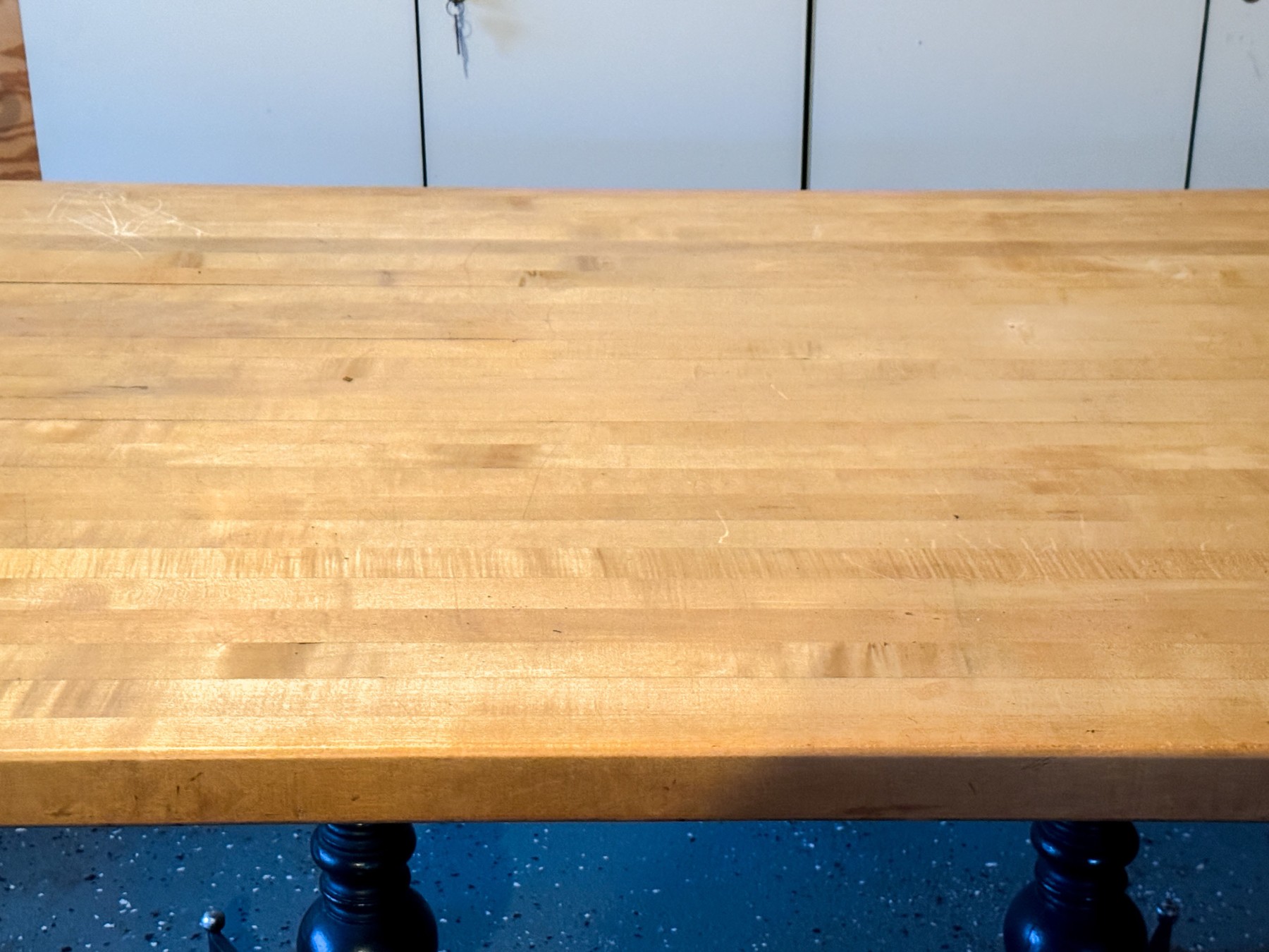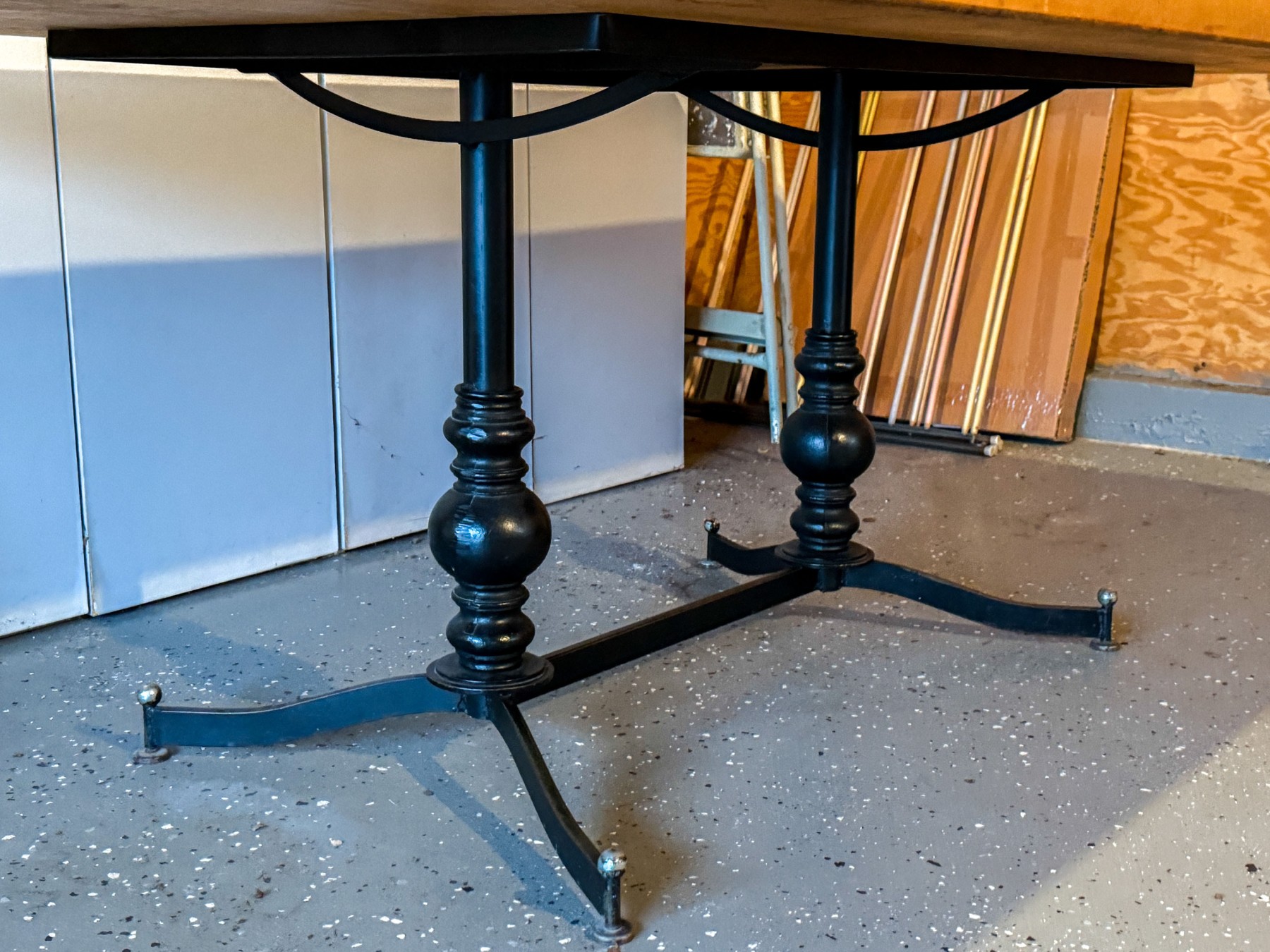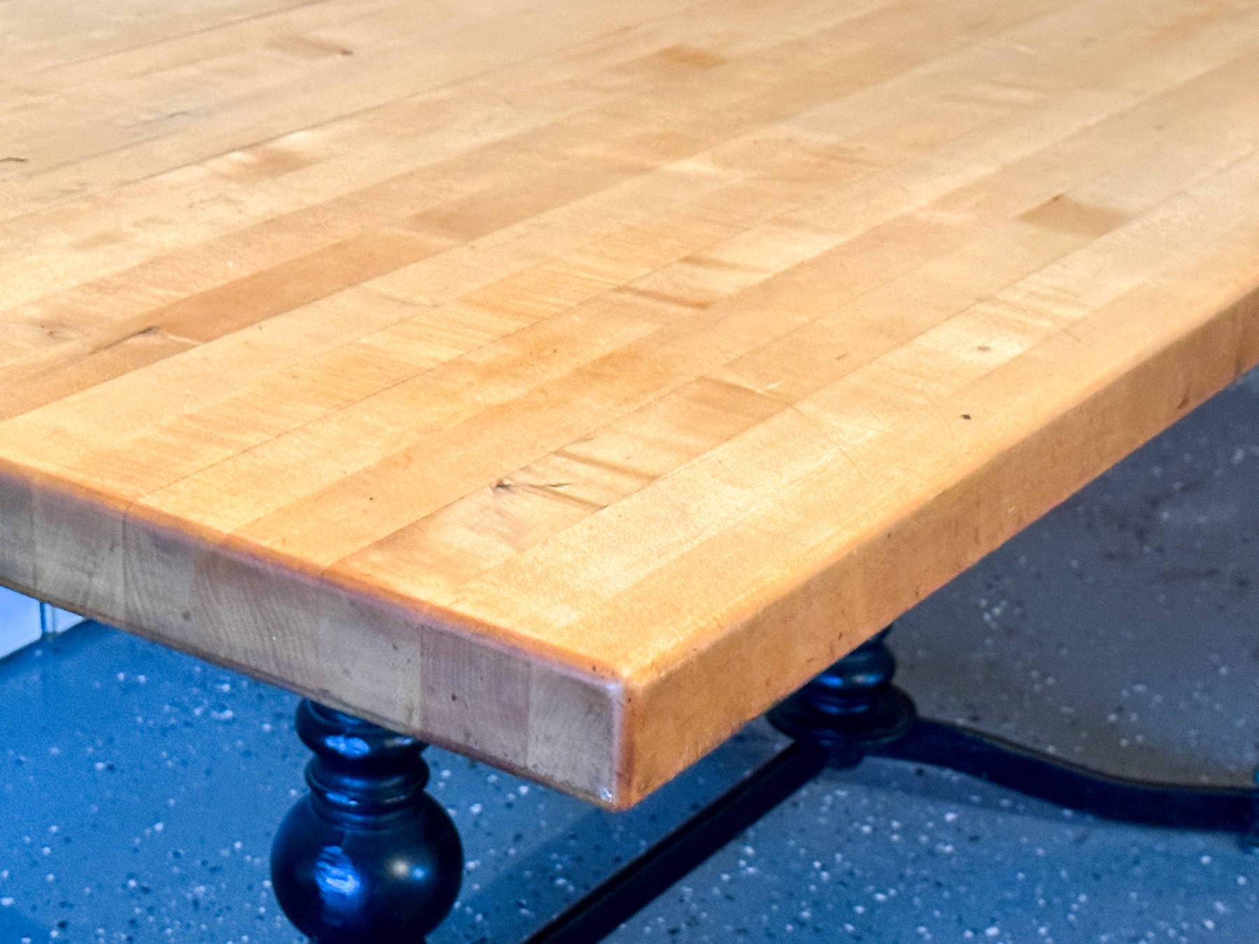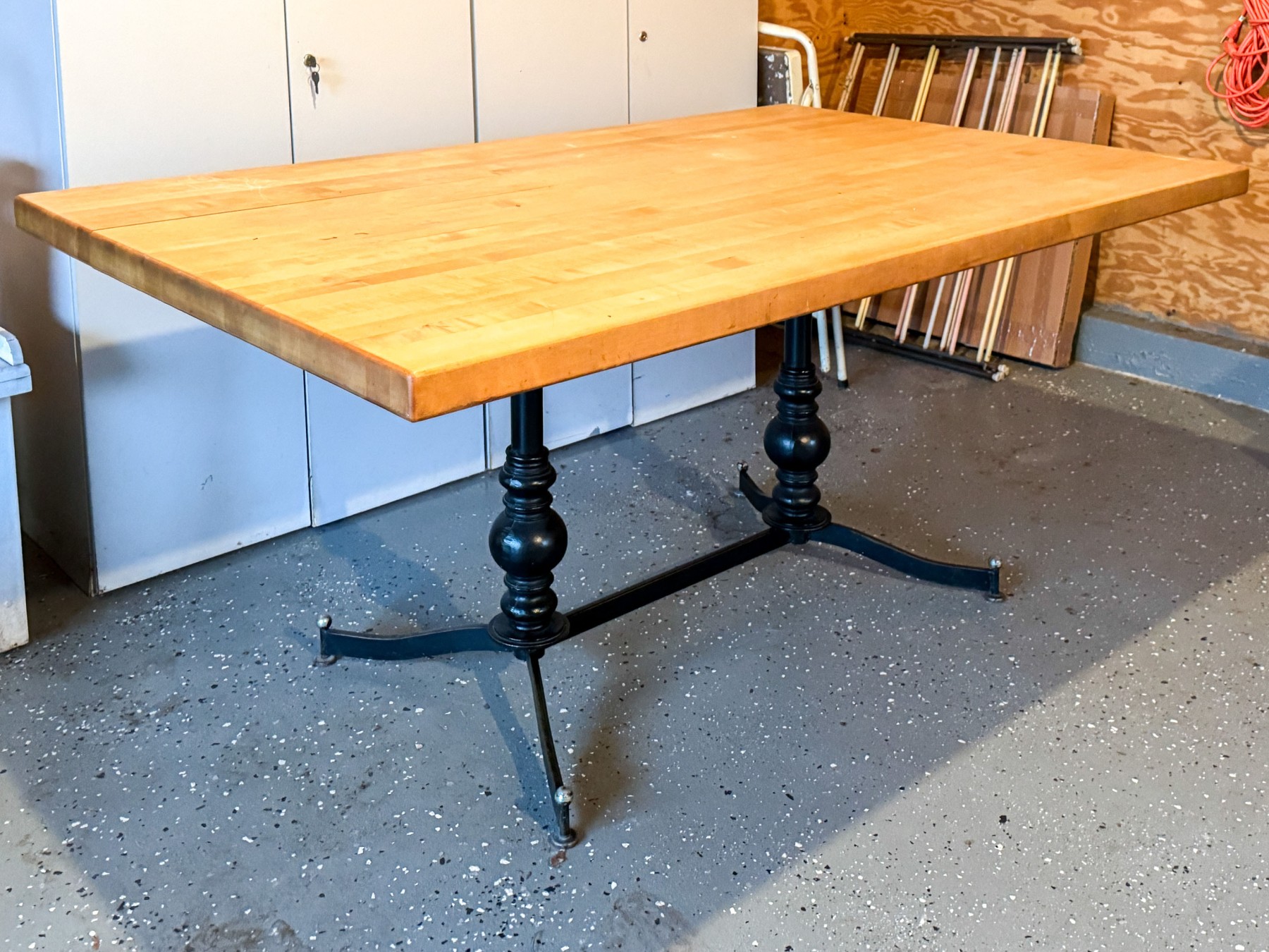 Attractively constructed with a heavy, durable iron frame with four legs and trestle form base. The impressive frame supports an equally impressive butcher block table top.