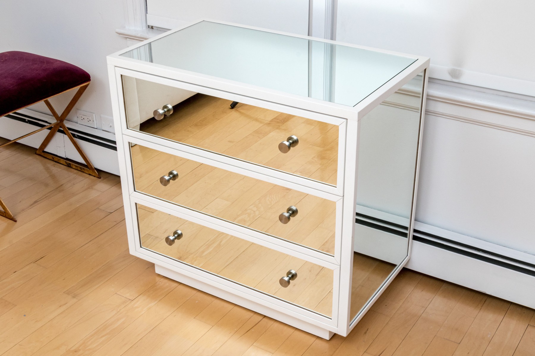 An attractive Vanguard Furniture mirror and white lacquer, three drawer chest.