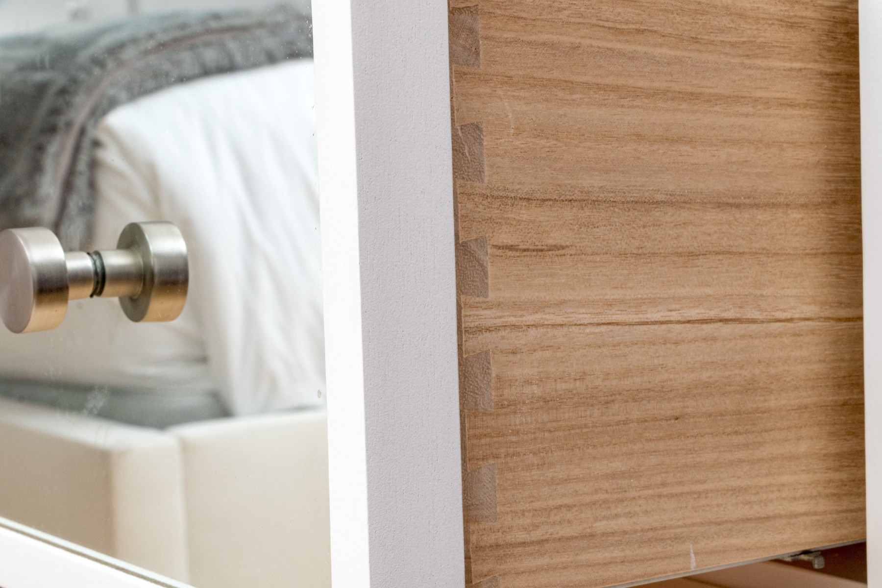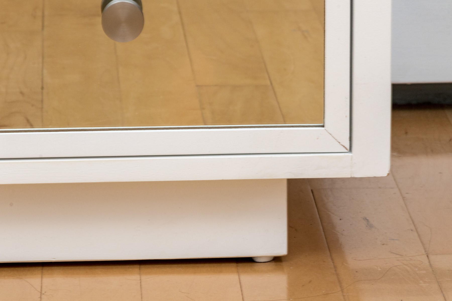 The mirrored drawers open with modern disc pulls, on stepped back plinth base.