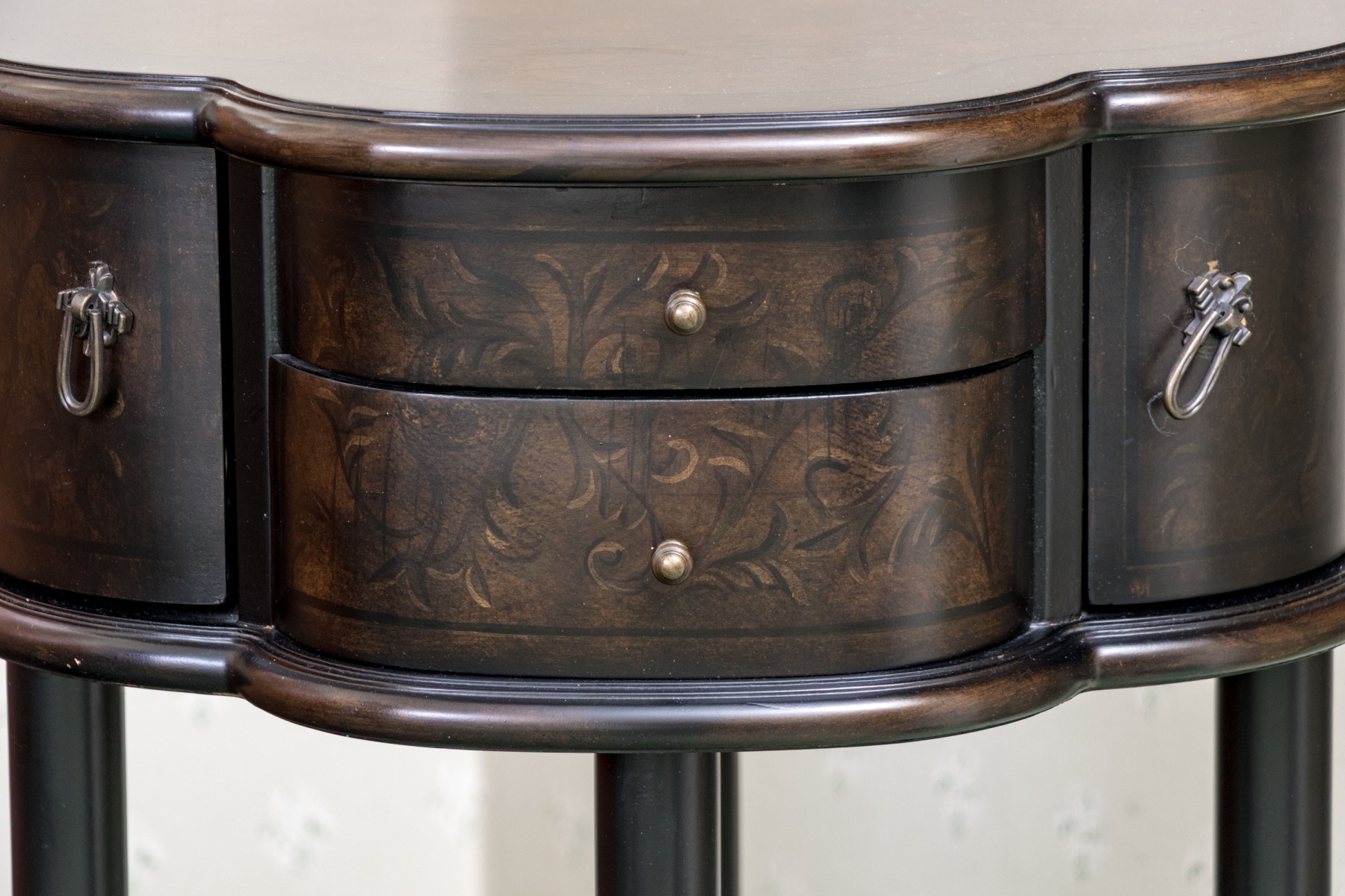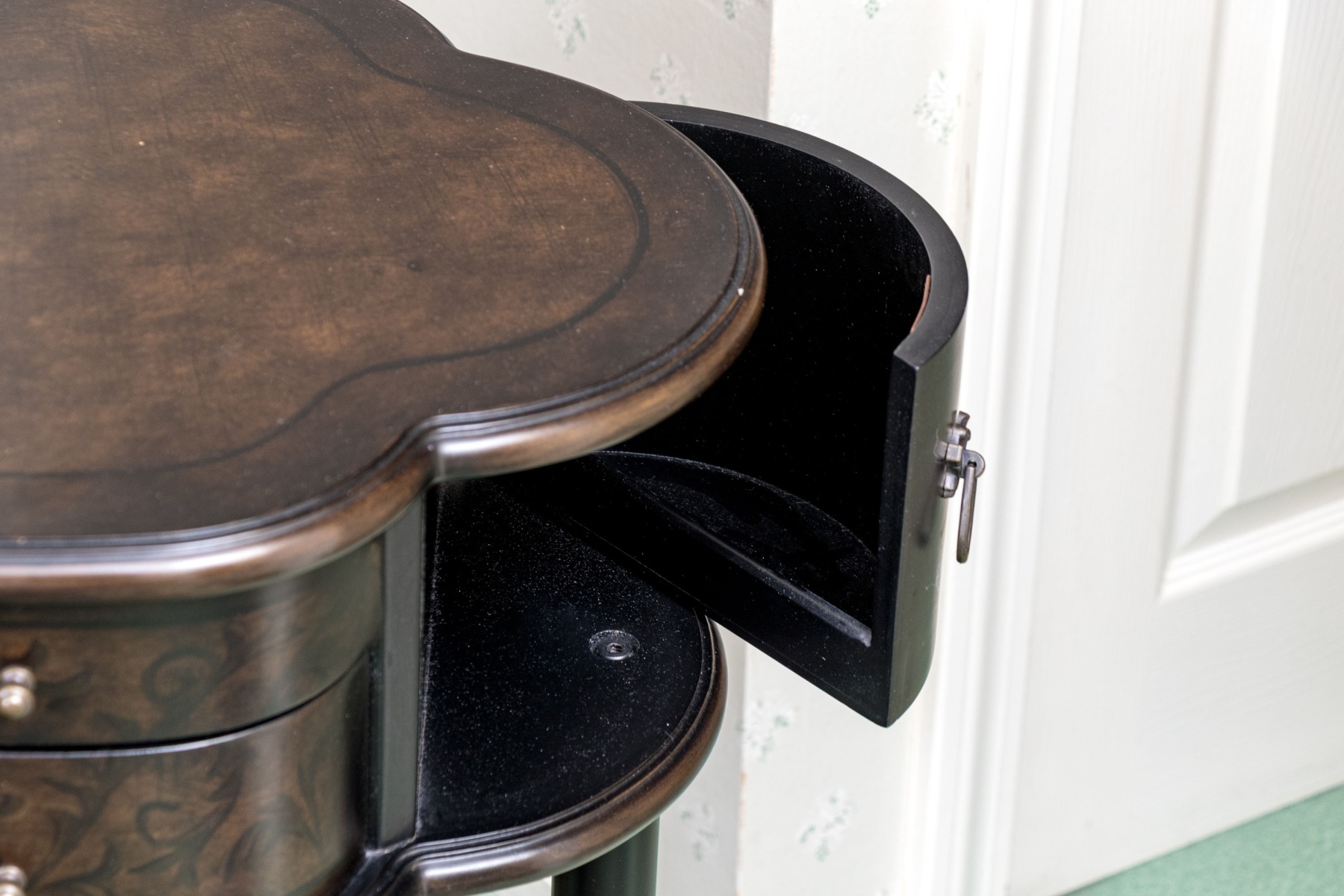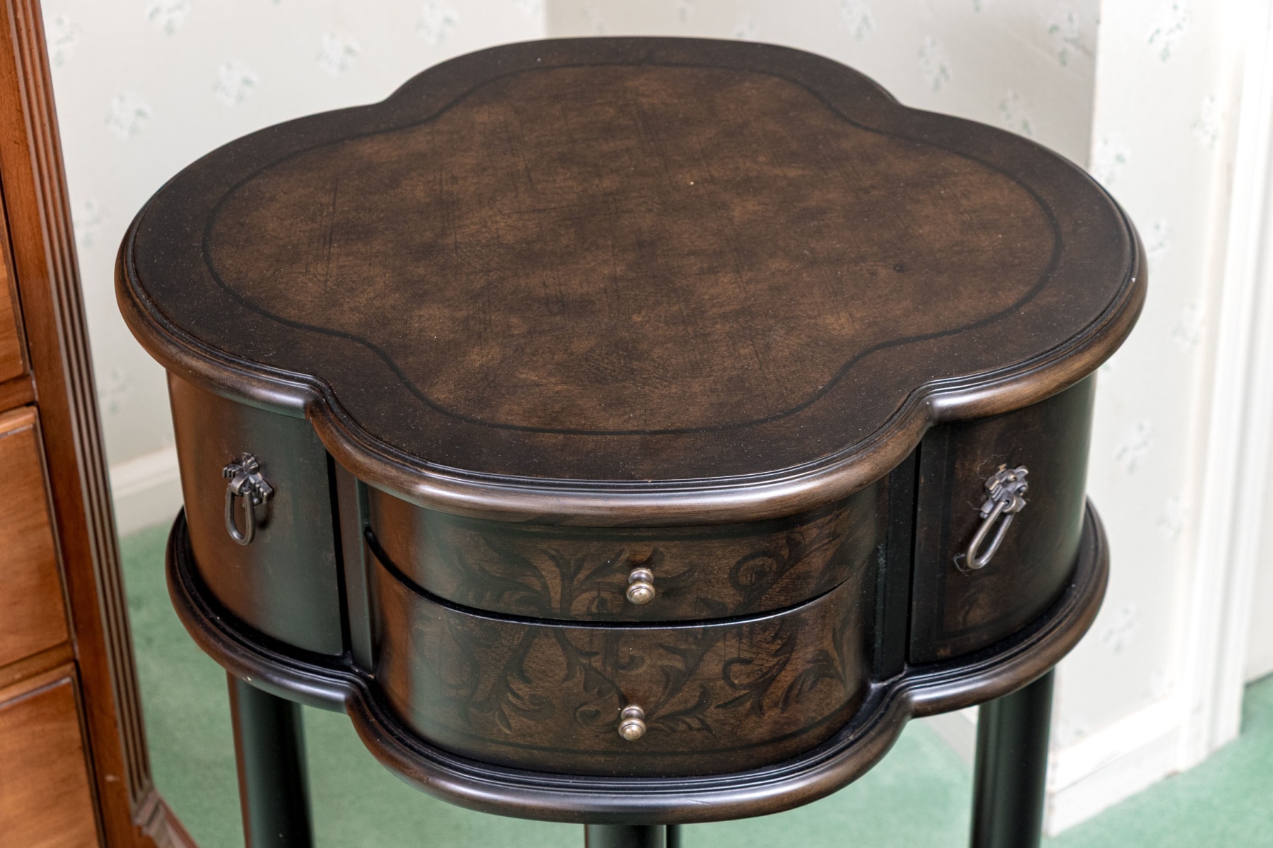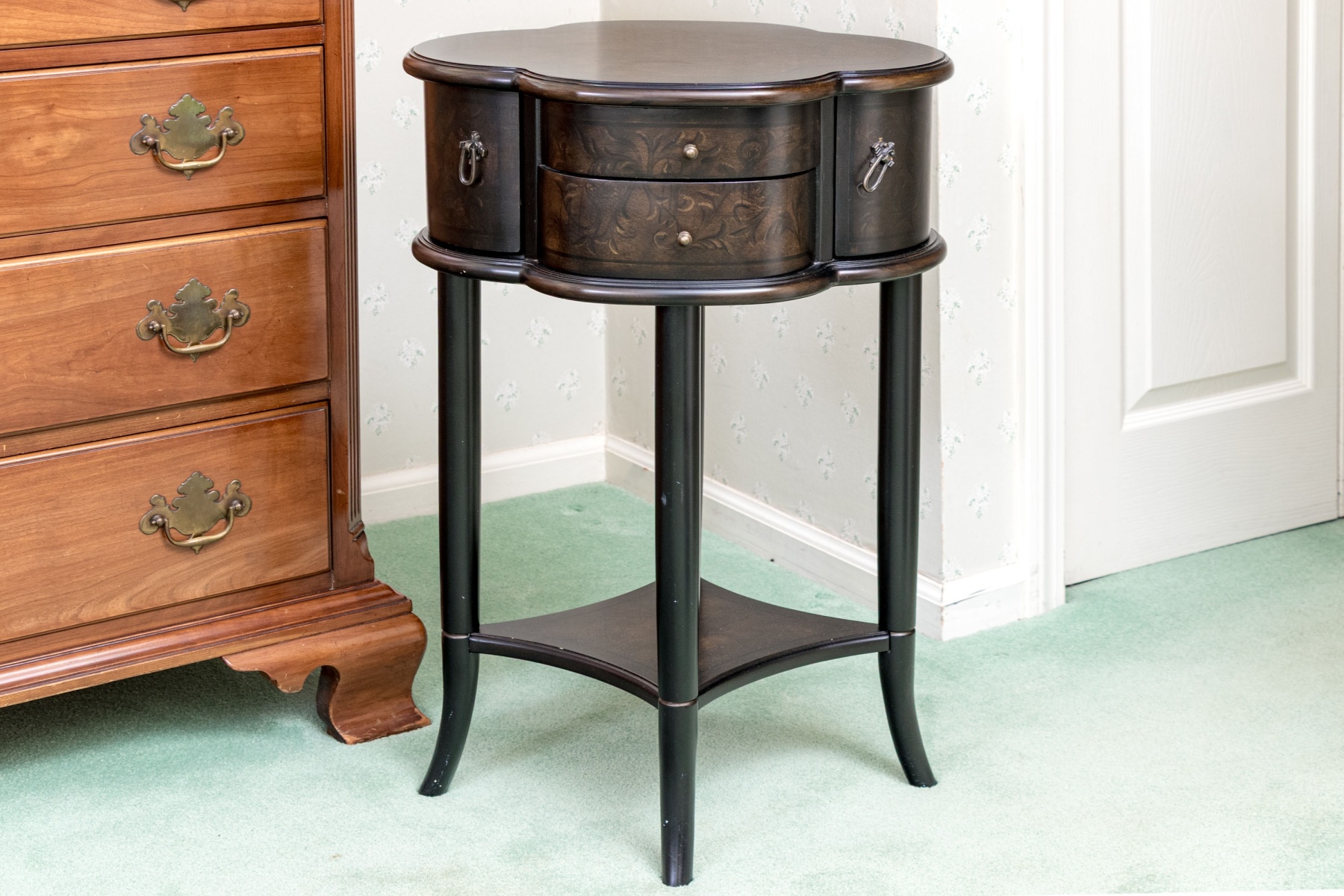 A high quality accent table, likely Bombay, standing on four carved and ebonized legs that flare out at the feet, below the lower shelf which doubles as stretcher support. Rising upwards the table with quatrefoil form case with central bay of two drawers, with small gilt finished pulls, flanked by curved cabinet doors opening to space on each end.