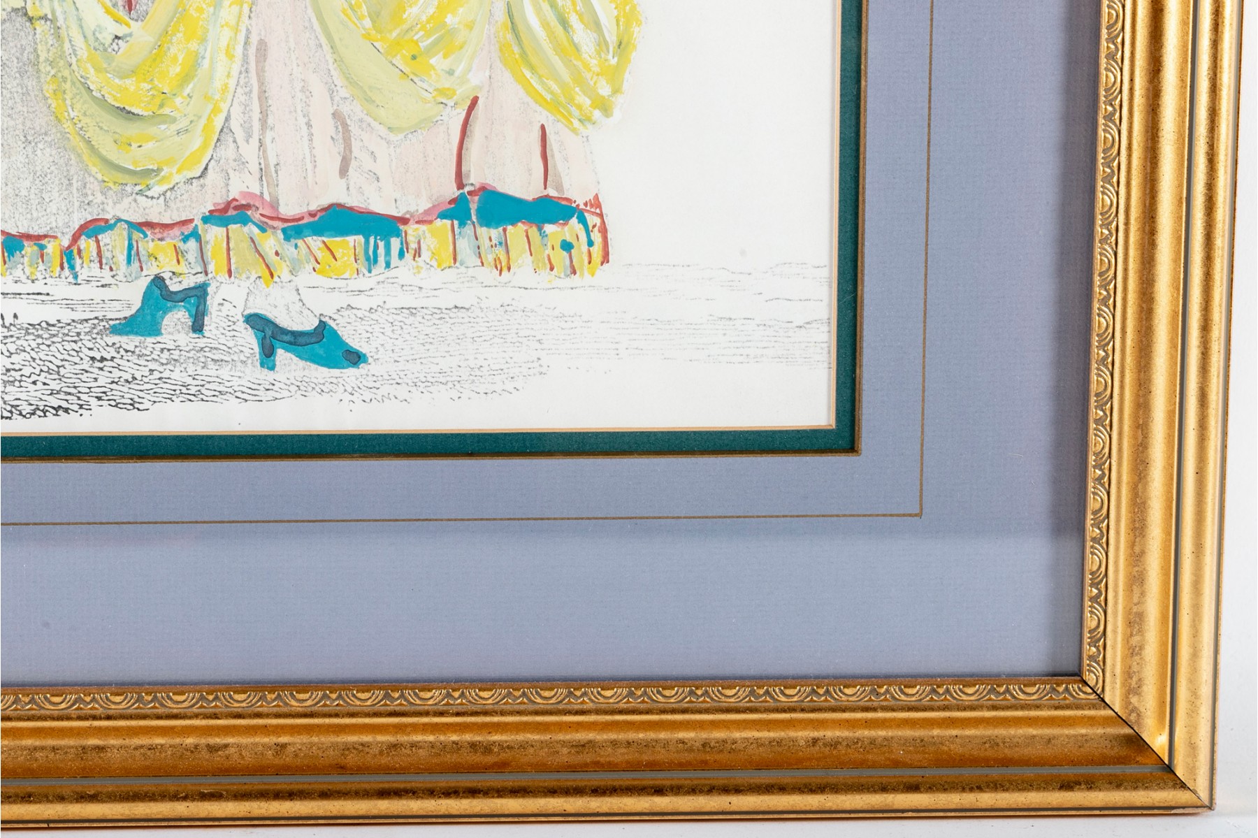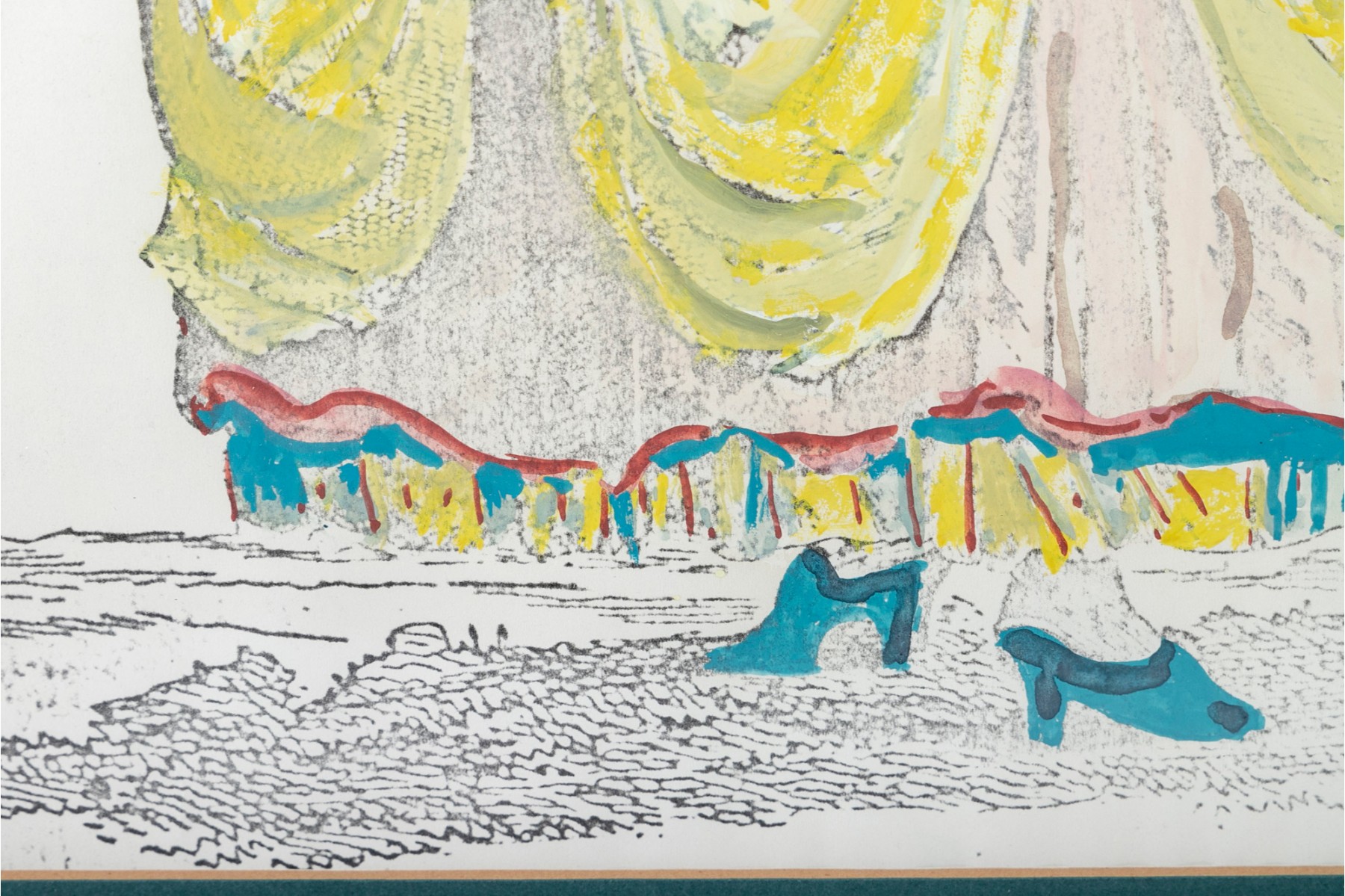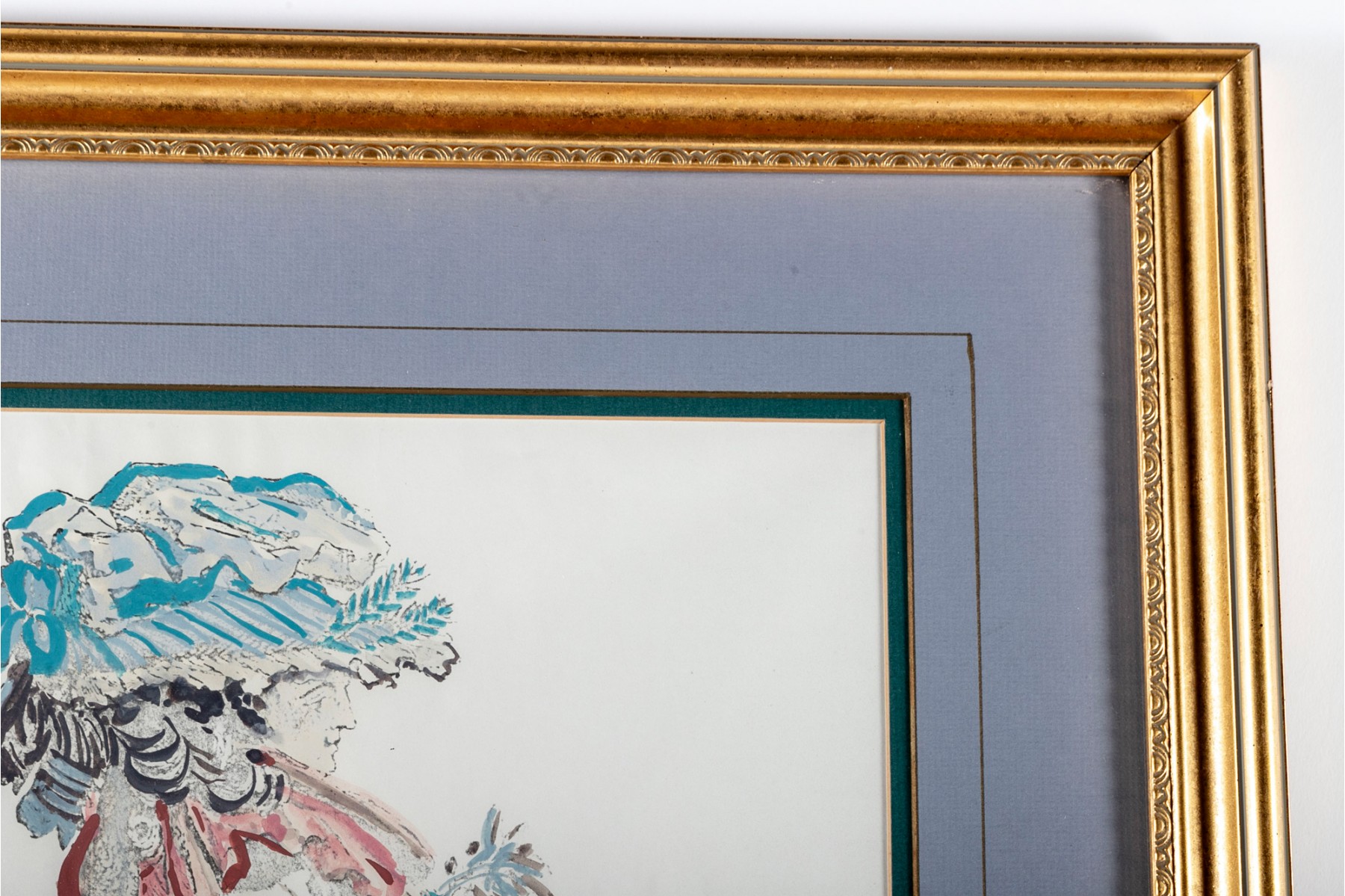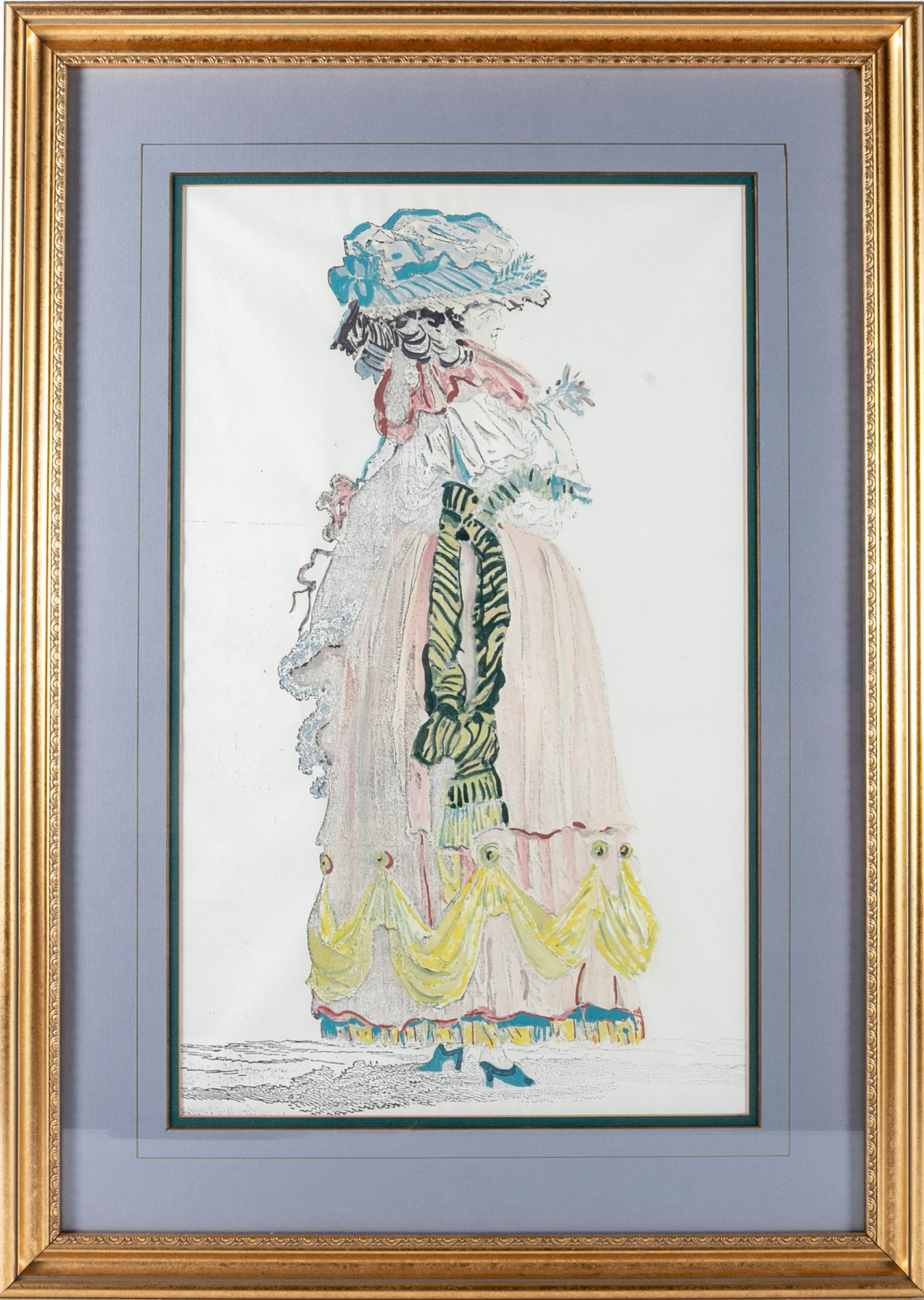 Attributed to Harrington "Tony" Putam Jr. (American [NC], 1933-1990) a fun and whimsical fashion plate of a woman wearing a large and layered dress, hand-painted in vibrant patterned hues of blue, pink, and yellow. The woman stands in profile, donning a large bonnet-like hat, with a striped sash or scarf over a floor-length bell-shaped skirt with pleats and drapes for wonderful texture. Displayed behind glass with tiered purple and blue mats in a gilt frame with an inner border of subtle relief.