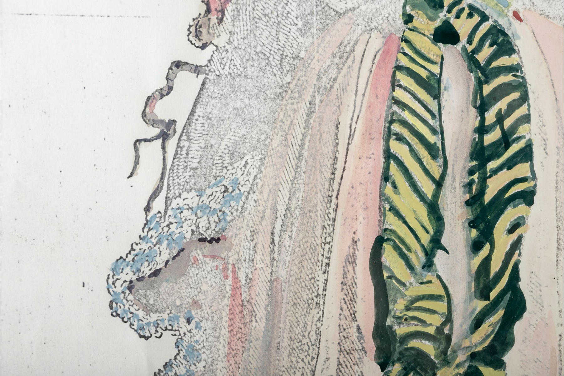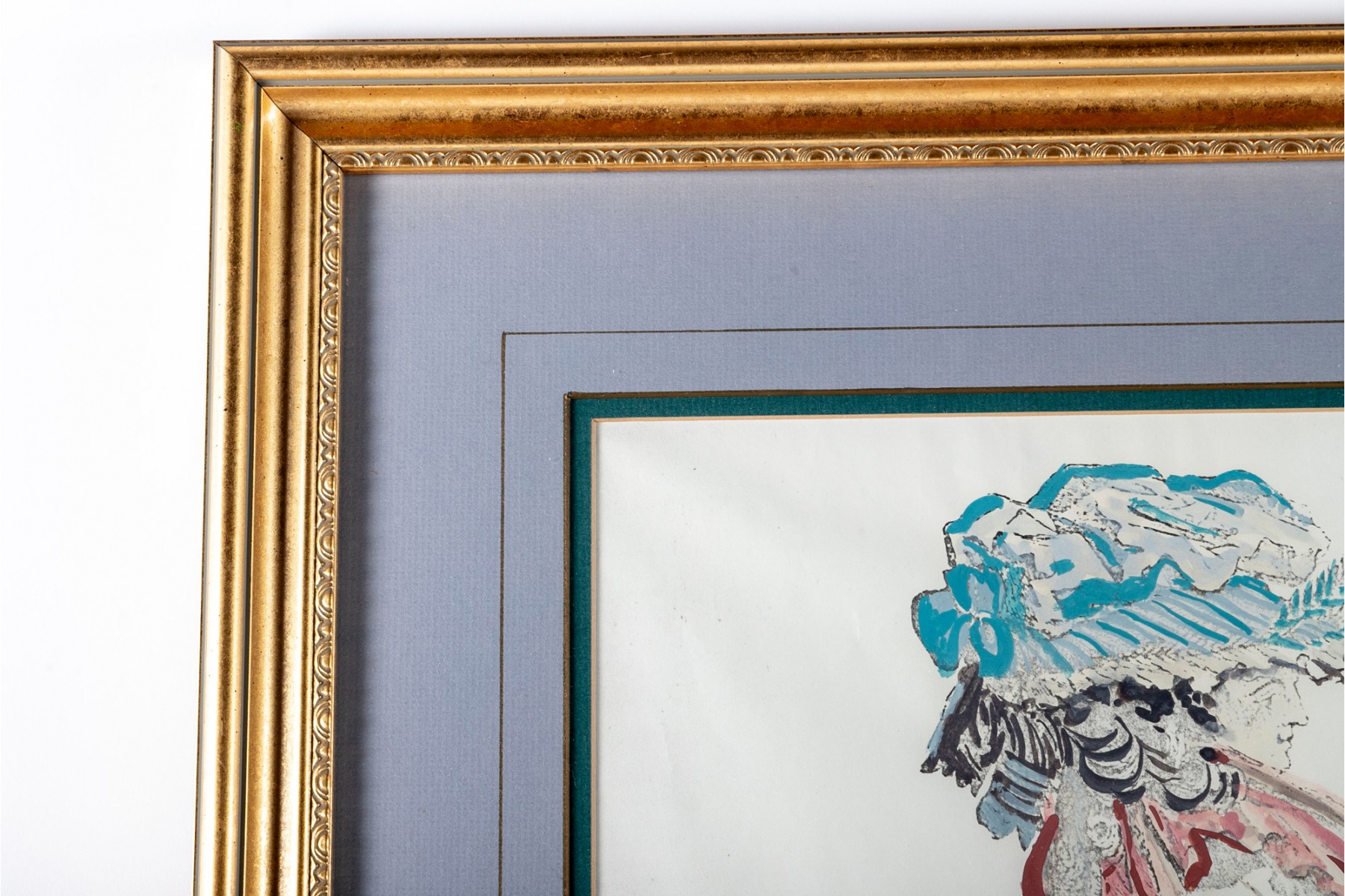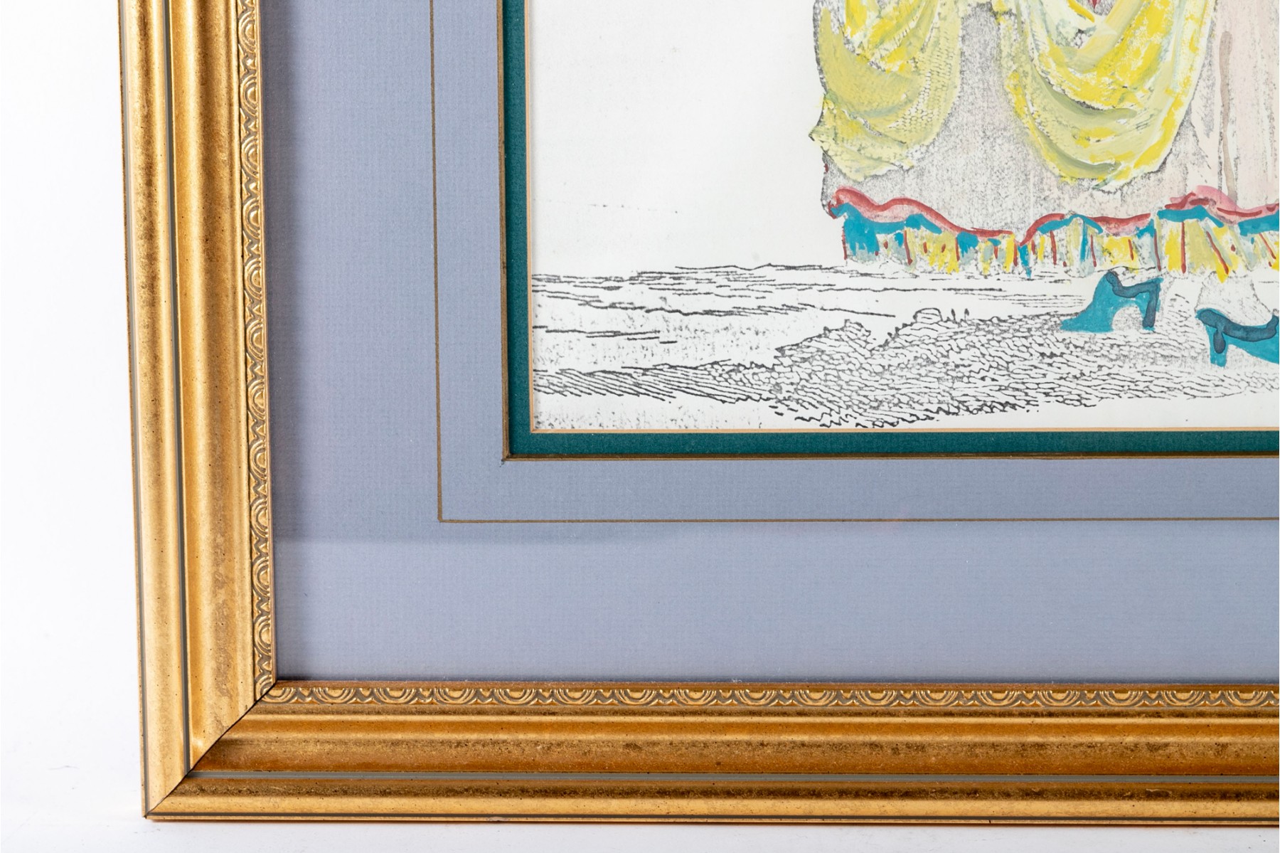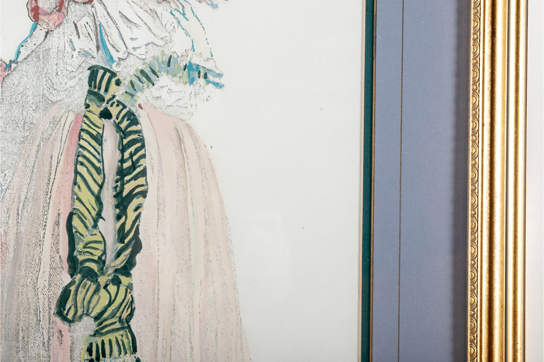 Attributed to Harrington "Tony" Putam Jr. (American [NC], 1933-1990) a fun and whimsical fashion plate of a woman wearing a large and layered dress, hand-painted in vibrant patterned hues of blue, pink, and yellow. The woman stands in profile, donning a large bonnet-like hat, with a striped sash or scarf over a floor-length bell-shaped skirt with pleats and drapes for wonderful texture. Displayed behind glass with tiered purple and blue mats in a gilt frame with an inner border of subtle relief.