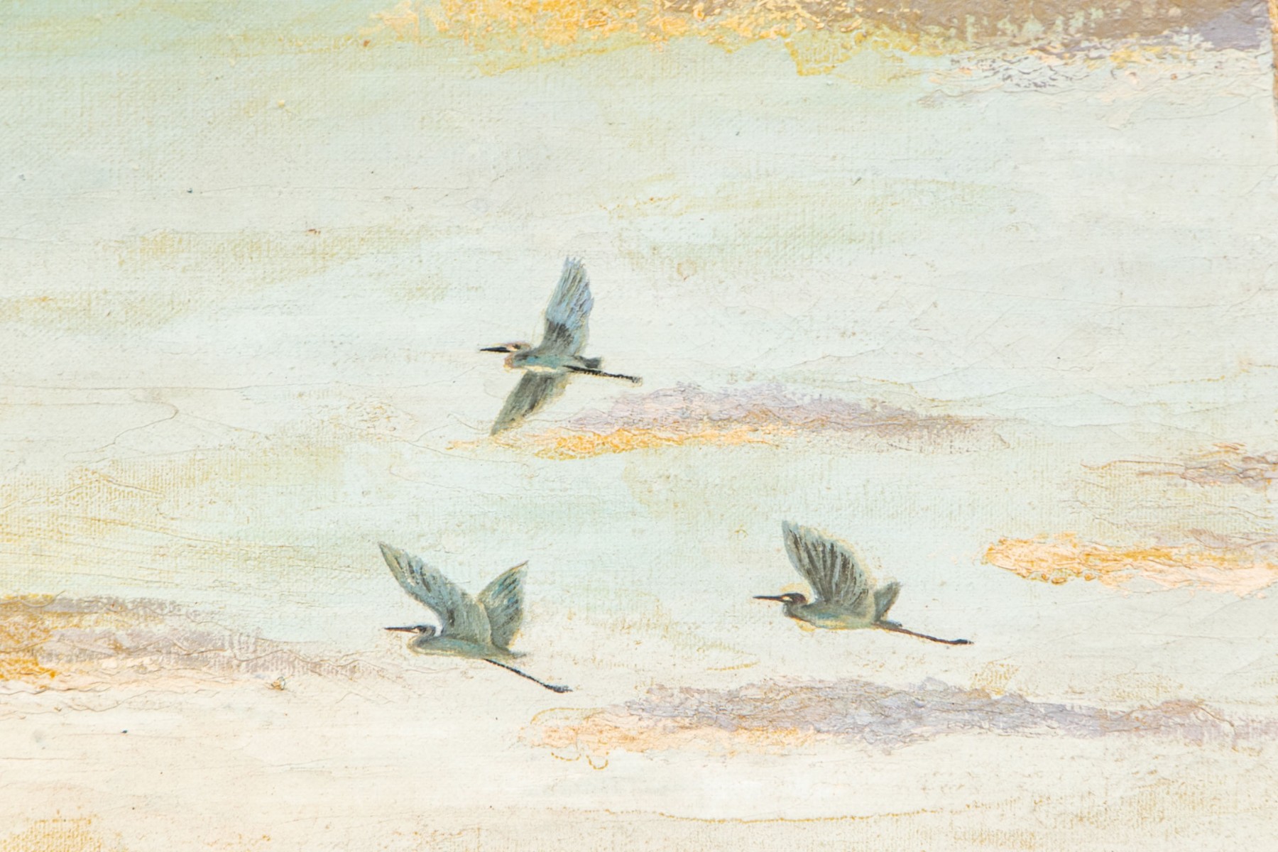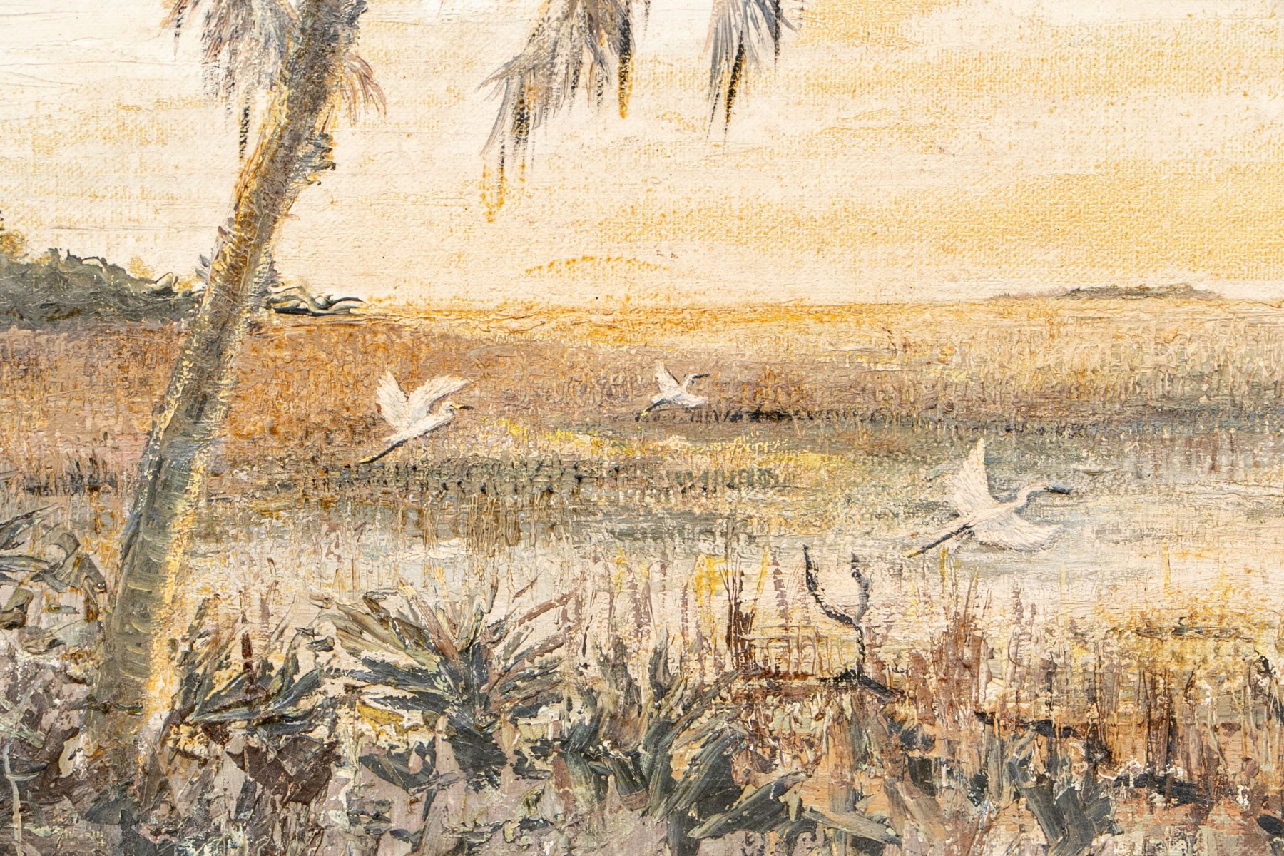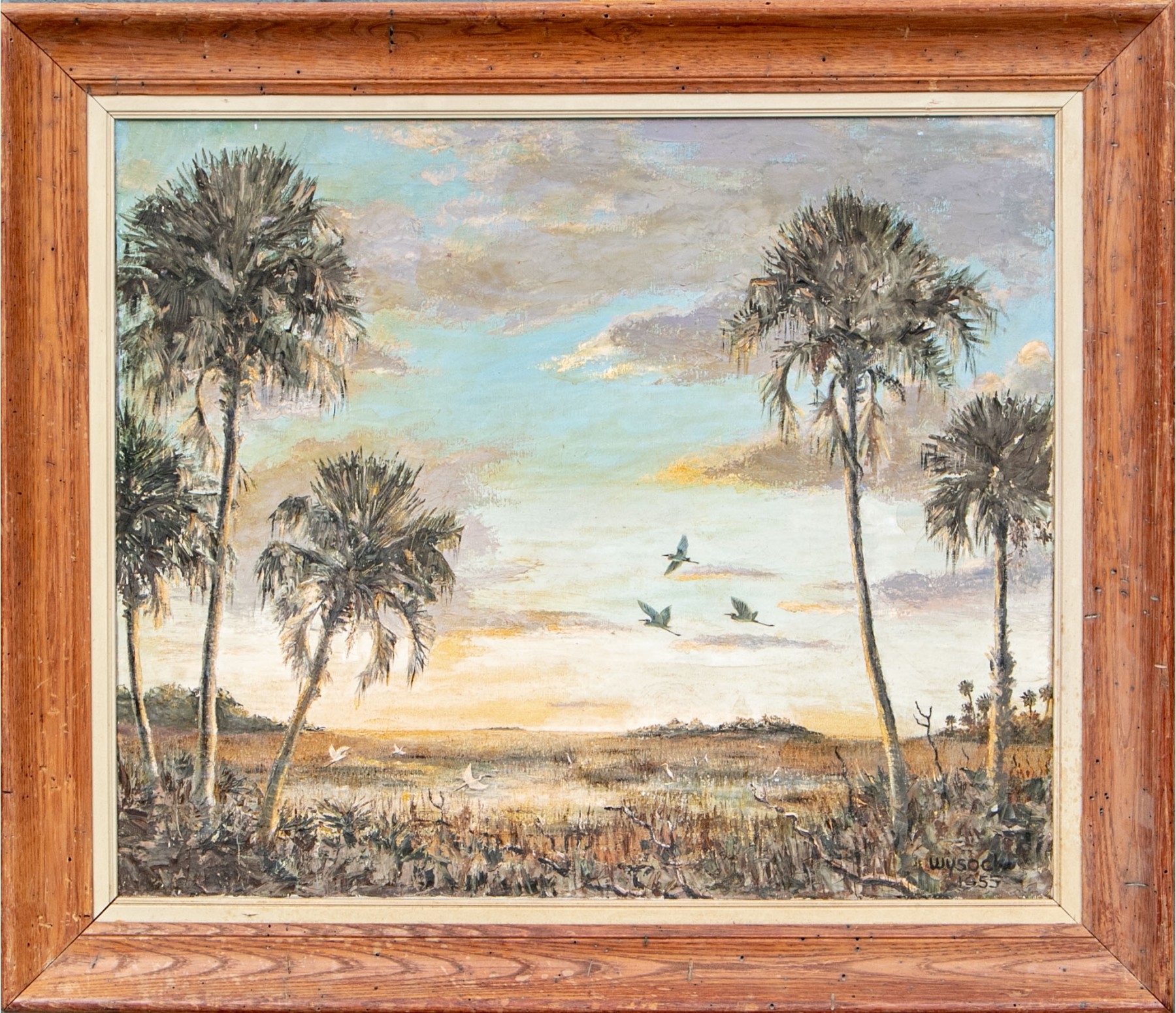 Signed and dated 1955 lower right. A marsh landscape with palm trees and egrets at dusk.