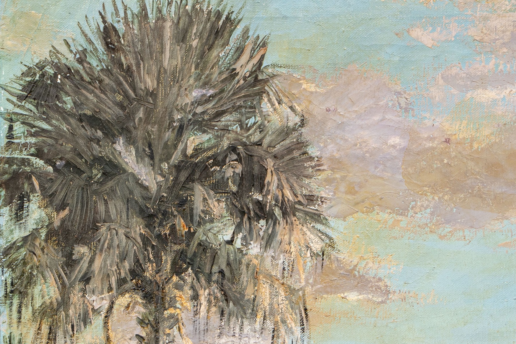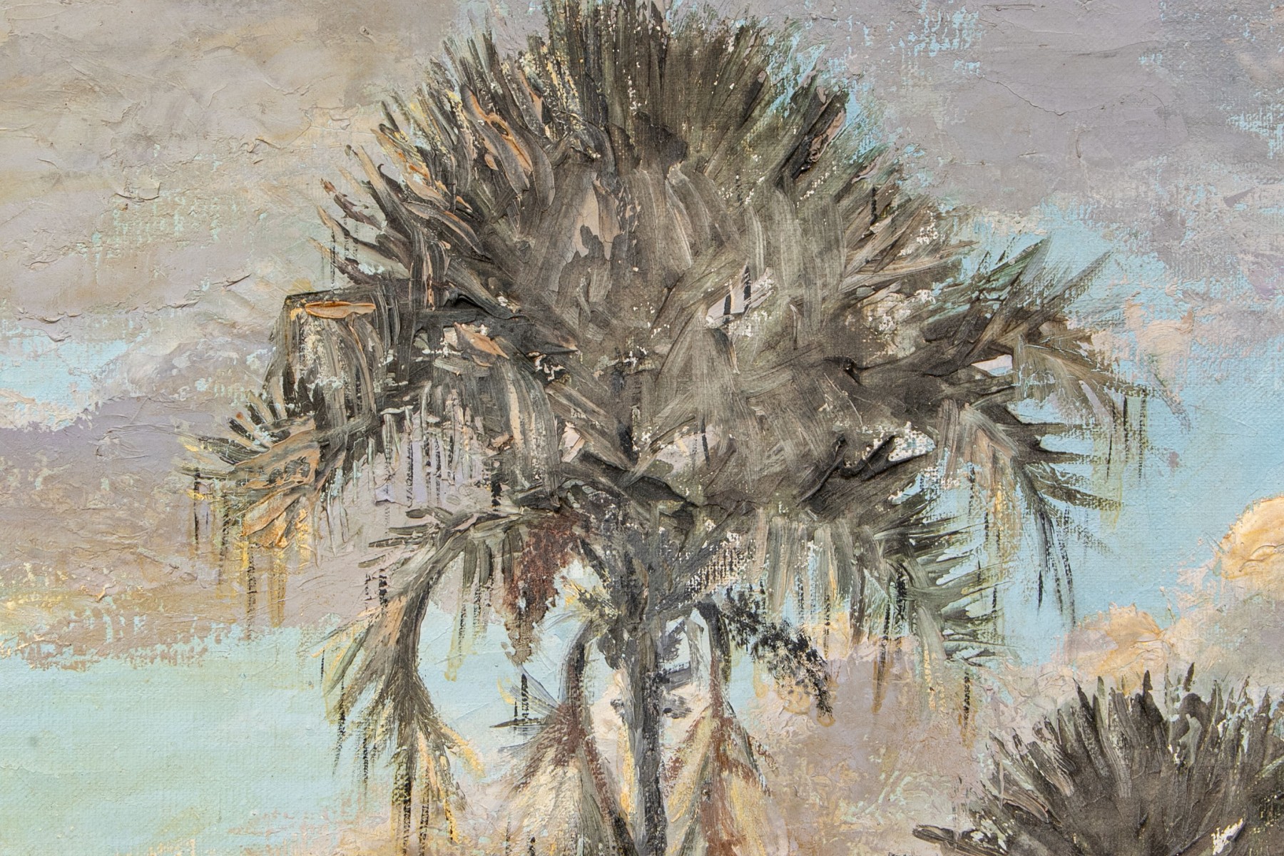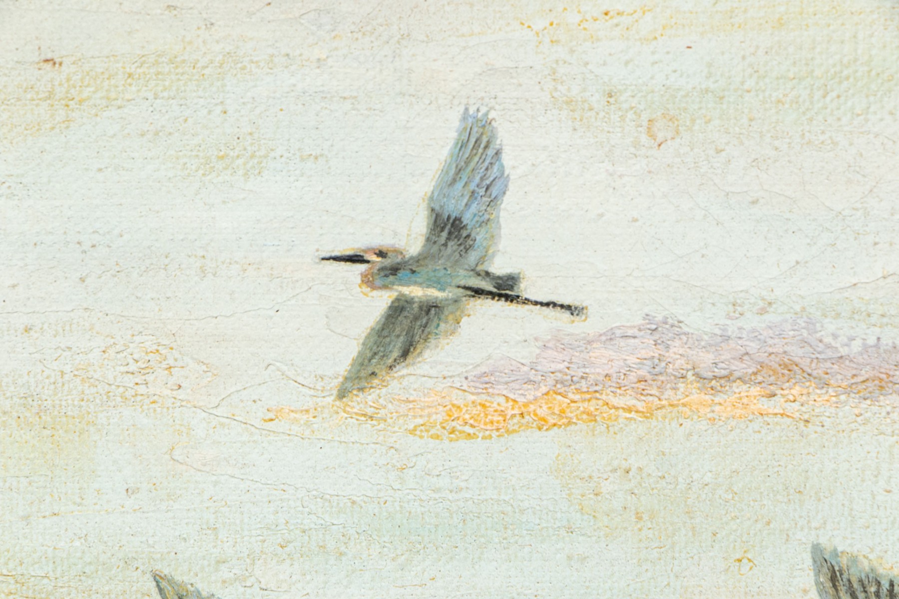 Signed and dated 1955 lower right. A marsh landscape with palm trees and egrets at dusk.