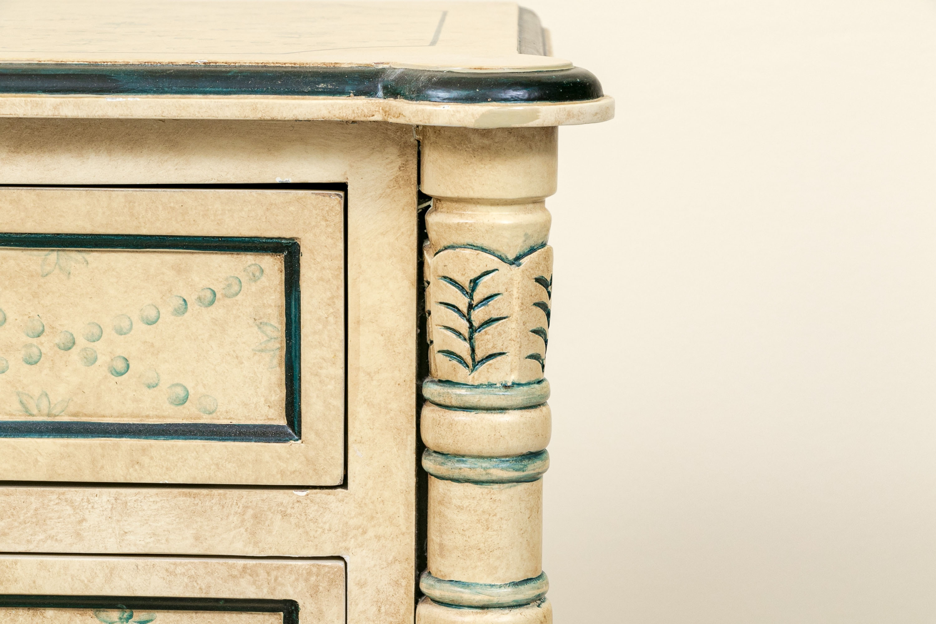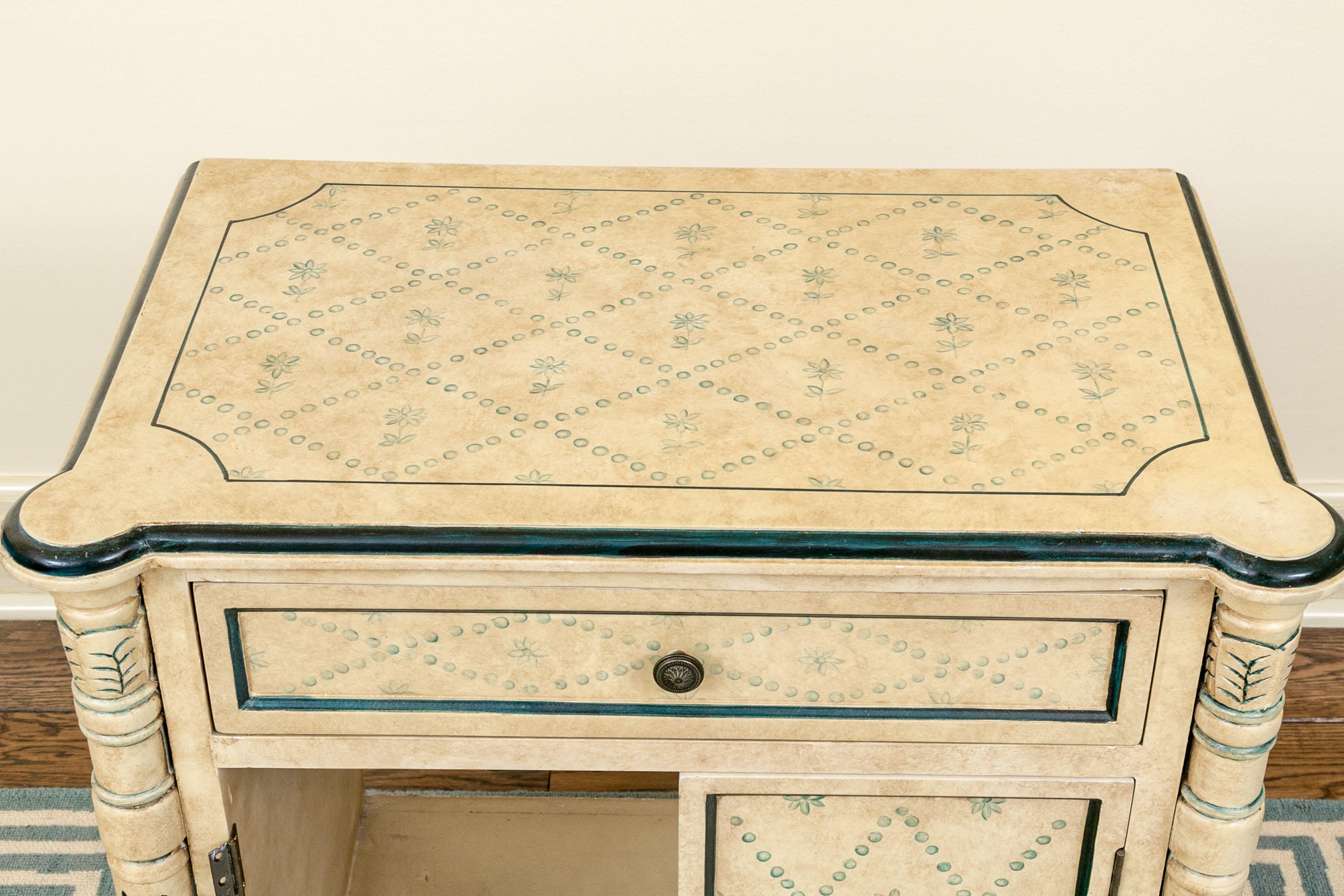 With carved and painted column form front legs with pair of hinged doors below a shelf.