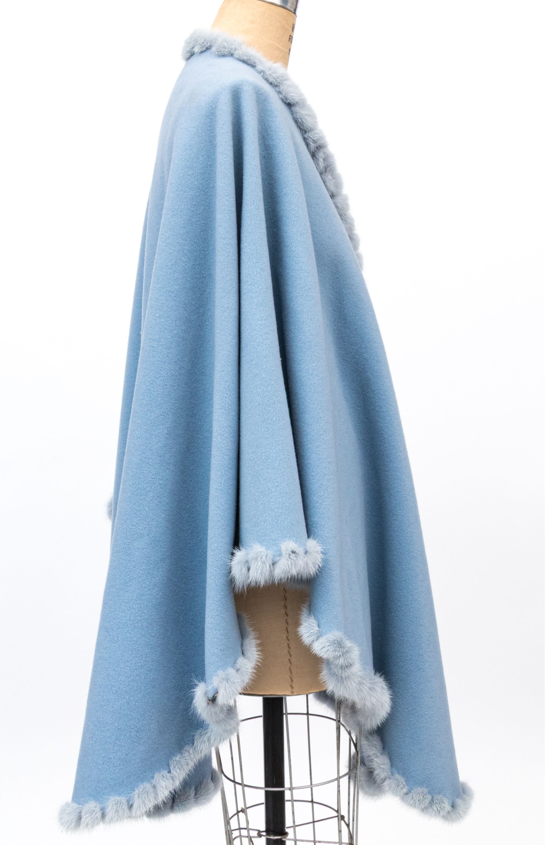 The cape features a flowy, draped silhouette that falls loosely over the shoulders and body. The open-front style makes it easy to slip on and off, with a relaxed, unstructured fit. The main body is a wool/cashmere-blend fabric.
