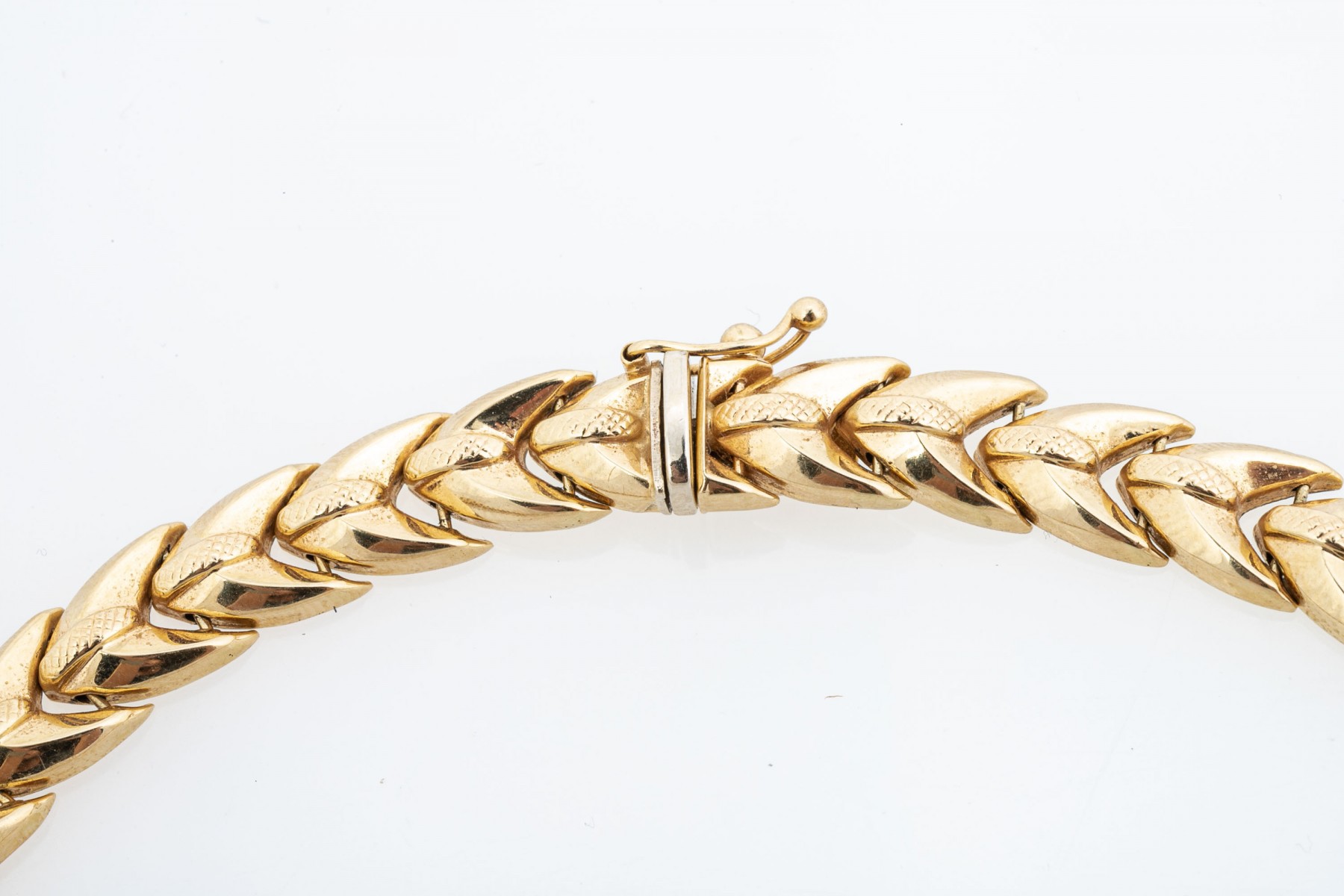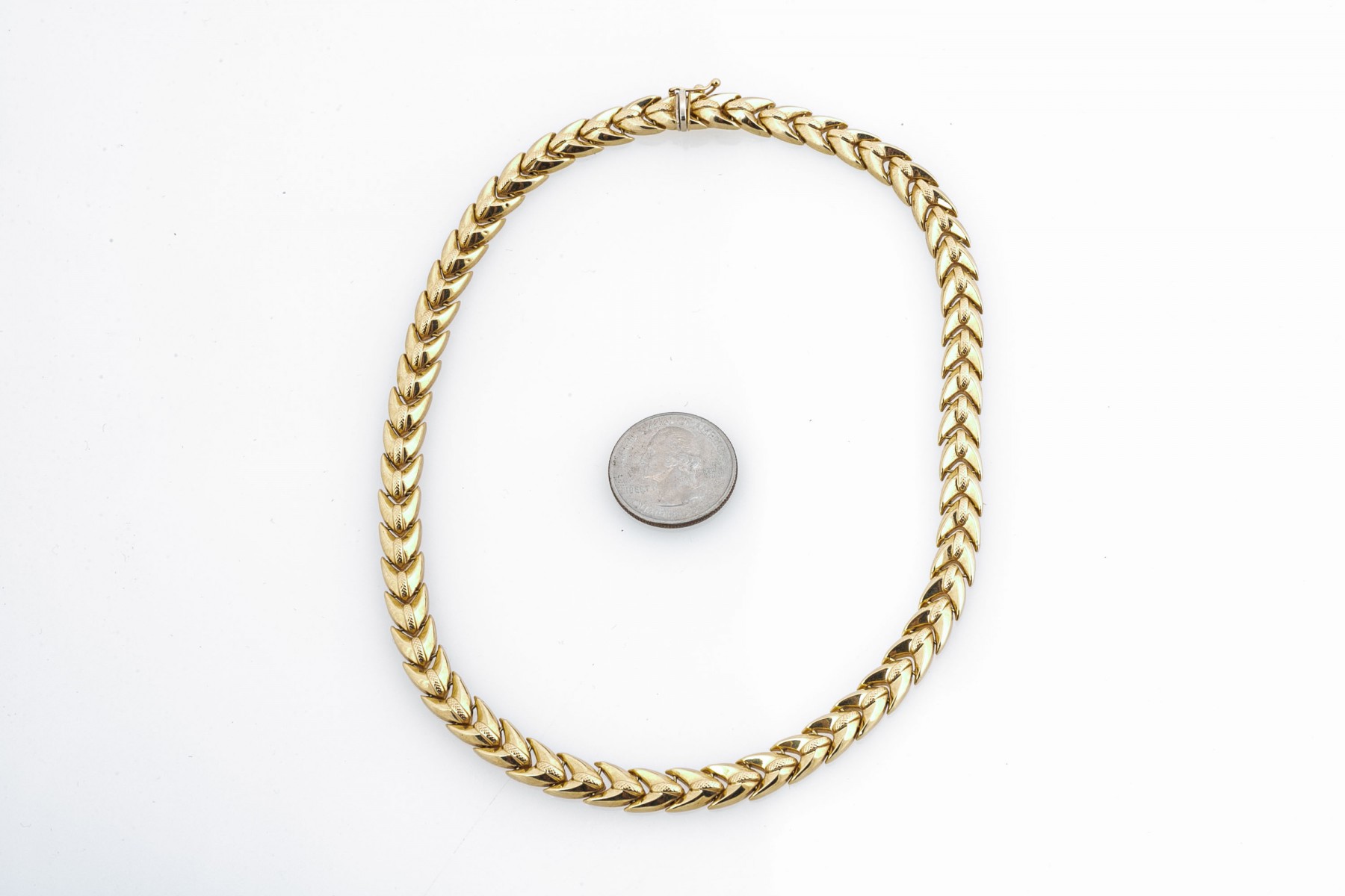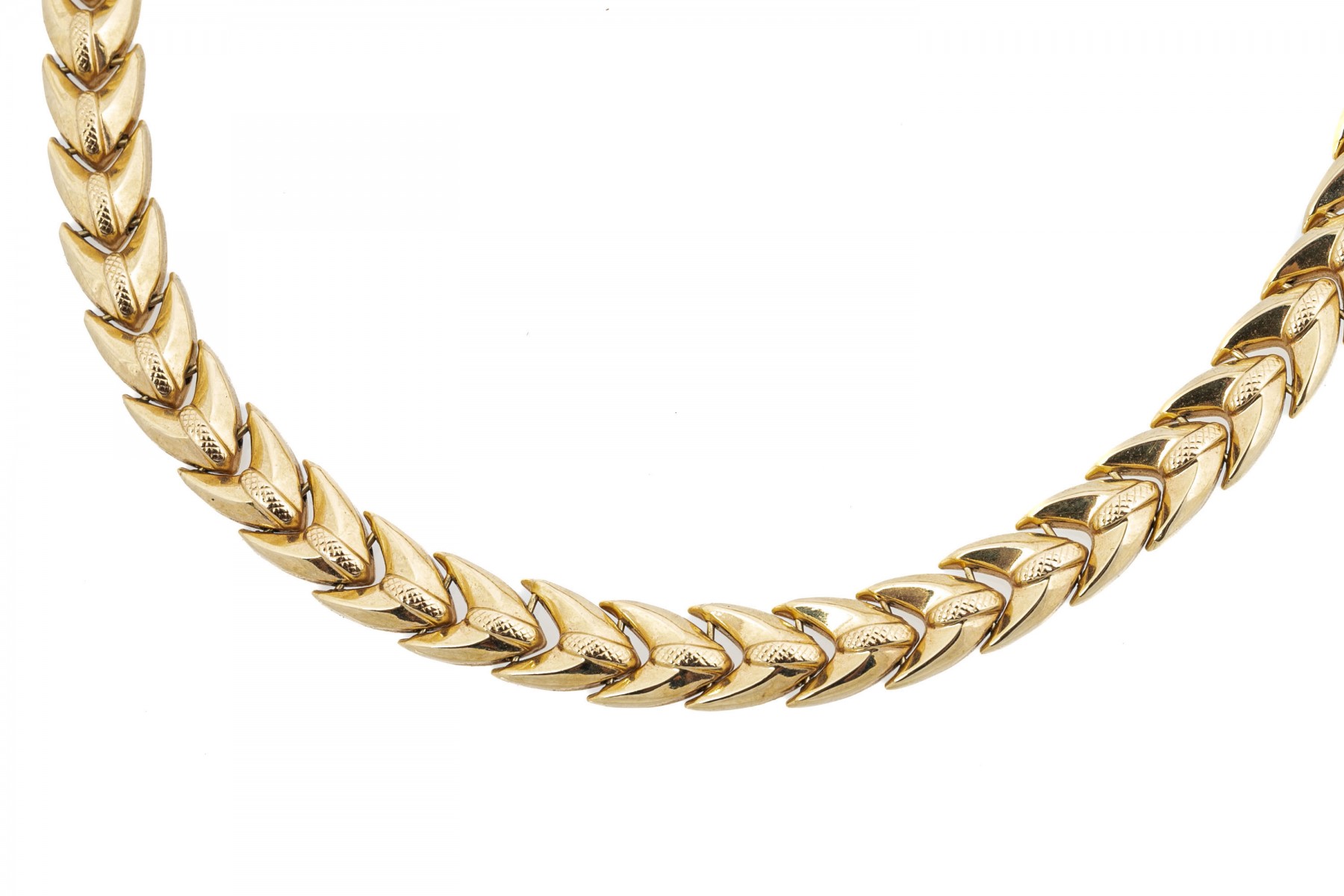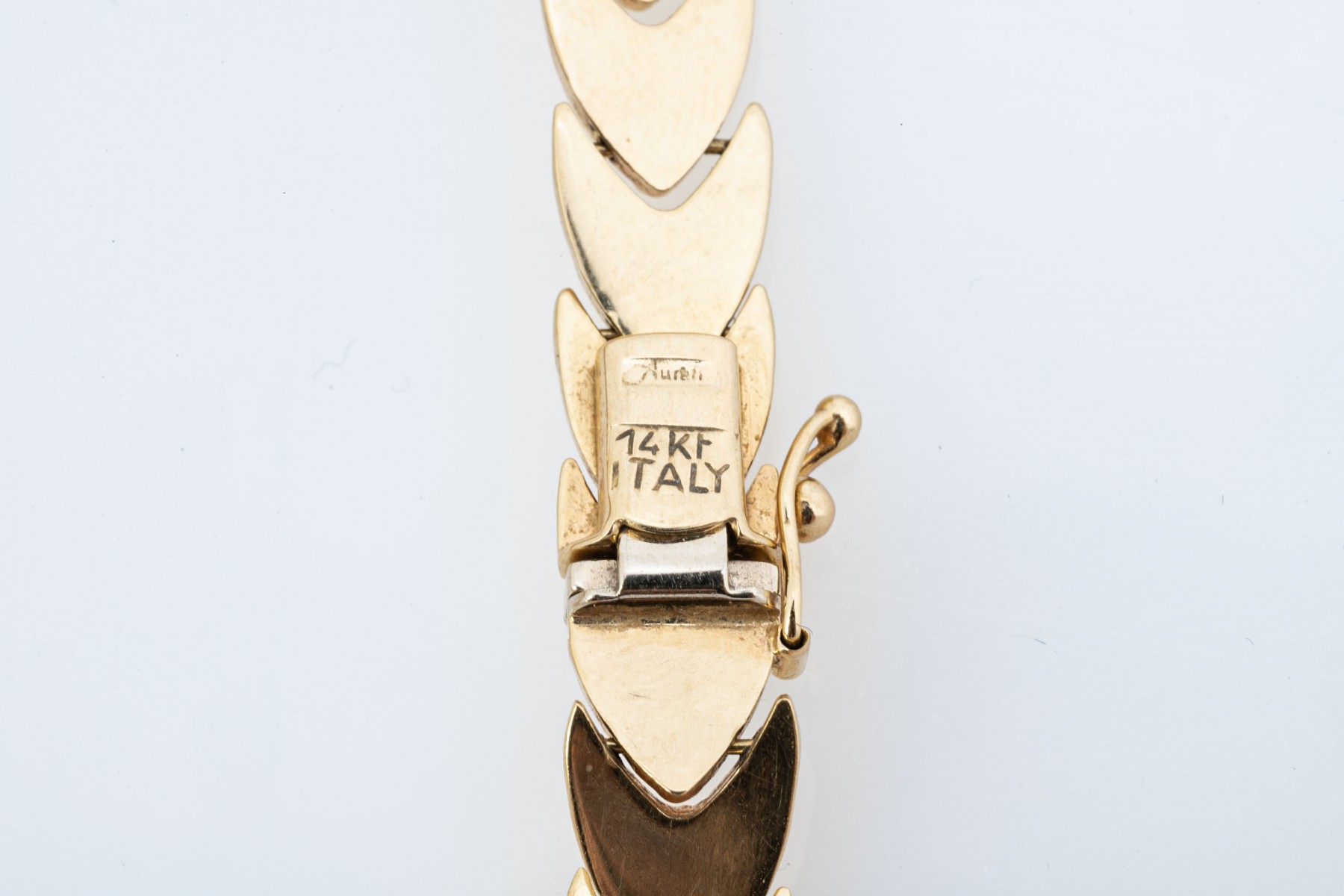 A 14K yellow gold fancy arrow shaped link necklace with etched design to center of each. Marked 14K Italy Aurafin to box clasp with safety snap.