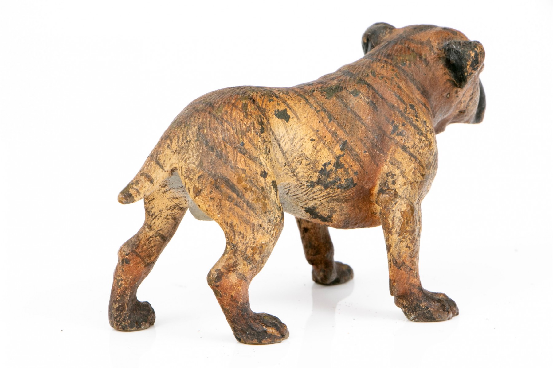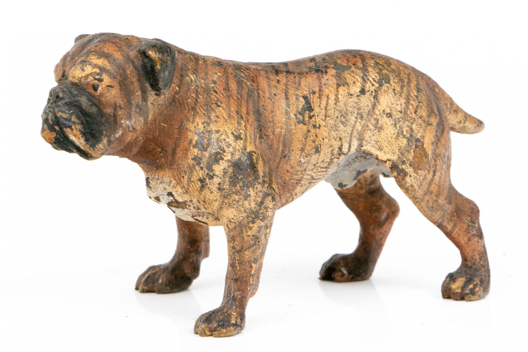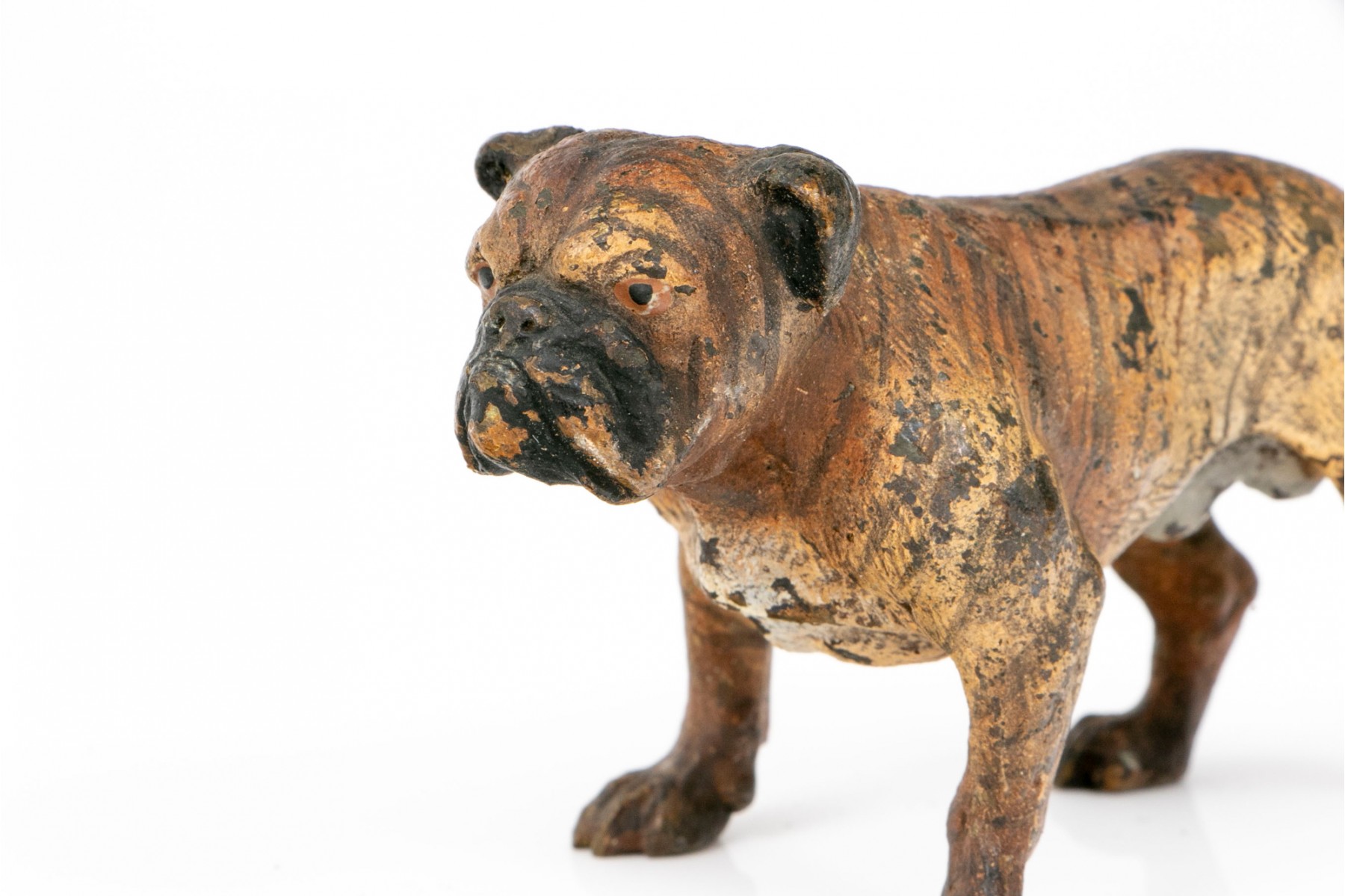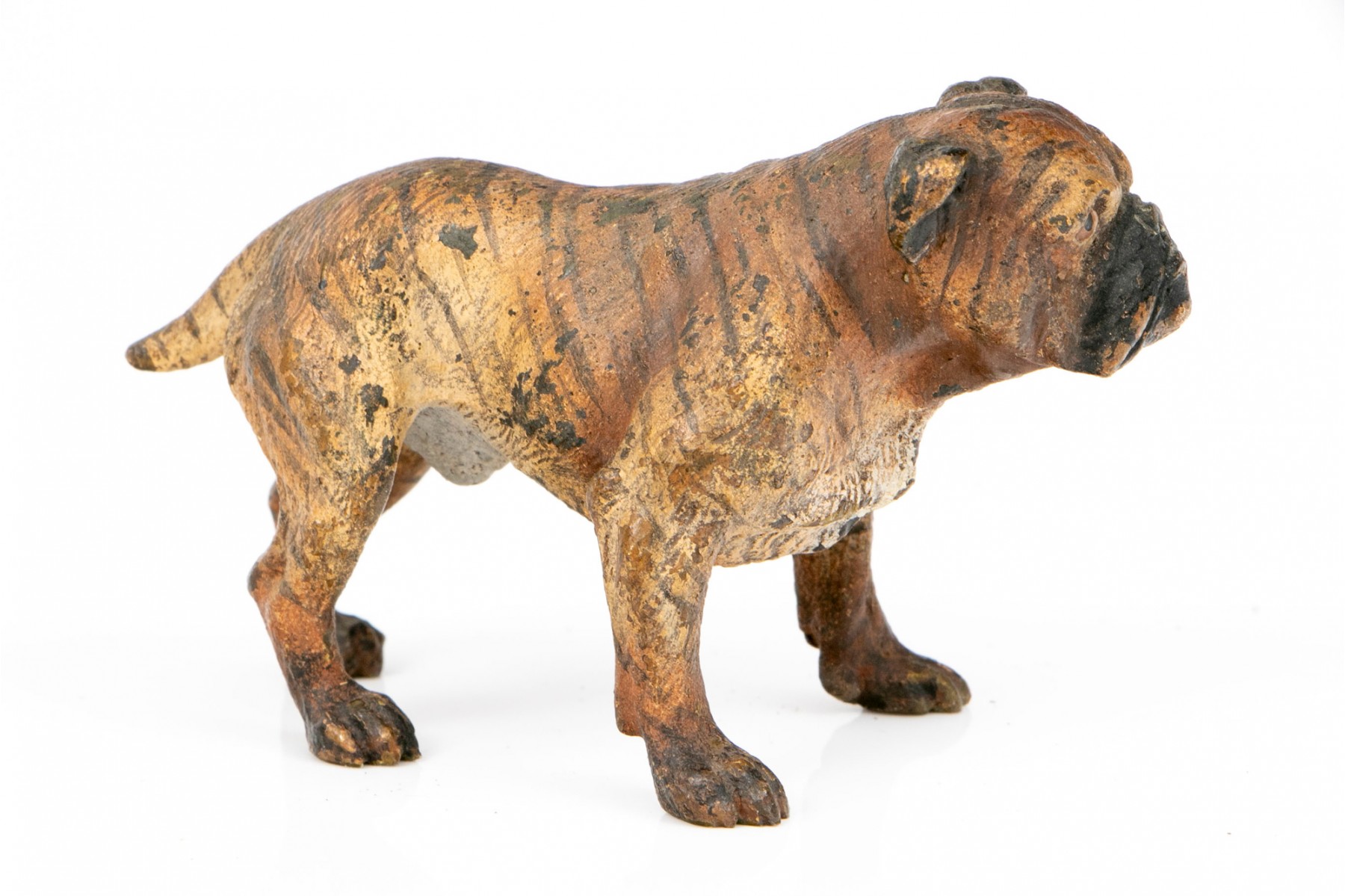 Cold painted brindle bull dog figure depict the dog standing erect. Stamped Austria on verso.