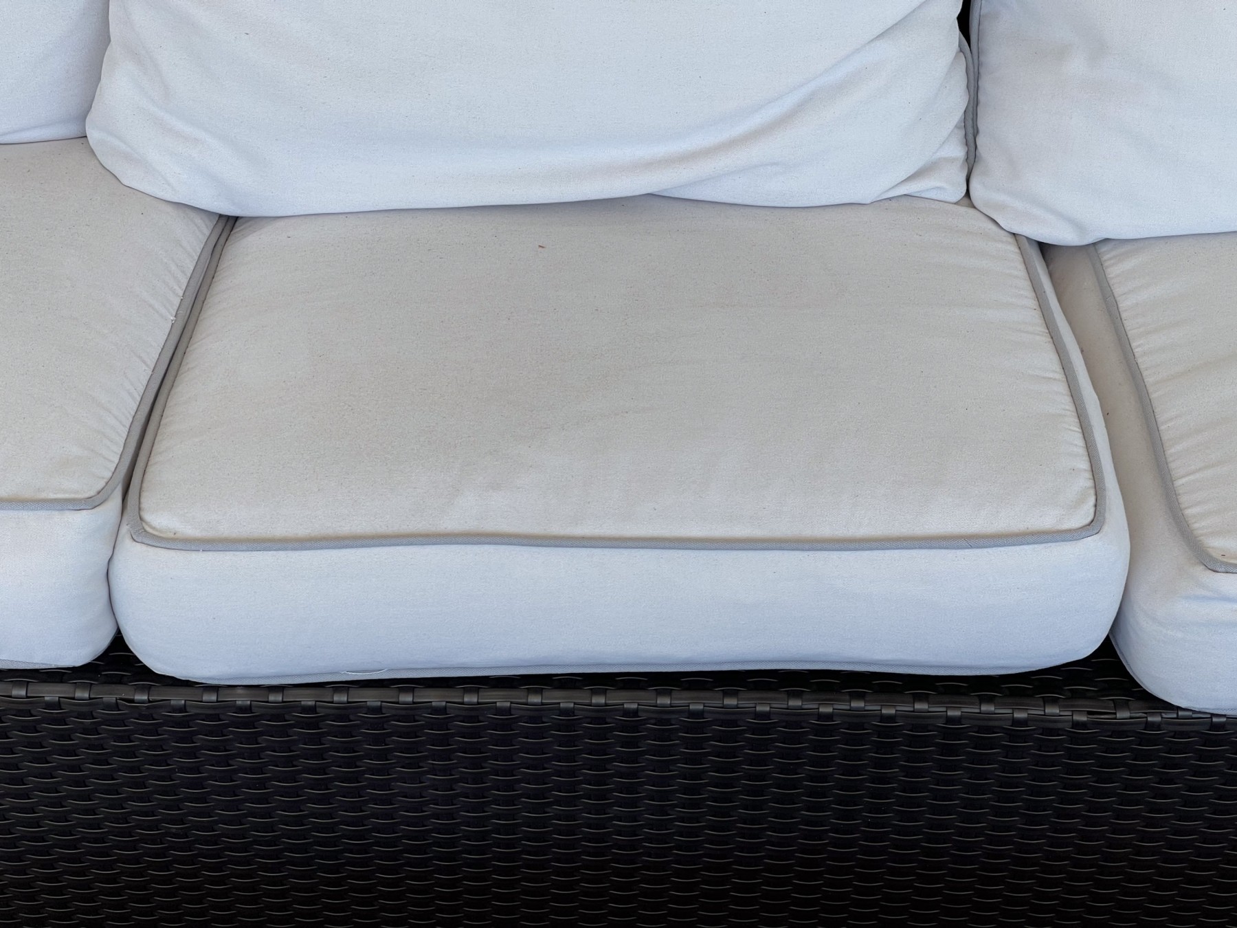With three loose seat cushions and three seat back cushions with a pair of accent cushions.
