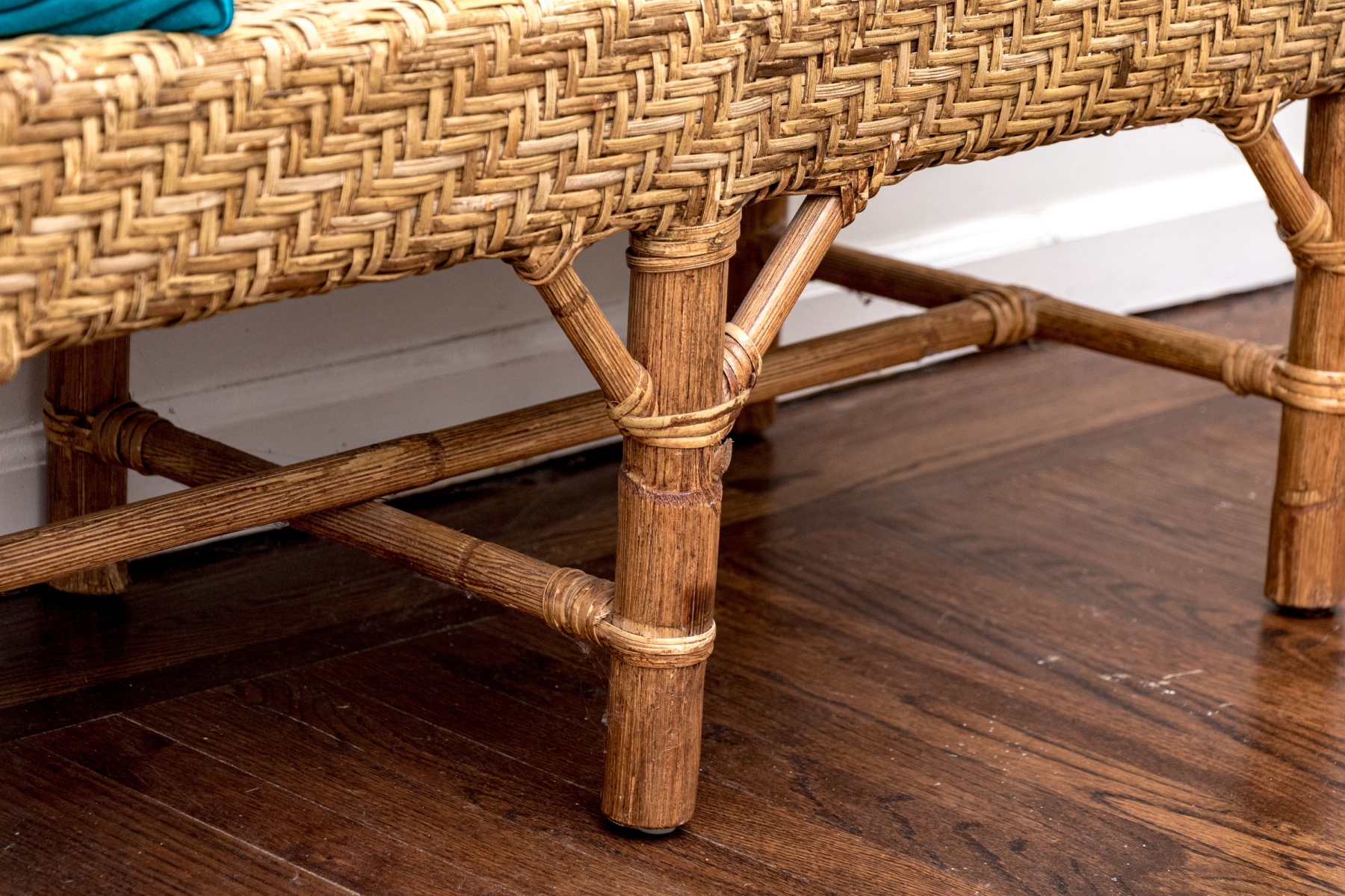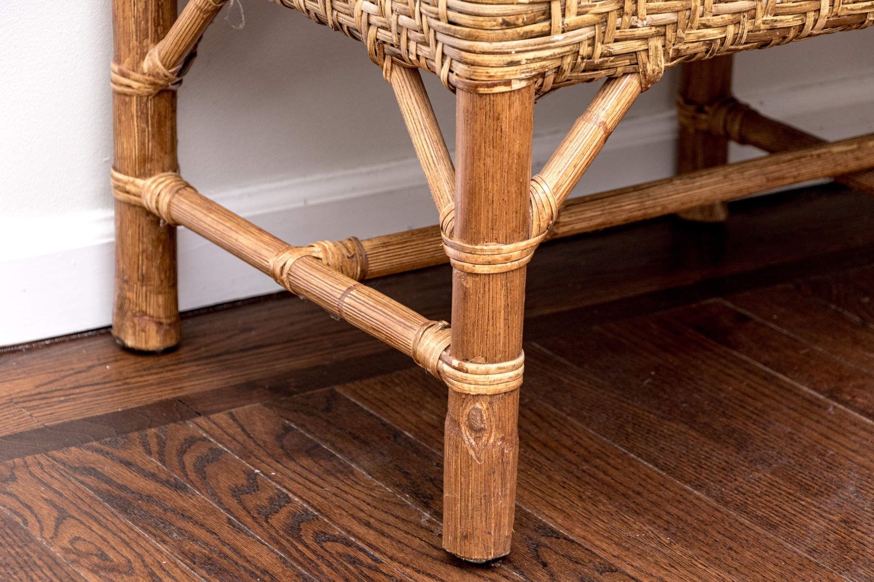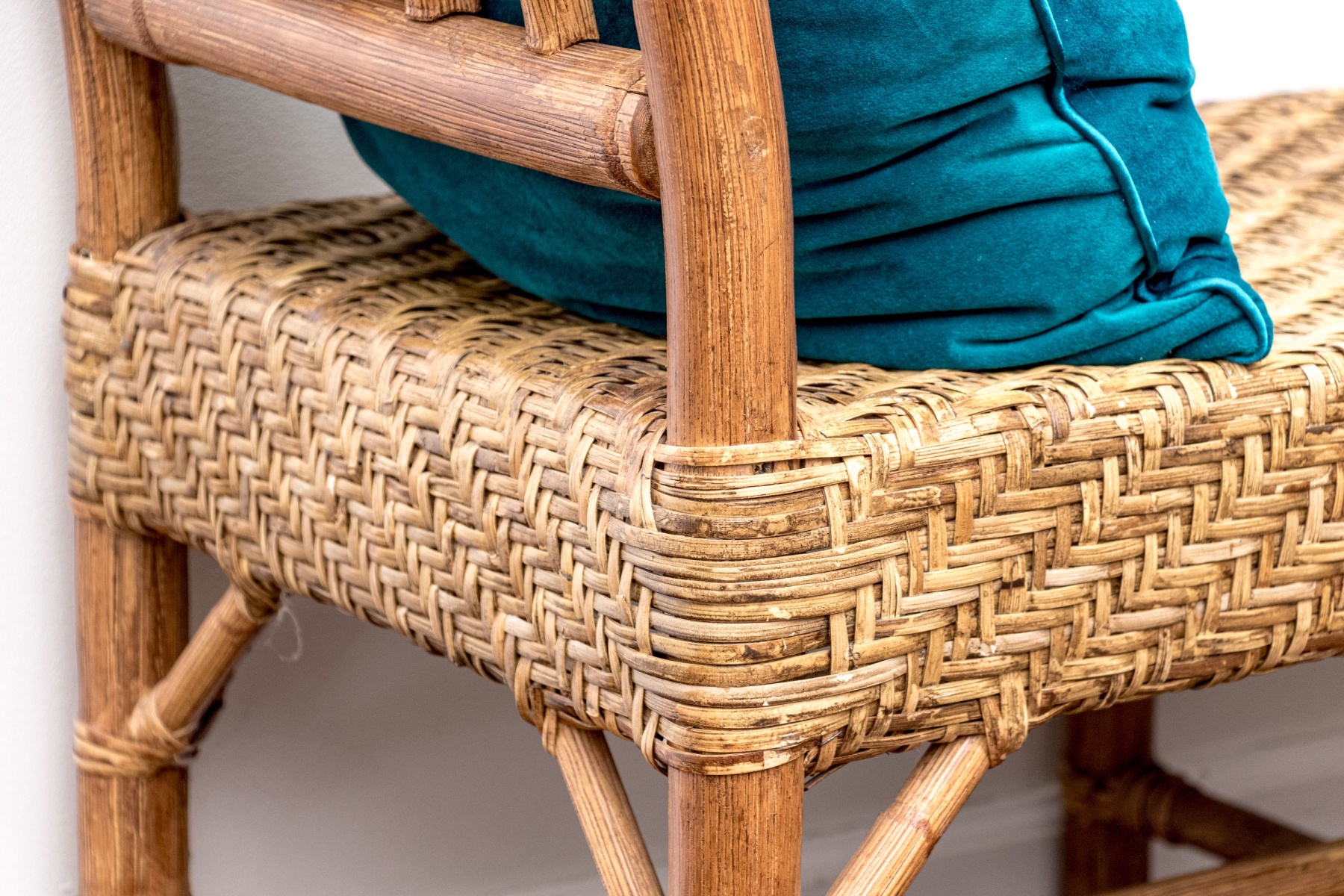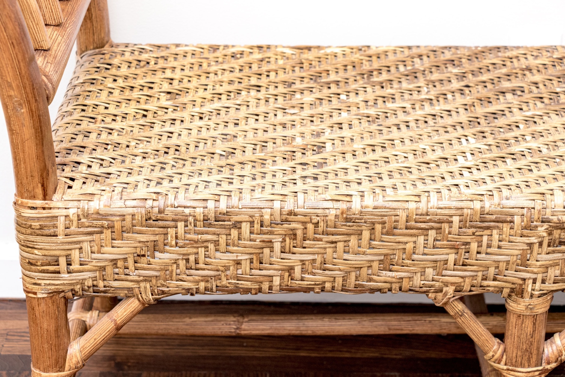 A charming bench with a natural aesthetic raised on six carved wooden legs with a reeded H-stretcher. The supports rise up and flare out with spindles connecting two stretches to each arm. The bench is finished with a wonderful woven rattan seat.