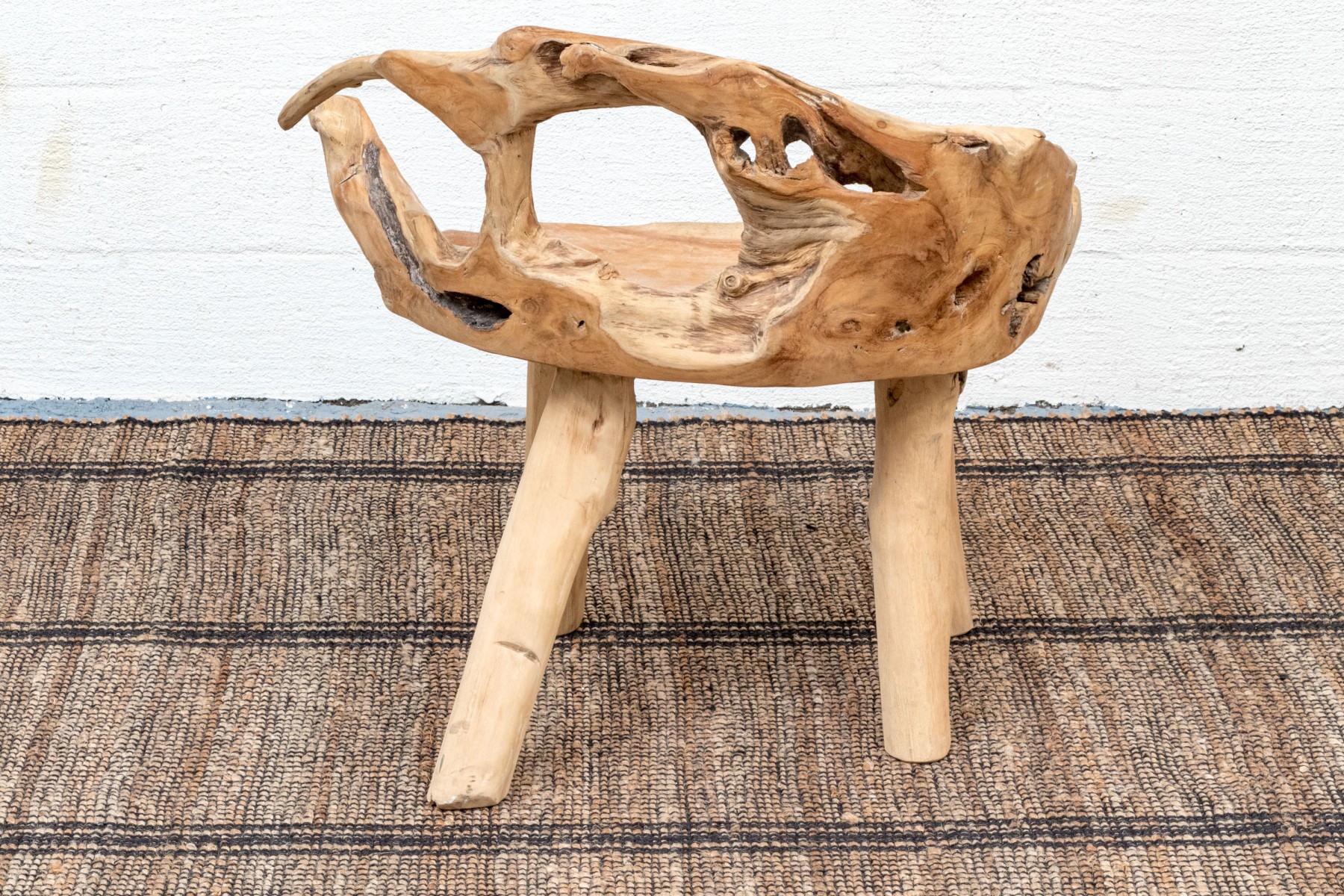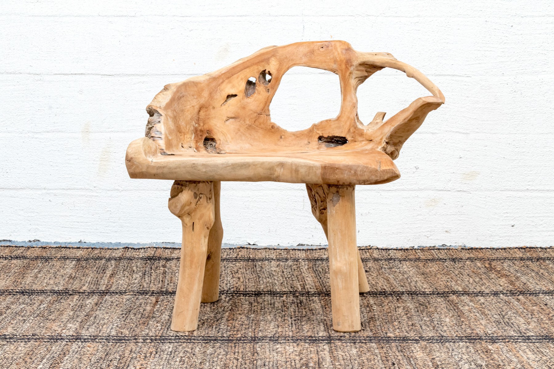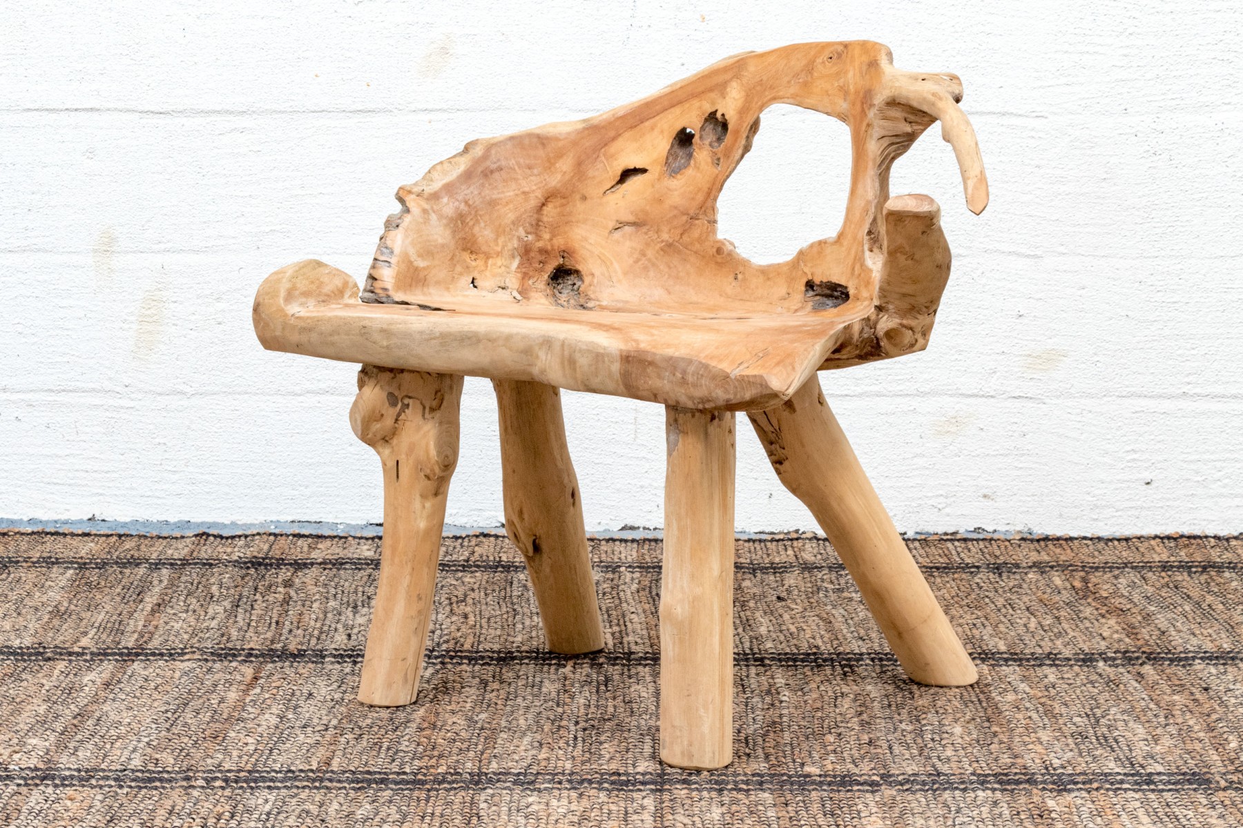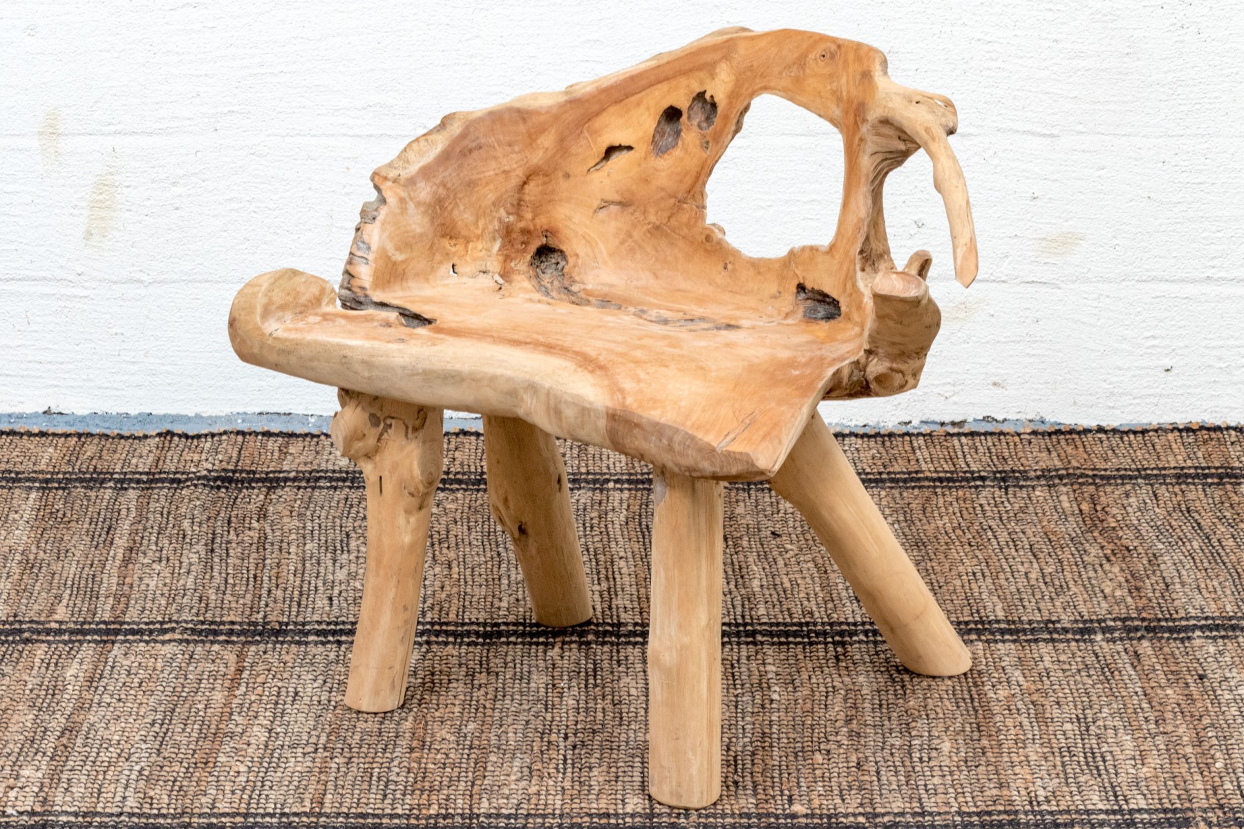 An impressive accent chair in honeyed light brown teak. The gently curved back and seat feature excellent root and knot details, adding an almost sculptural quality to the piece with eye-catching texture and variation. Raised on unique branch legs, completing the design.