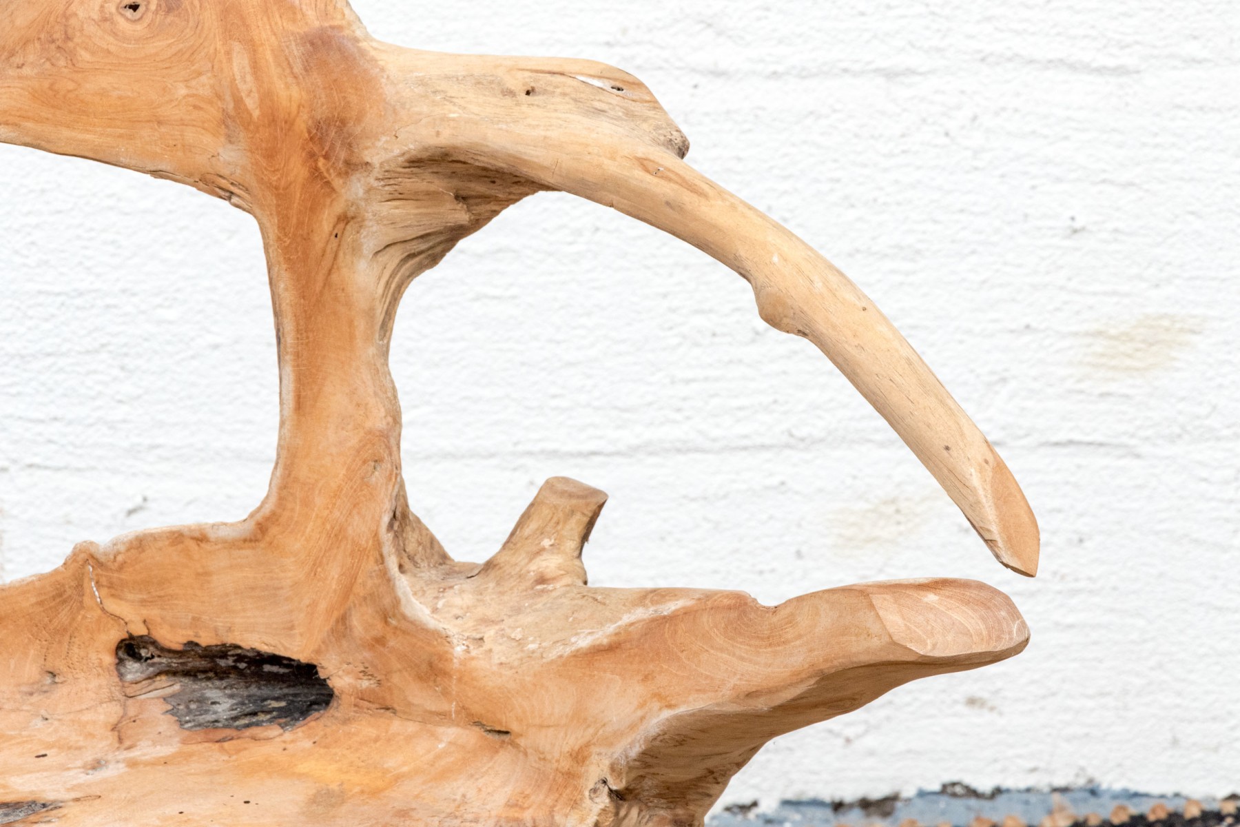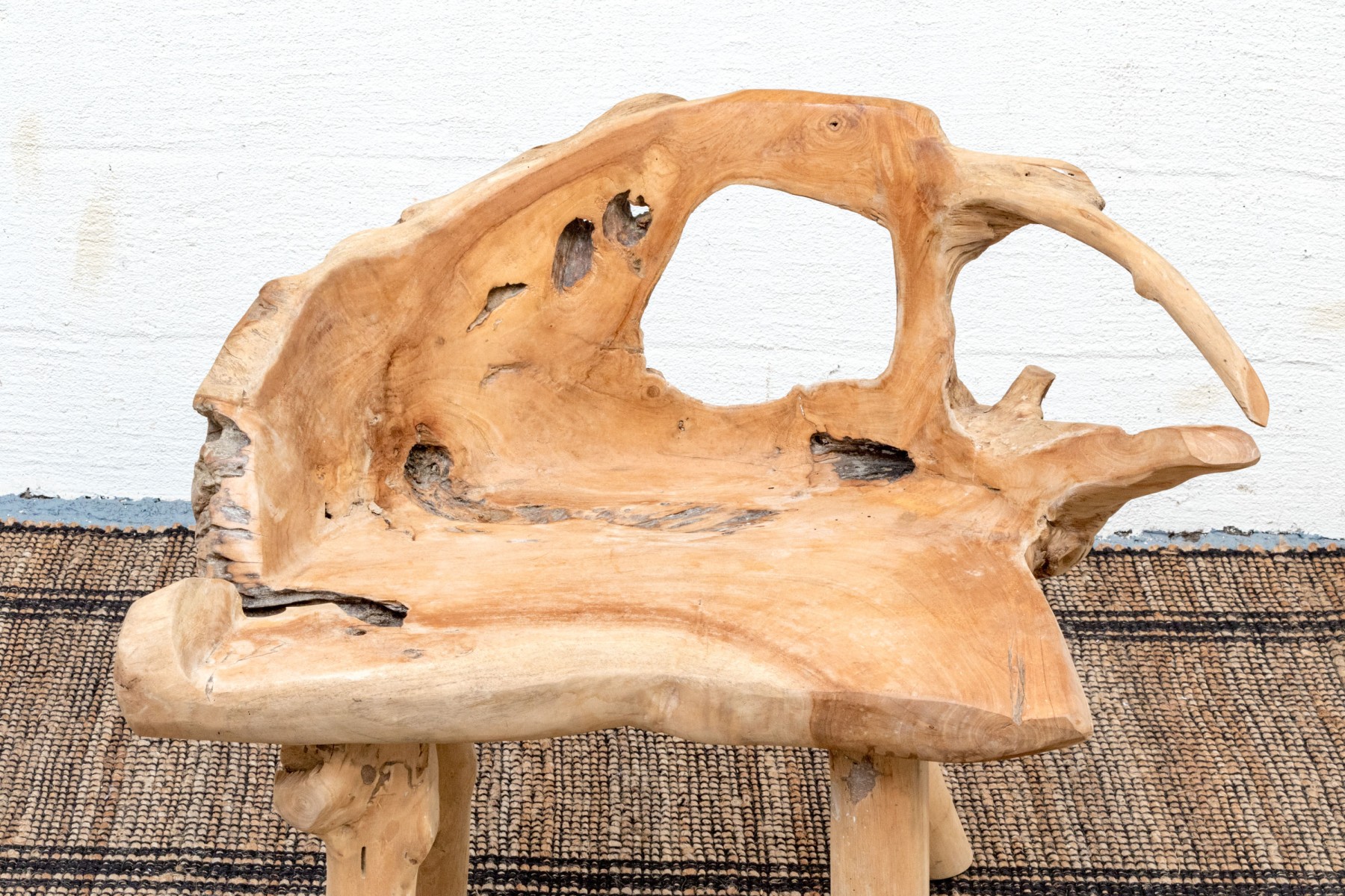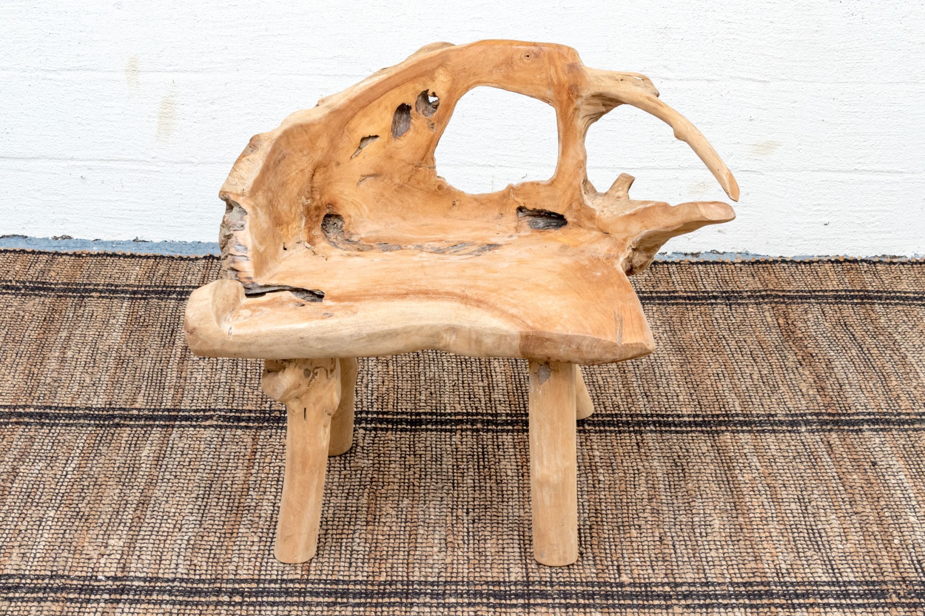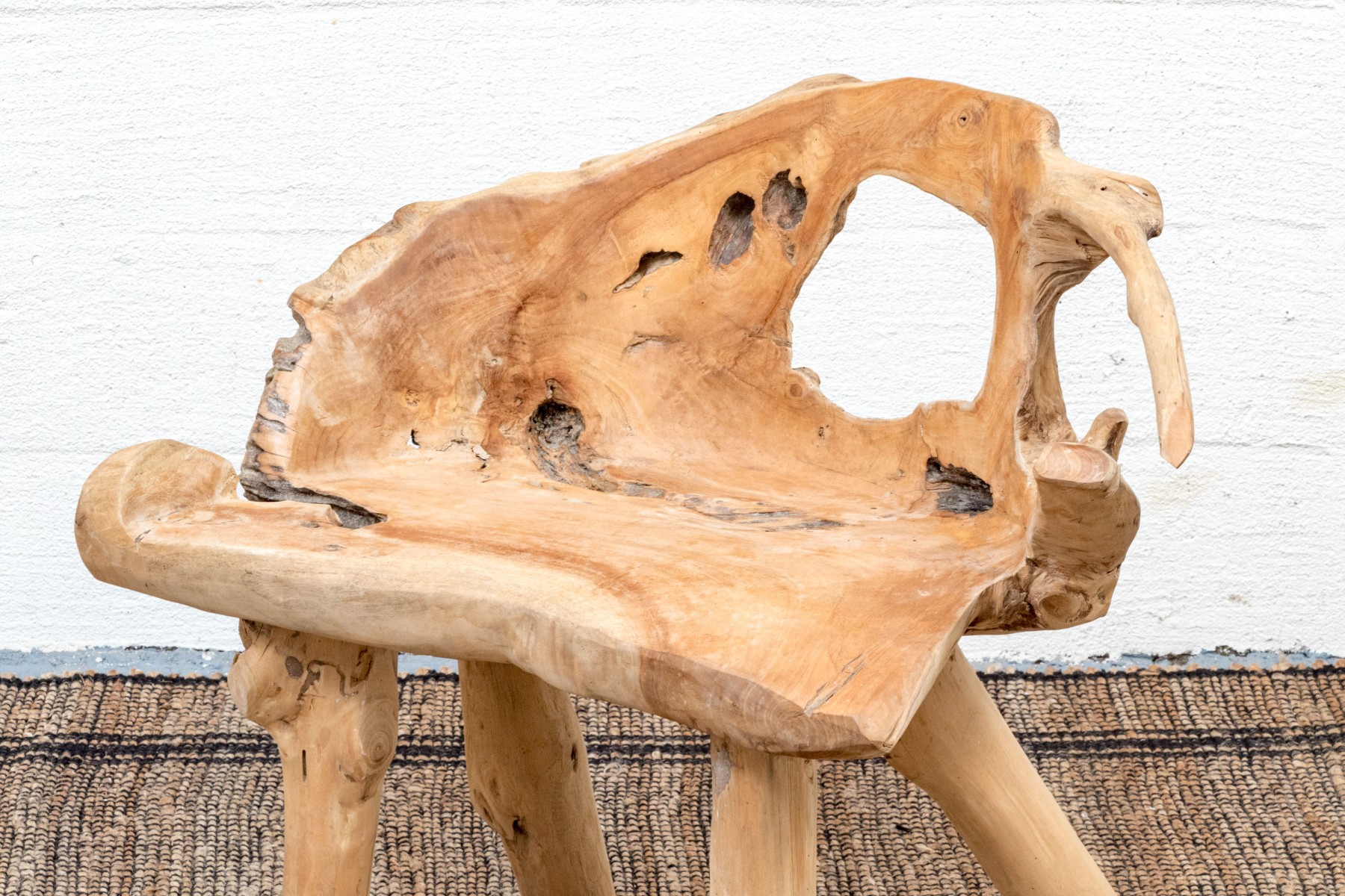 An impressive accent chair in honeyed light brown teak. The gently curved back and seat feature excellent root and knot details, adding an almost sculptural quality to the piece with eye-catching texture and variation. Raised on unique branch legs, completing the design.