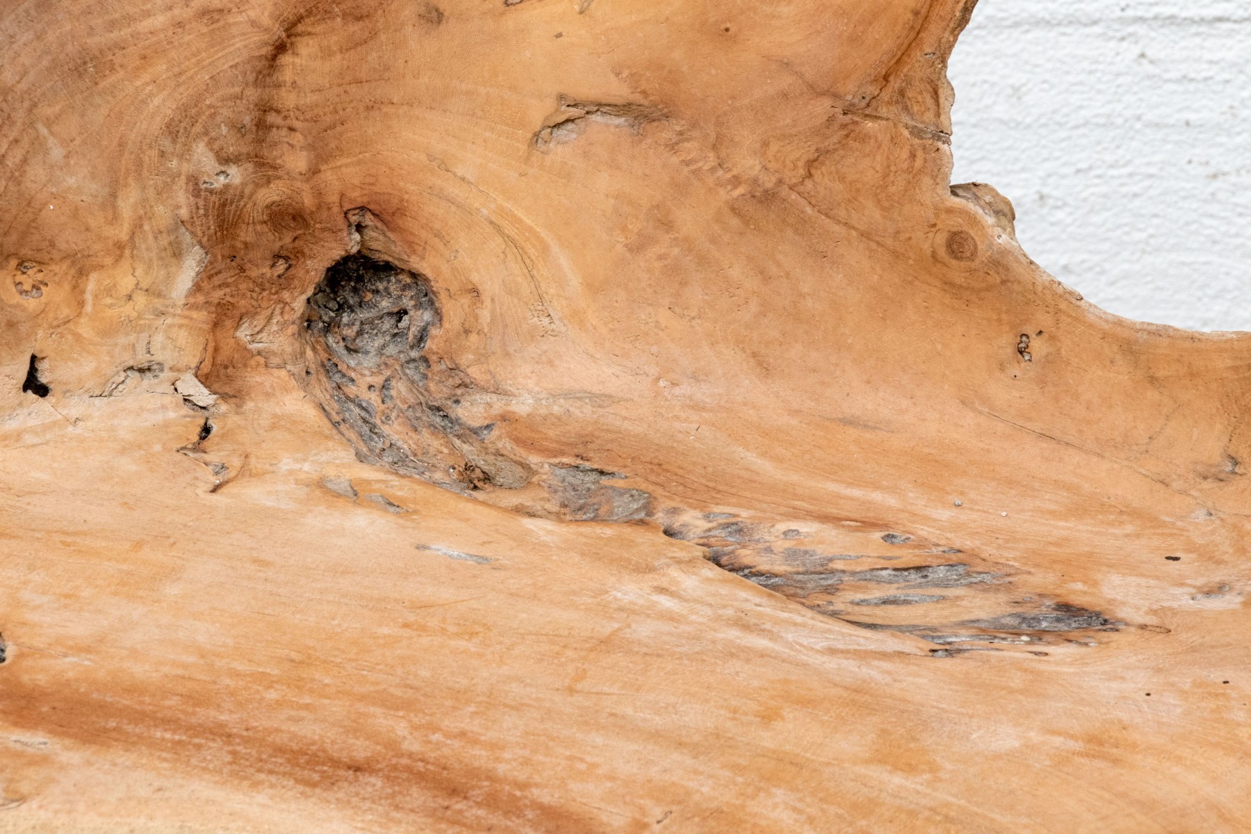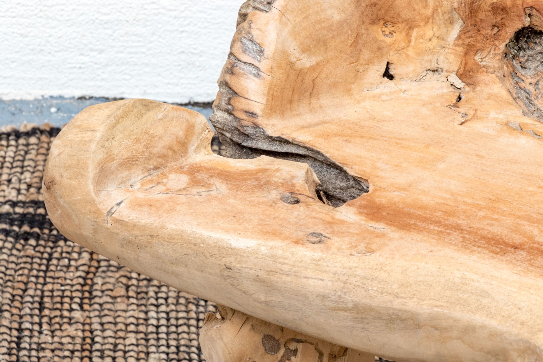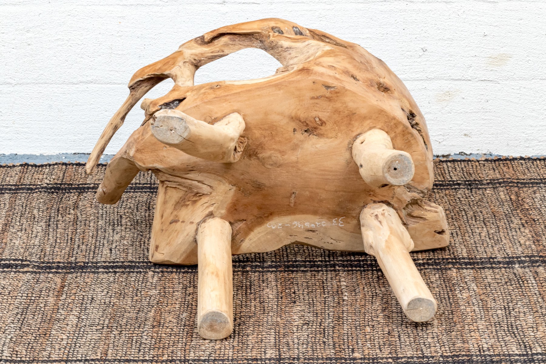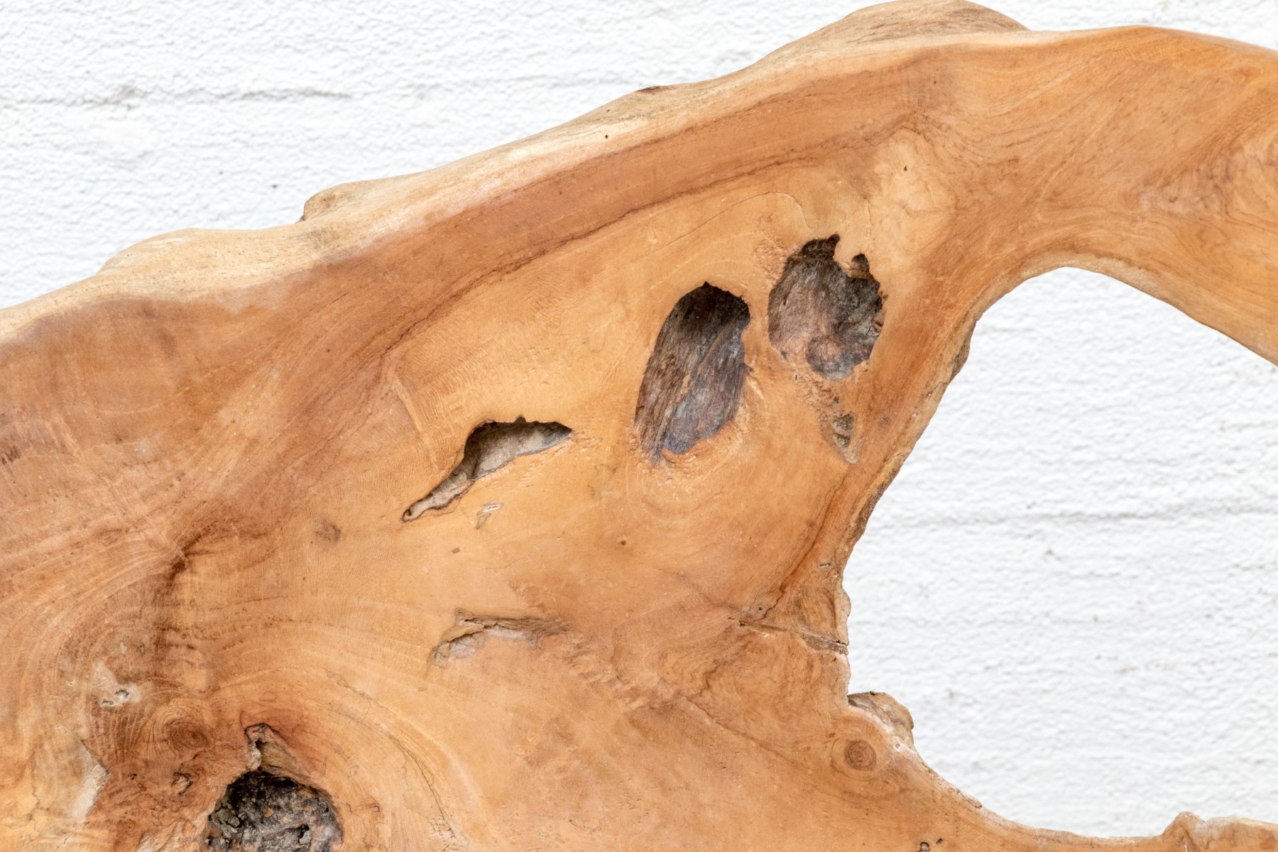 An impressive accent chair in honeyed light brown teak. The gently curved back and seat feature excellent root and knot details, adding an almost sculptural quality to the piece with eye-catching texture and variation. Raised on unique branch legs, completing the design.