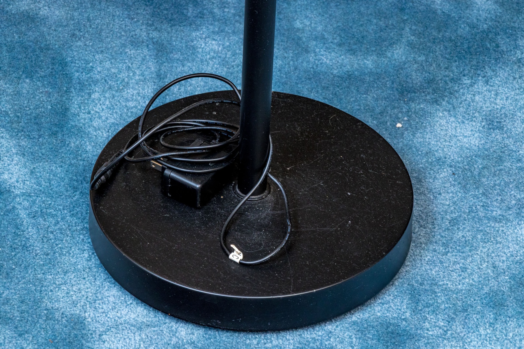 On circular base with plug to use the lightbulb with vertical pole and horizontal pole both adjustable.