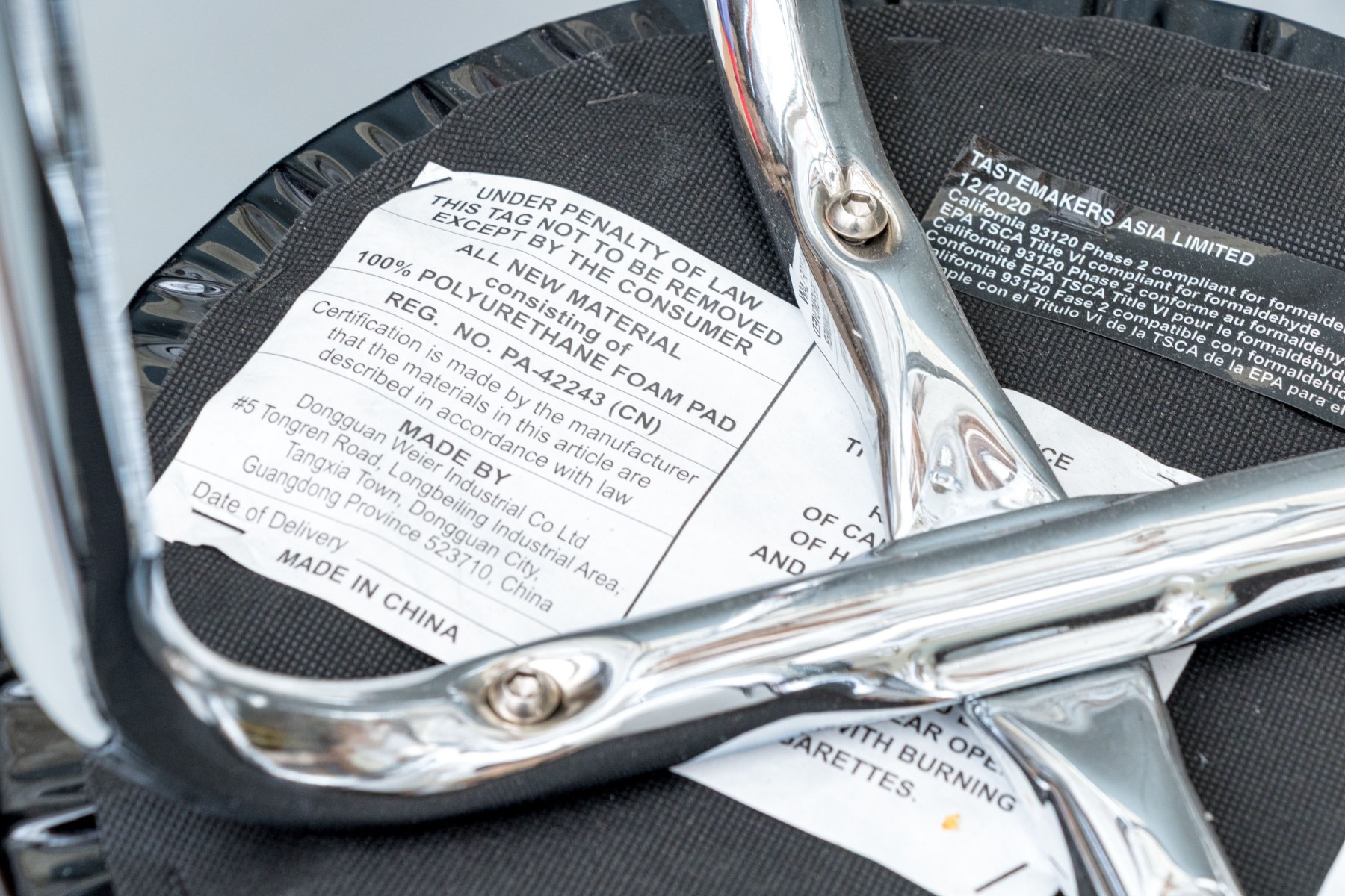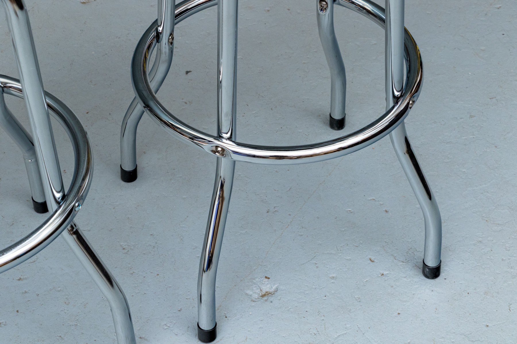Each standing on chrome frames with four legs with black toe caps, having circular stretcher supports with decorative seat cushions.