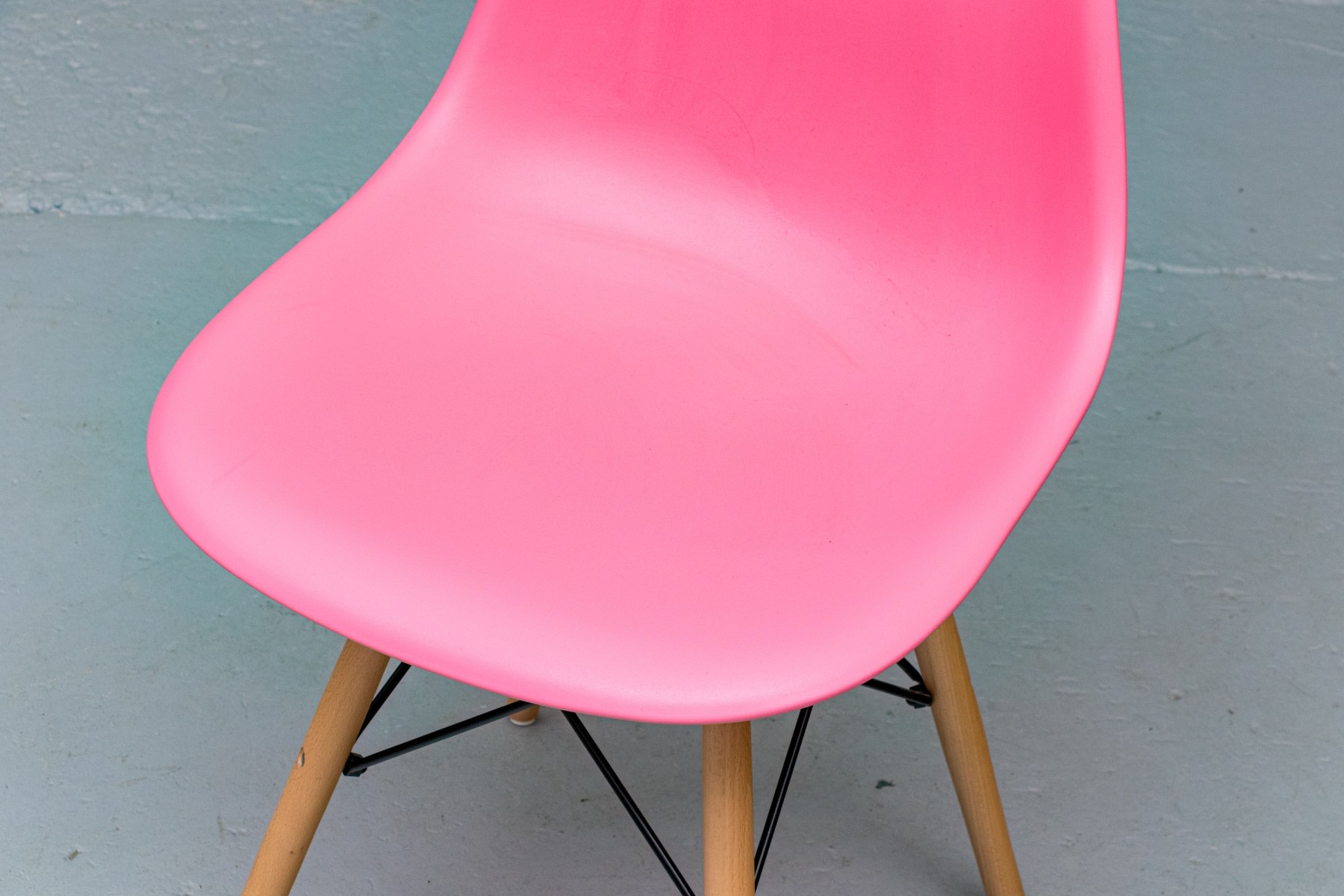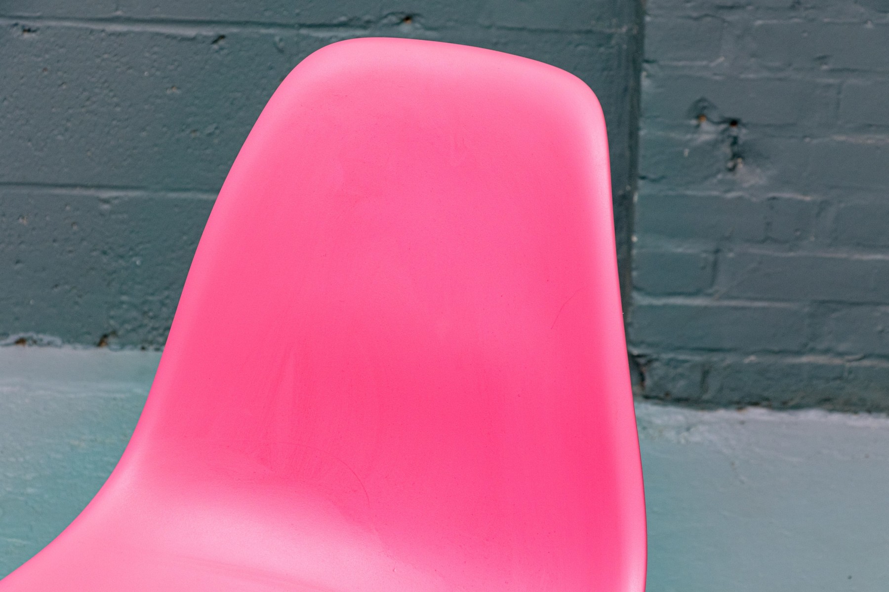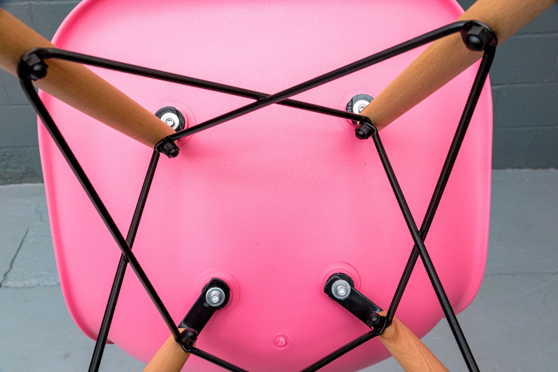 On four splayed legs with black metallic stretcher supports lending an architectural aesthetic with single piece moulded resin seat and seat back in a bubblegum pink hue.