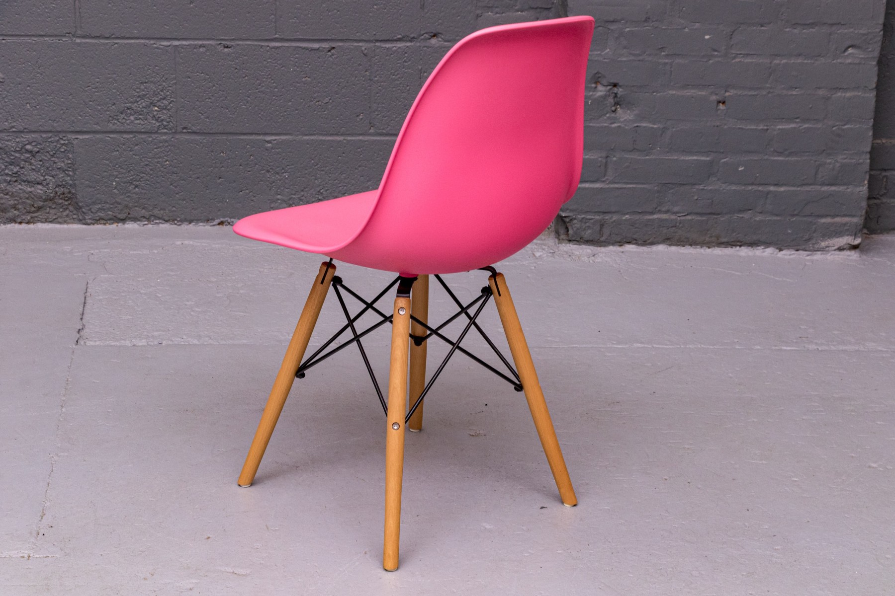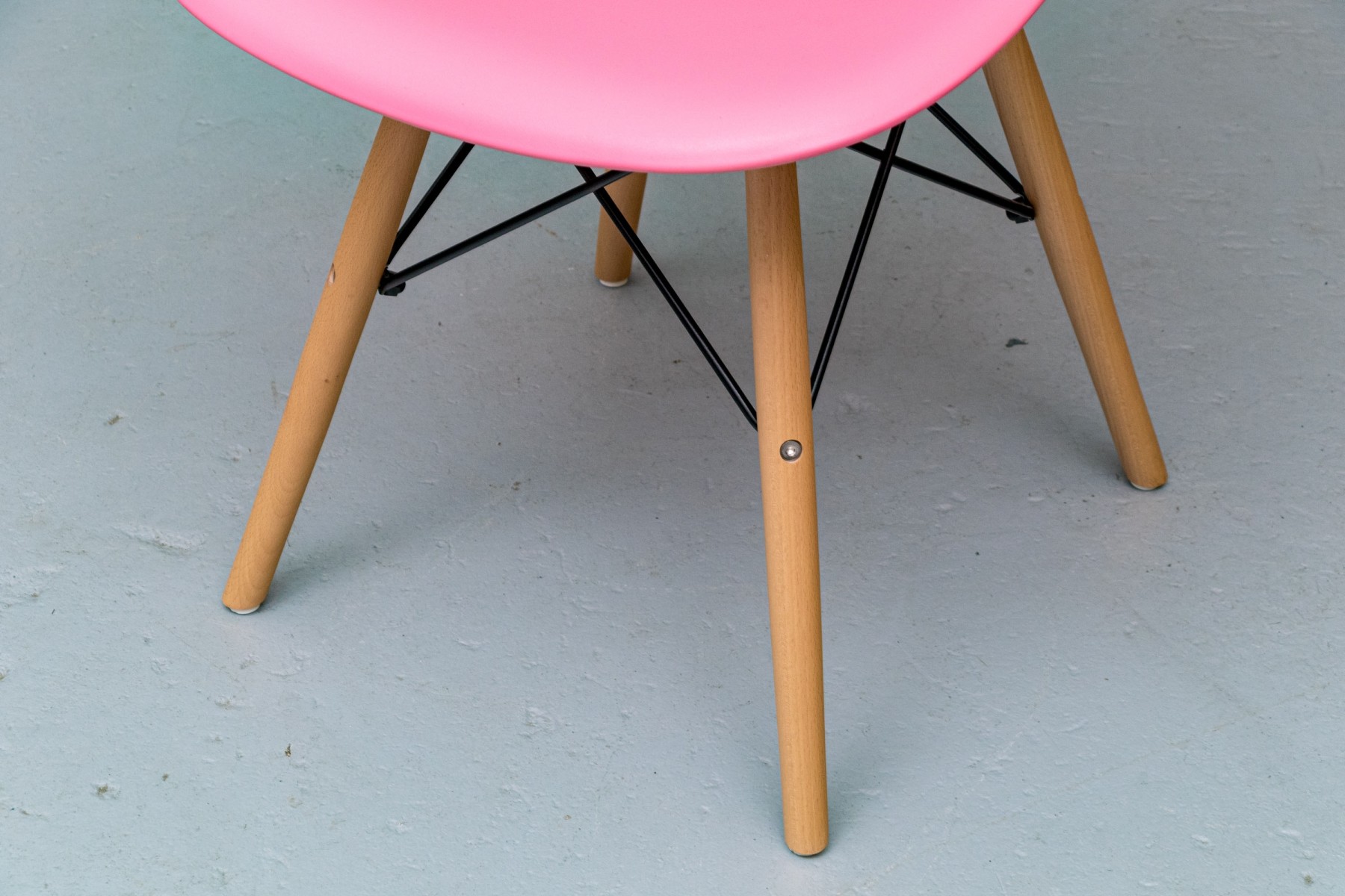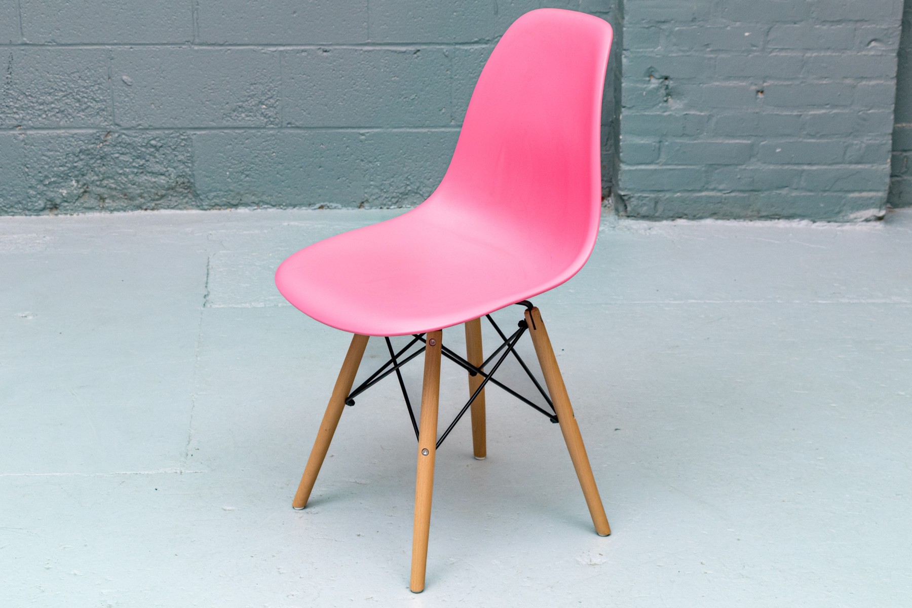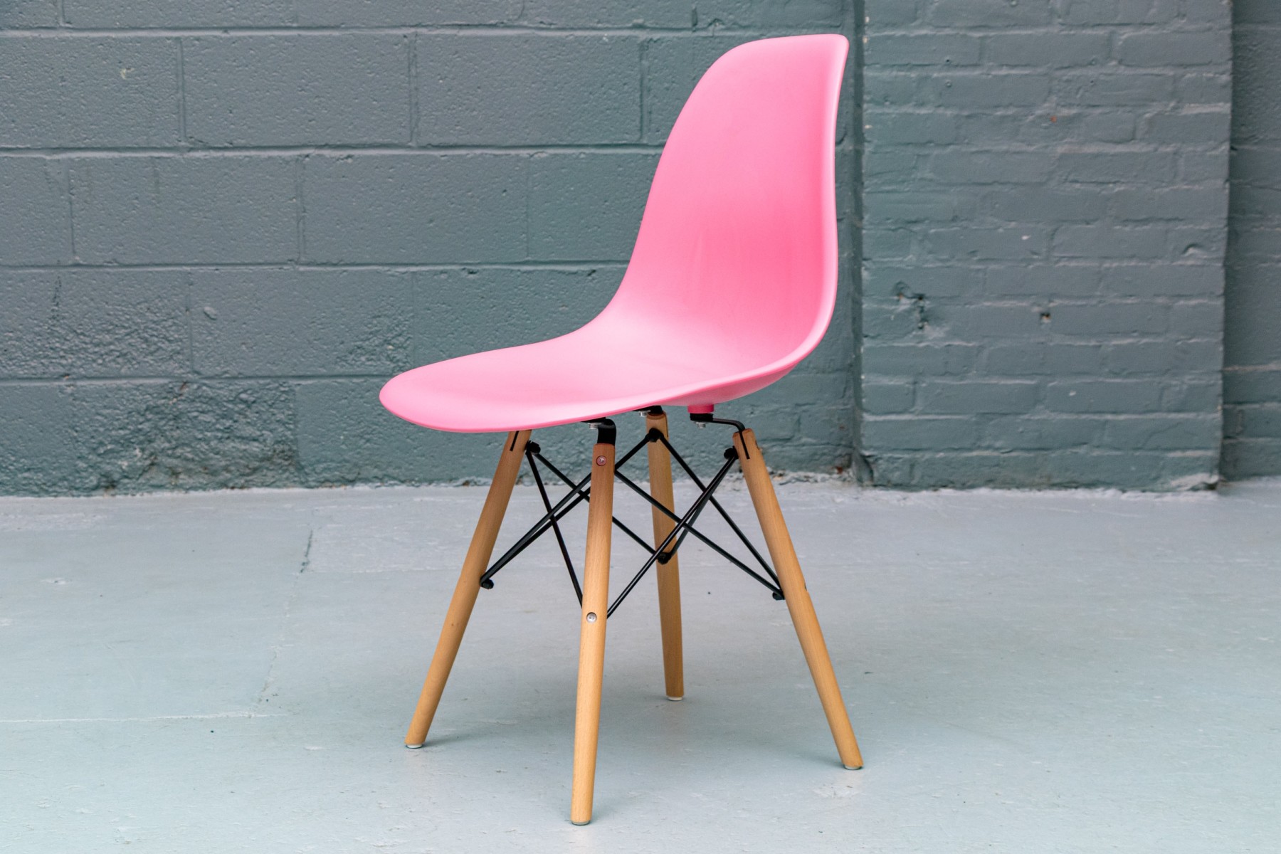 On four splayed legs with black metallic stretcher supports lending an architectural aesthetic with single piece moulded resin seat and seat back in a bubblegum pink hue.