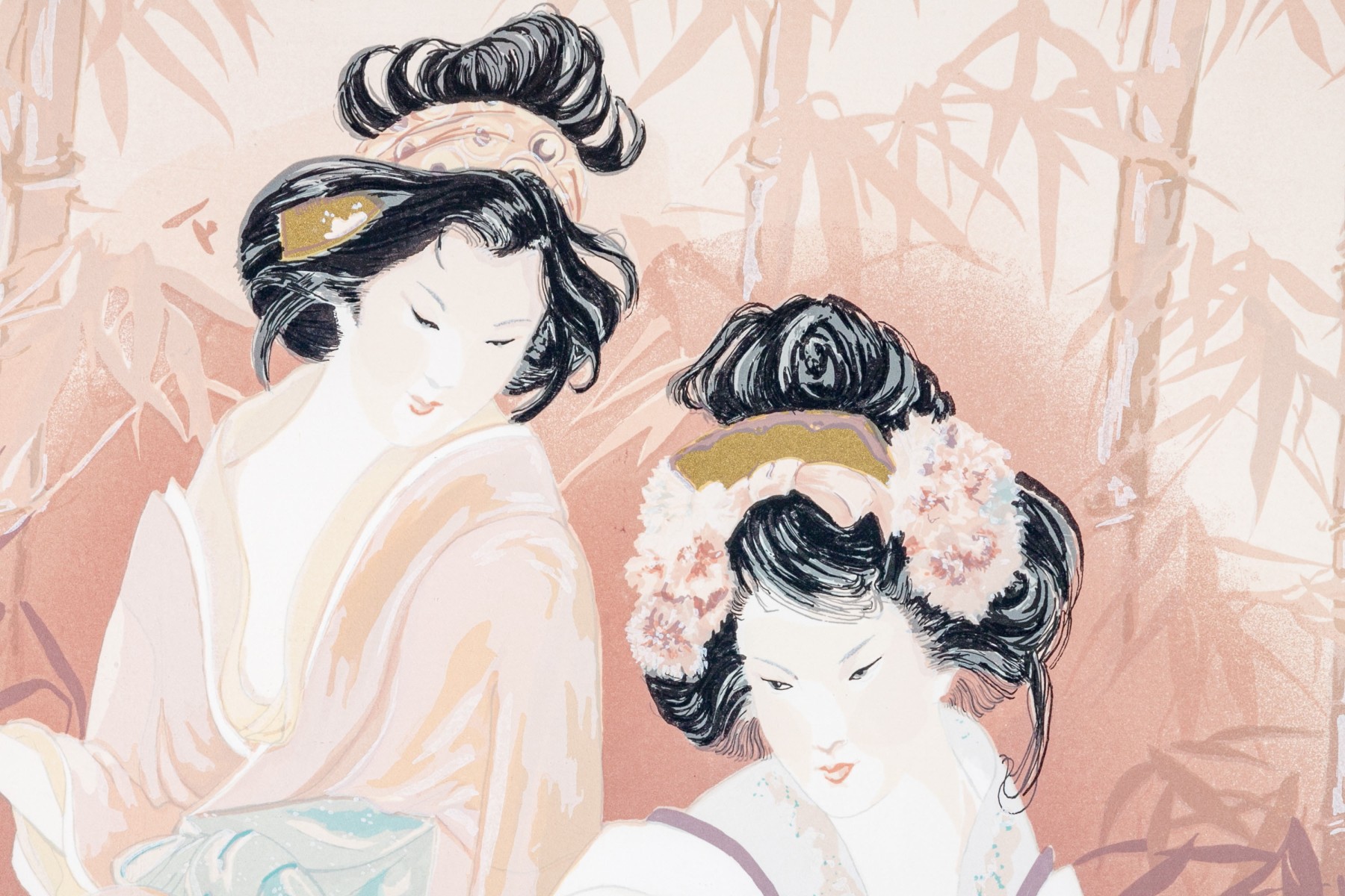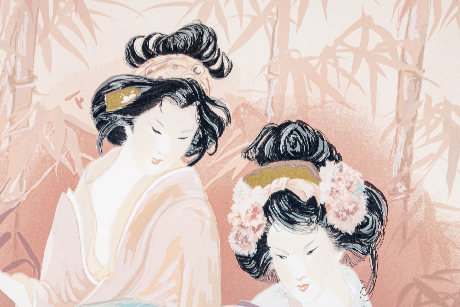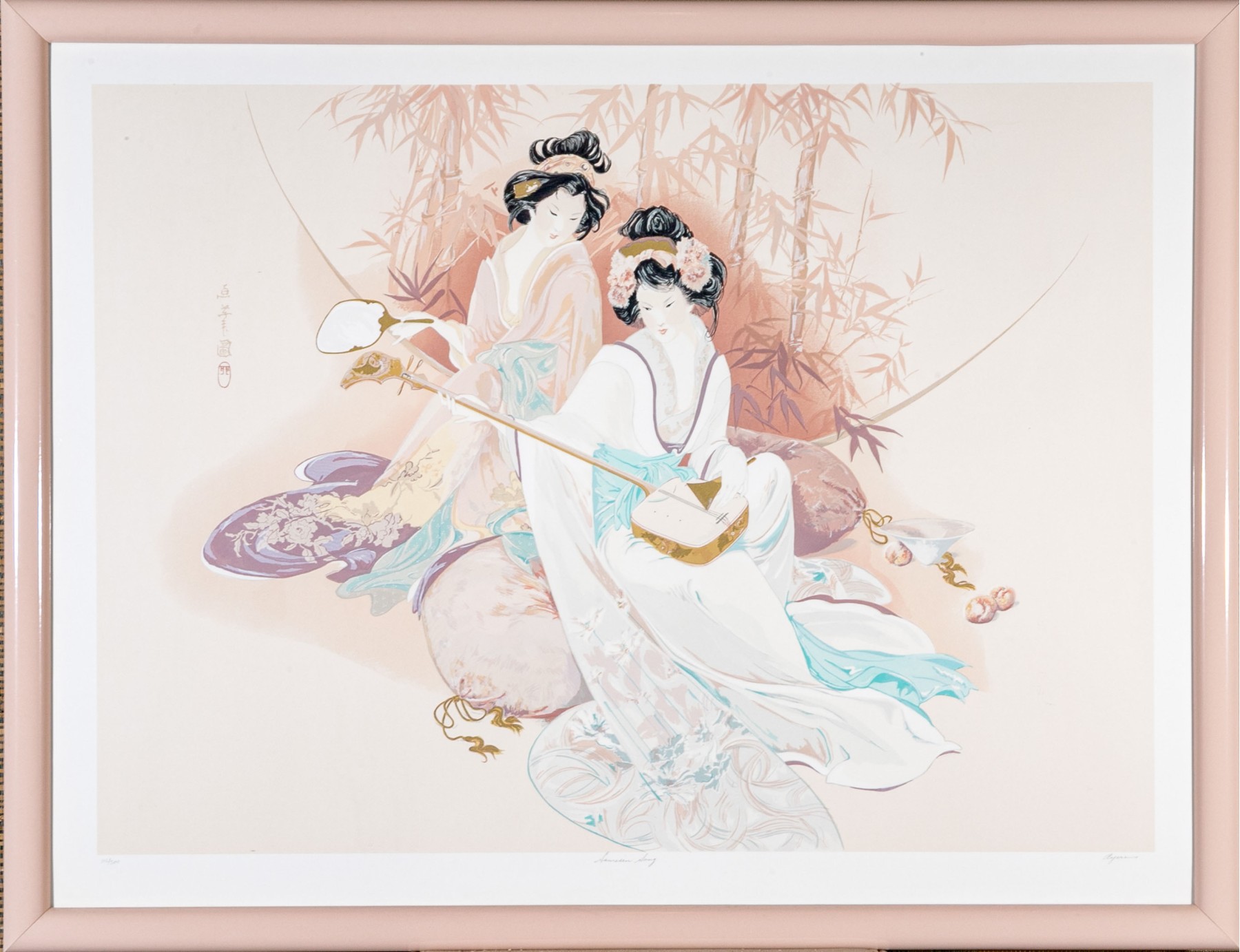 Limited edition lithograph depicting two geisha girls, one playing a shamisen, one with fan, against a bamboo setting.