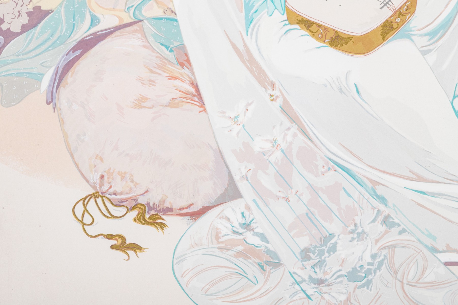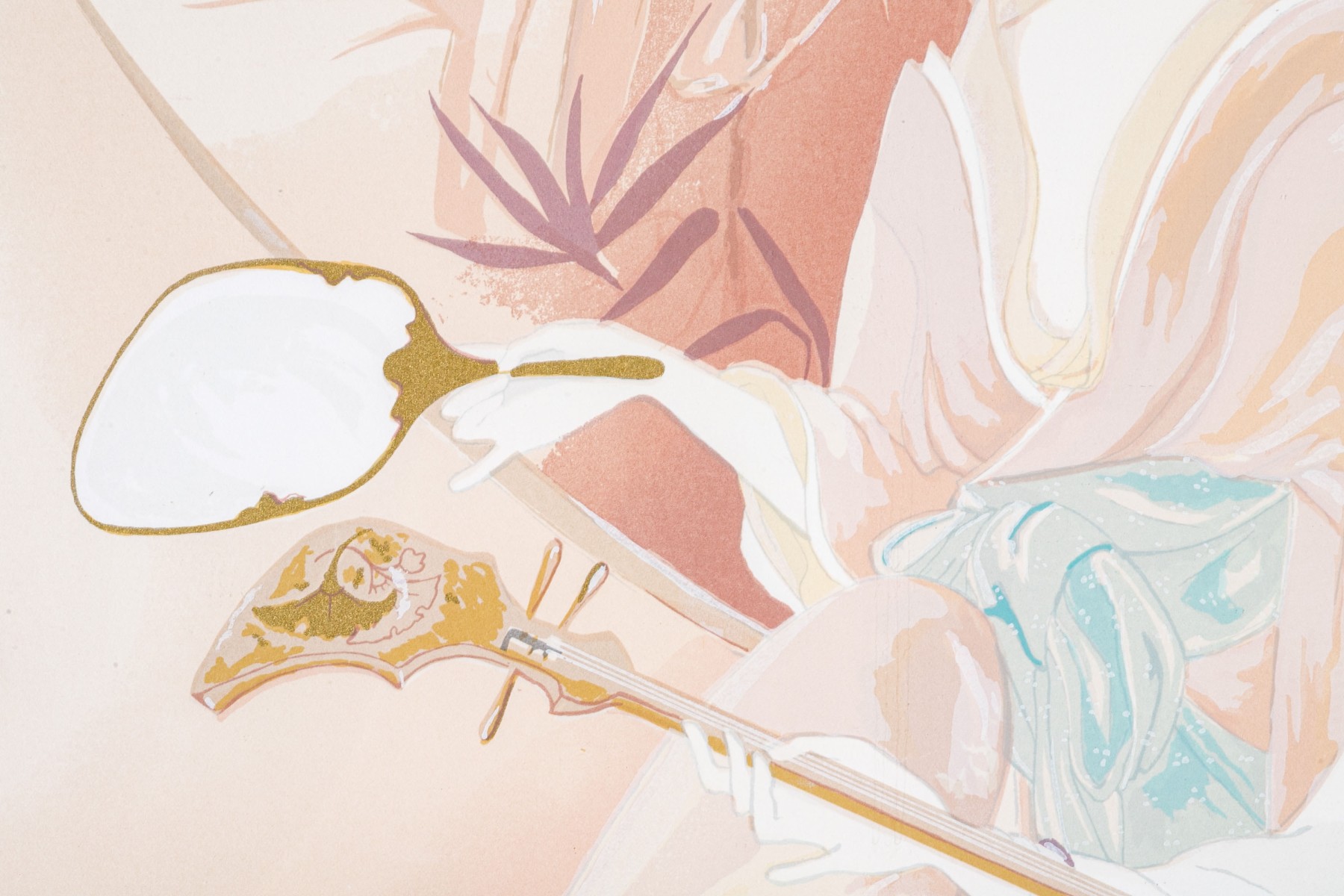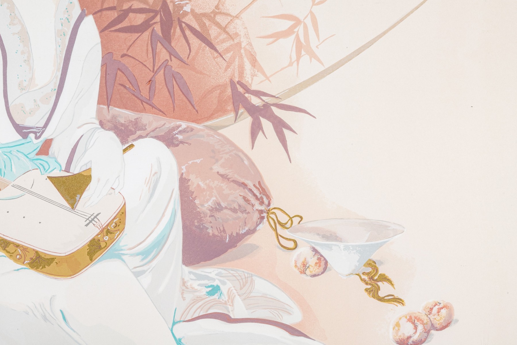 Limited edition lithograph depicting two geisha girls, one playing a shamisen, one with fan, against a bamboo setting.