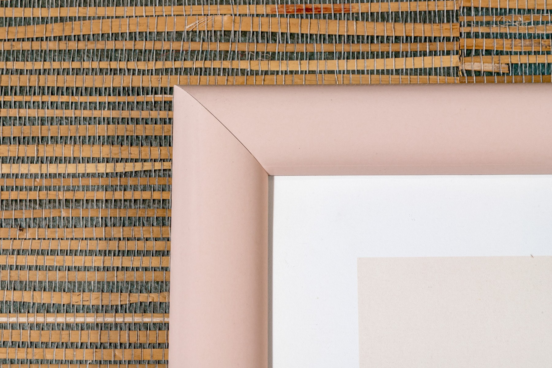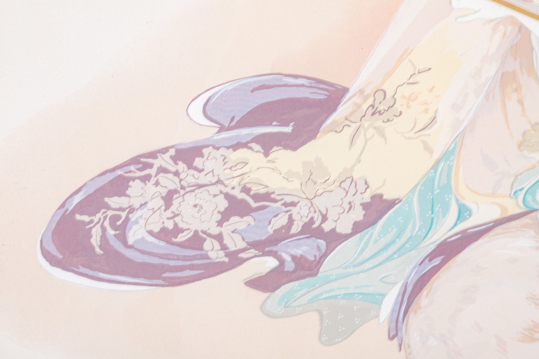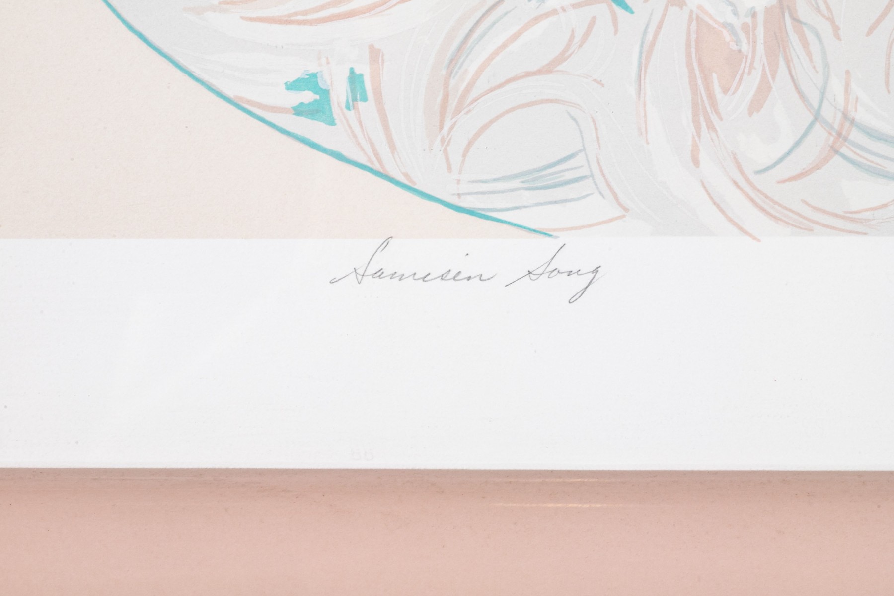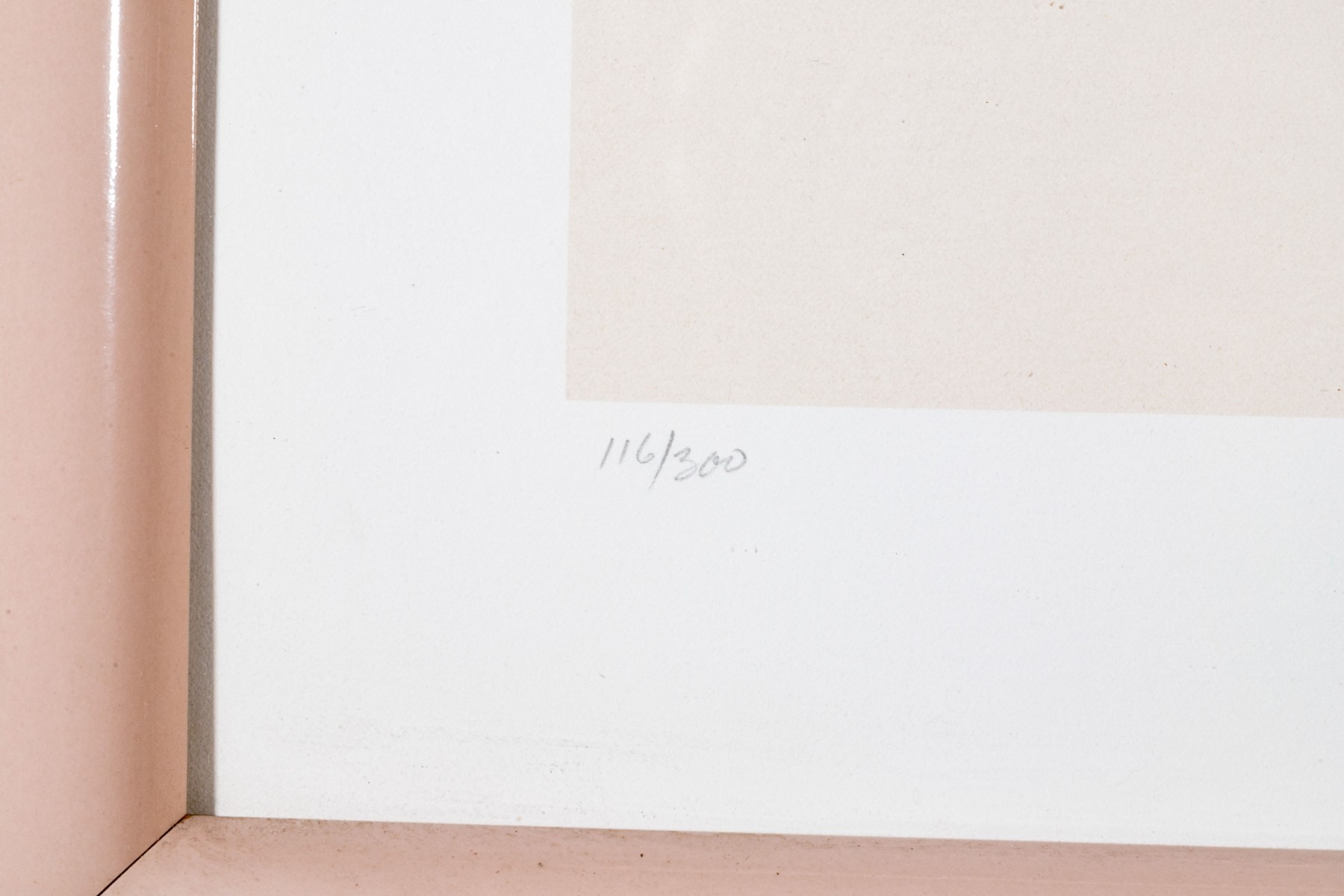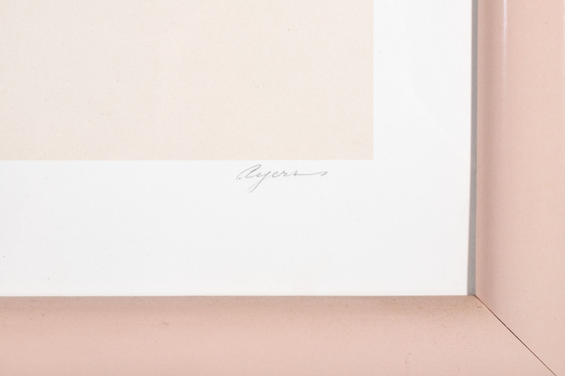 Presented in a pink/peach laminated enamel frame, glazed.