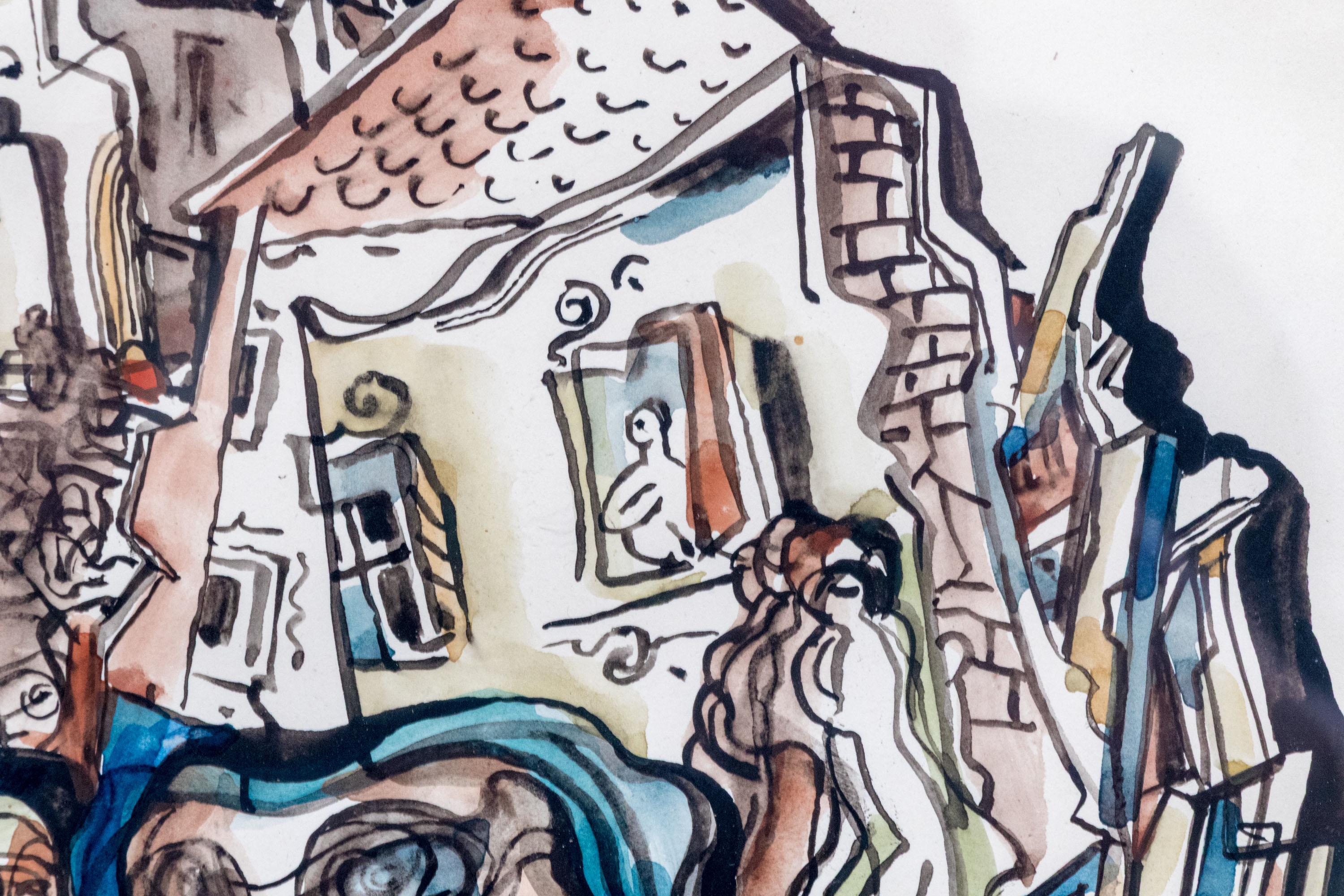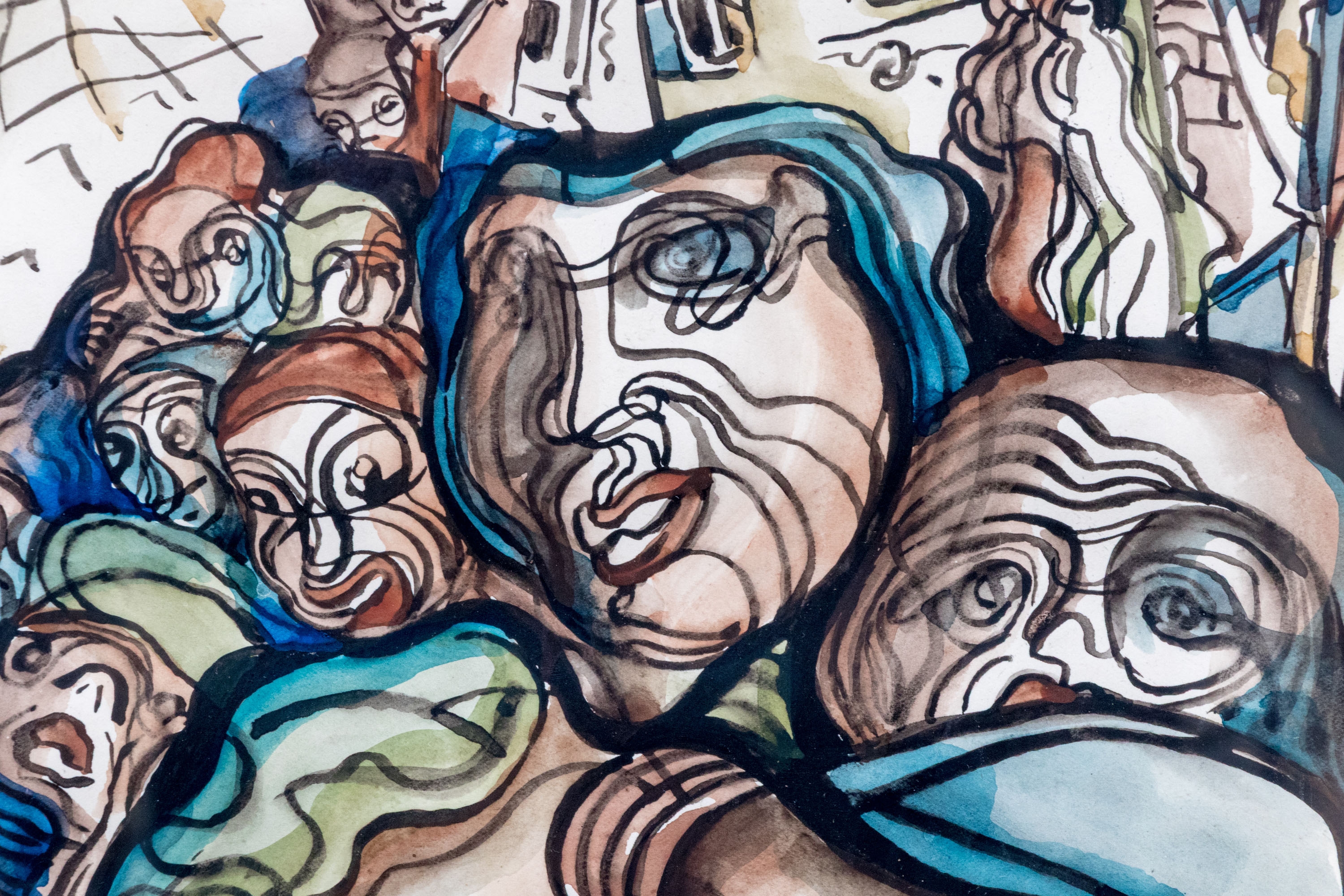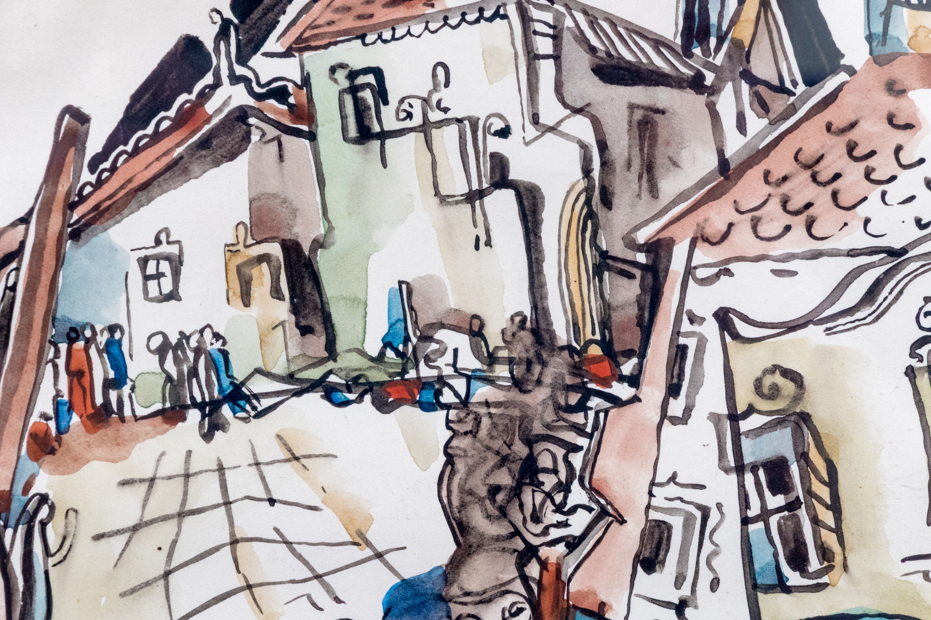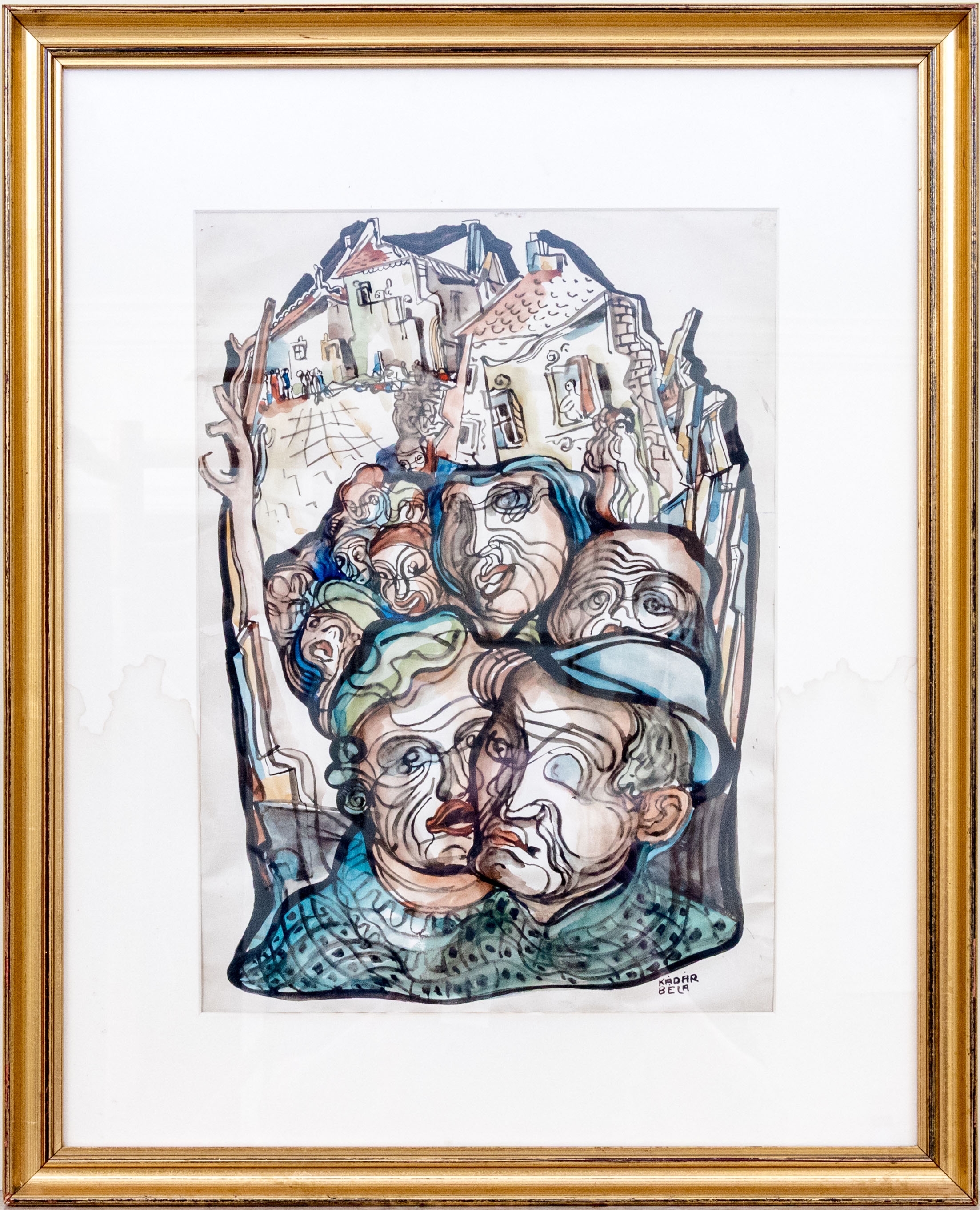 Béla Kádár (Hungarian, 1877-1956) watercolor painting on paper depicting a futurist and cubist composition with a crowd of people approaching the foreground rendered with expressive linework and rich color. The scene features a perspective view into a village in the background. Signed lower right.