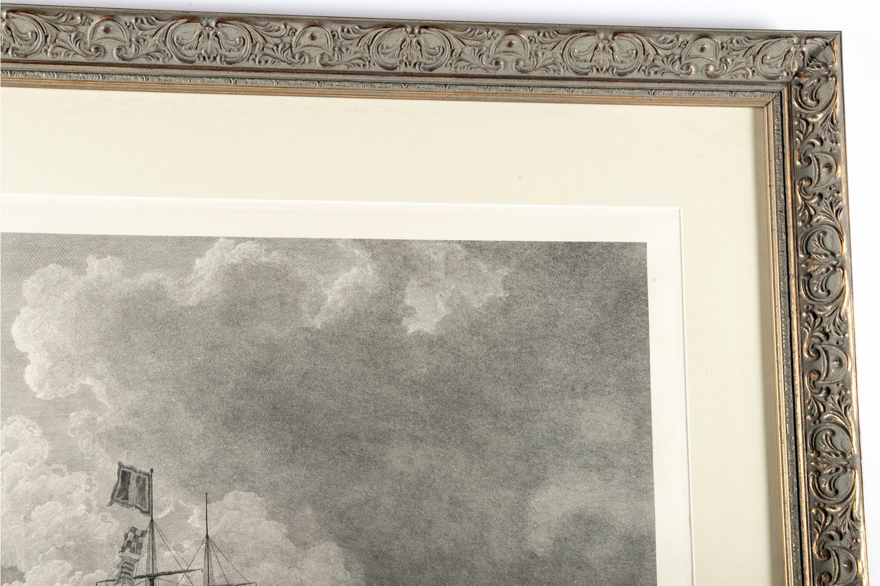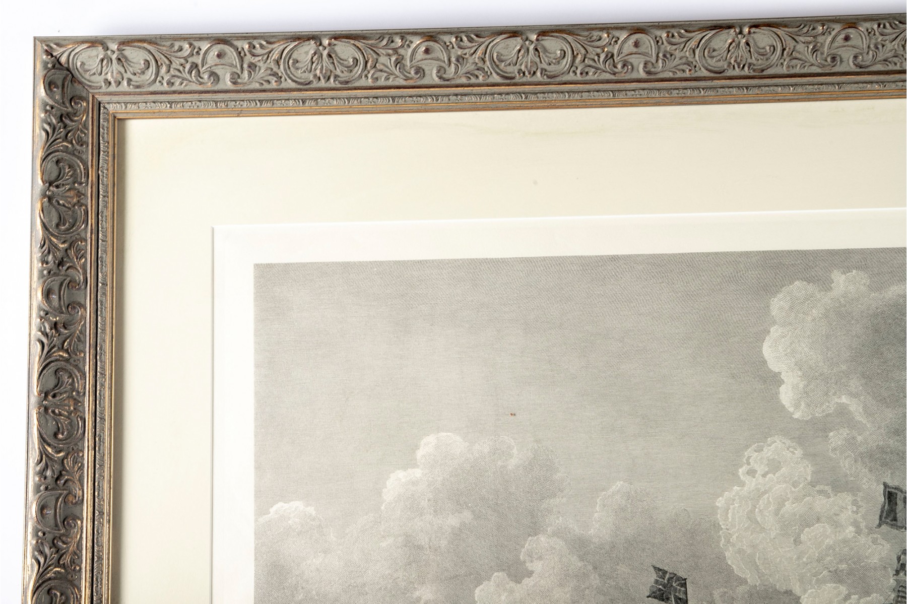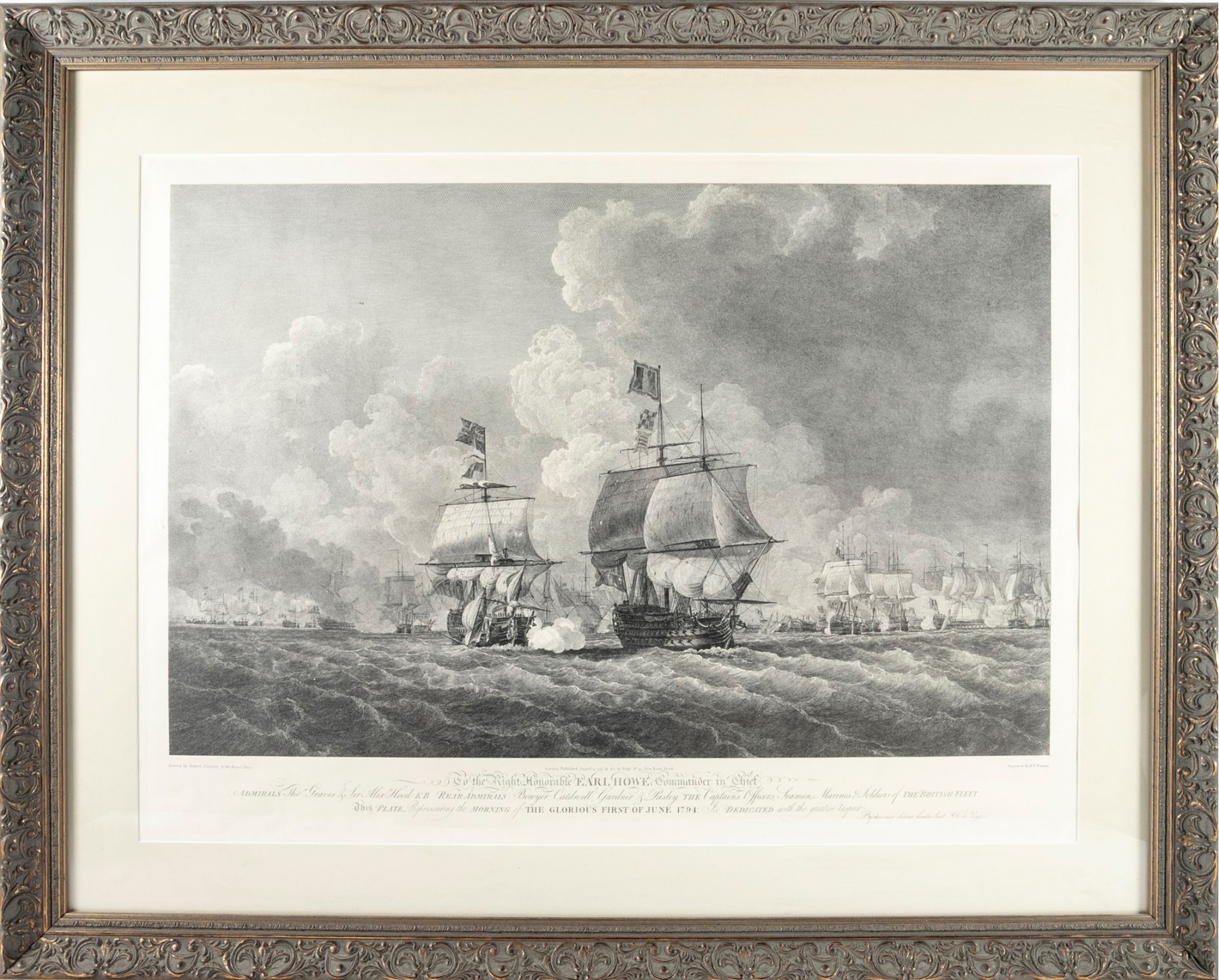 Benjamin Thomas Pouncy (English, 1750-1799) engraving of Robert Cleveley (English, 1747-1809) "The Glorious First of June 1794" depicting a fleet of large ships on a vast ocean scaled by a vaster sky full of billowing clouds. Sculpt and del lower left and lower right, titled lower center. Displayed behind glass with a white mat in a gray-washed gilt frame with elegant scrolled relief throughout.