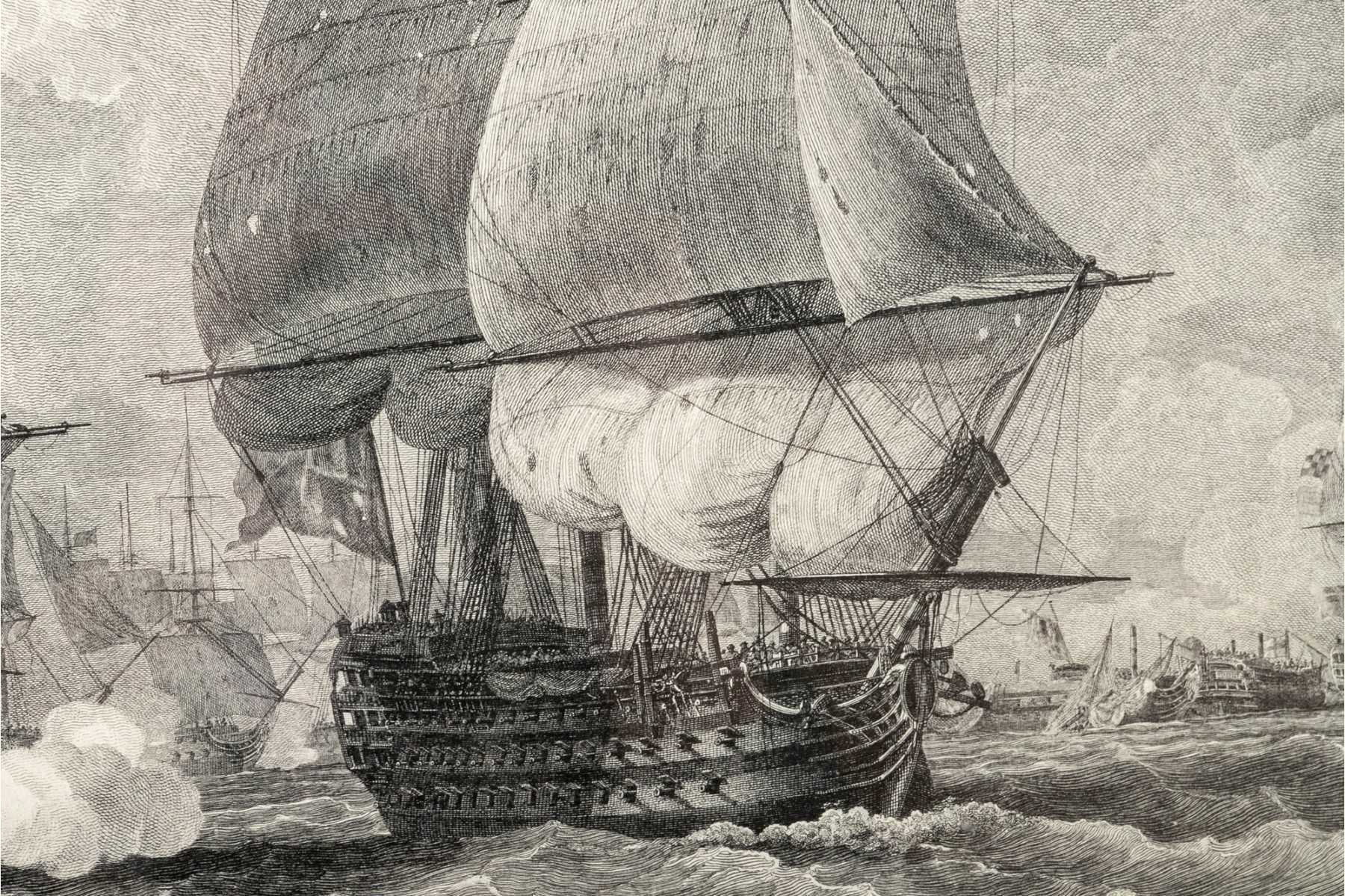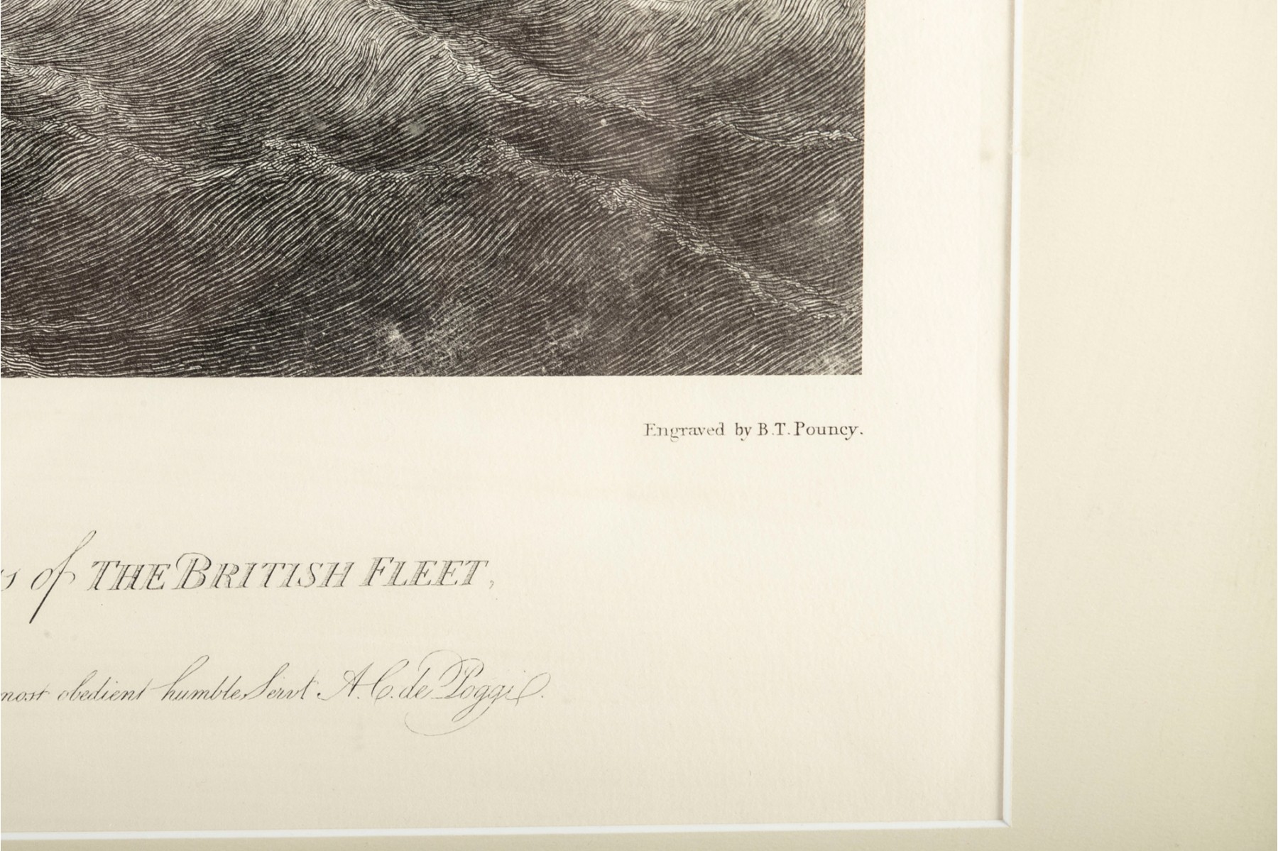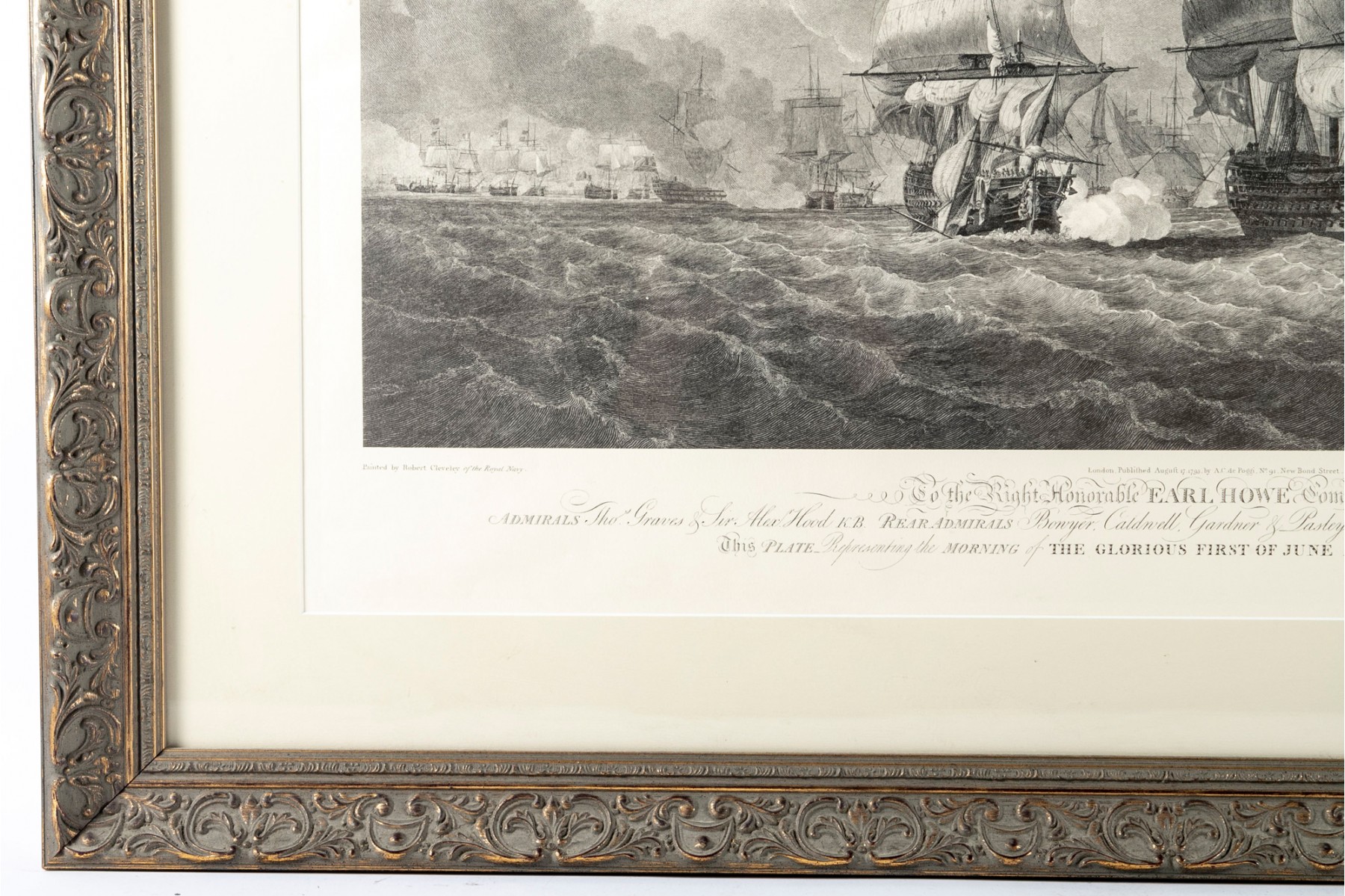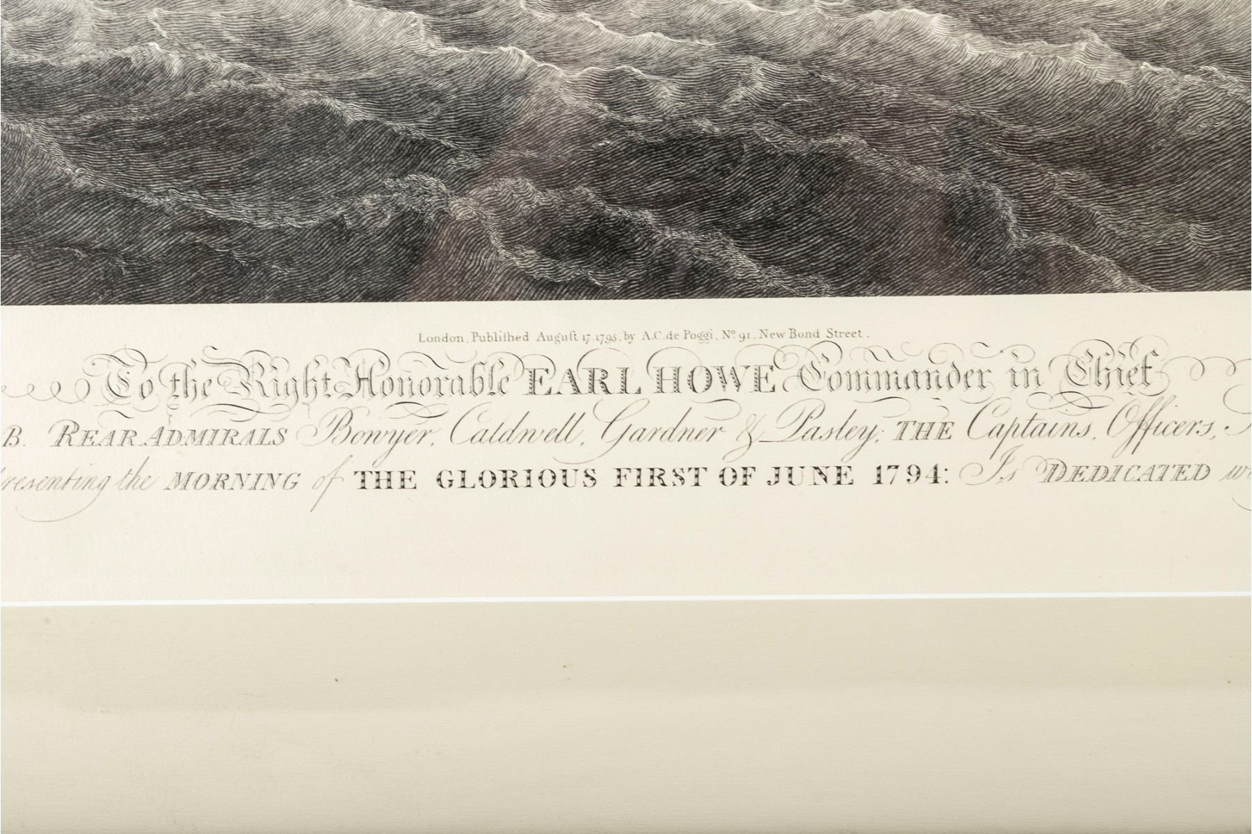 Benjamin Thomas Pouncy (English, 1750-1799) engraving of Robert Cleveley (English, 1747-1809) "The Glorious First of June 1794" depicting a fleet of large ships on a vast ocean scaled by a vaster sky full of billowing clouds. Sculpt and del lower left and lower right, titled lower center. Displayed behind glass with a white mat in a gray-washed gilt frame with elegant scrolled relief throughout.