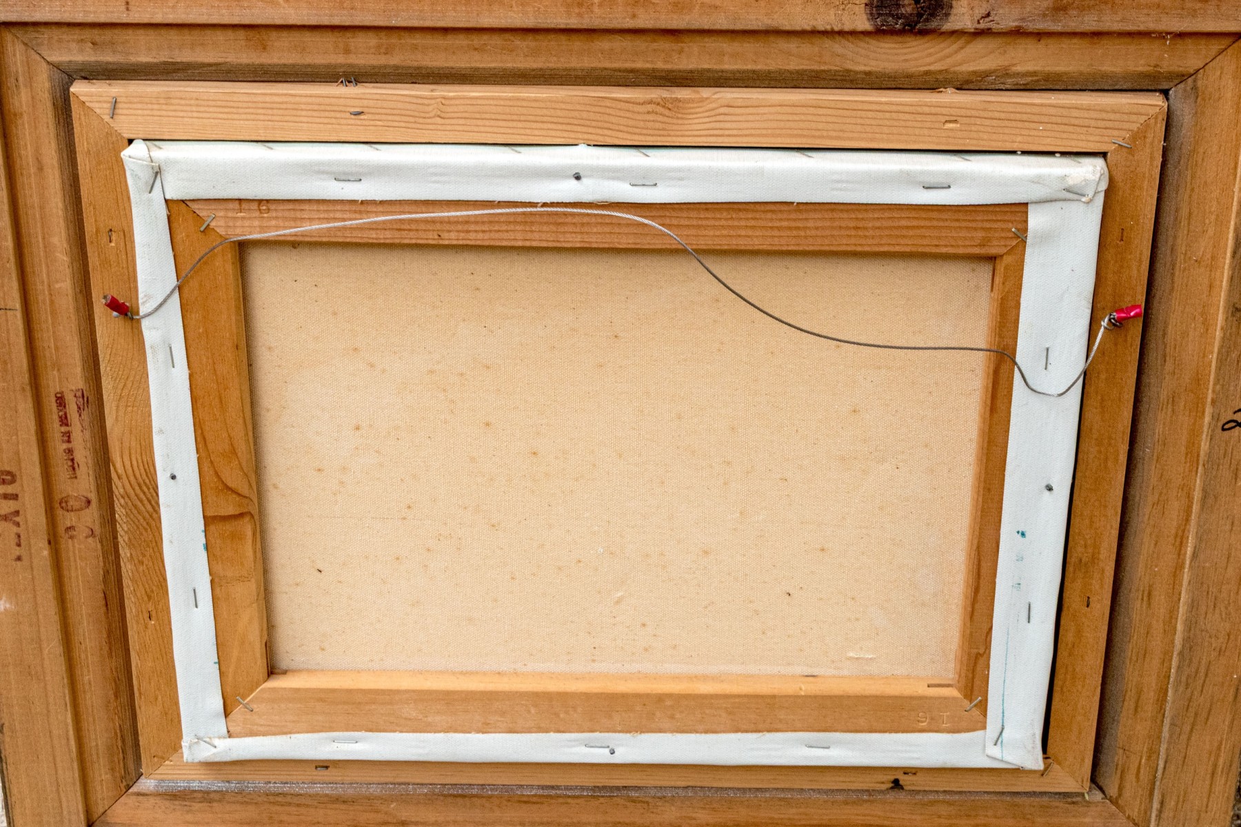A tear to the lower left quadrant 1/2" long with a smaller loss below. Wear to the painted finish with white paint splatter to lower trim and stained spots to filet.