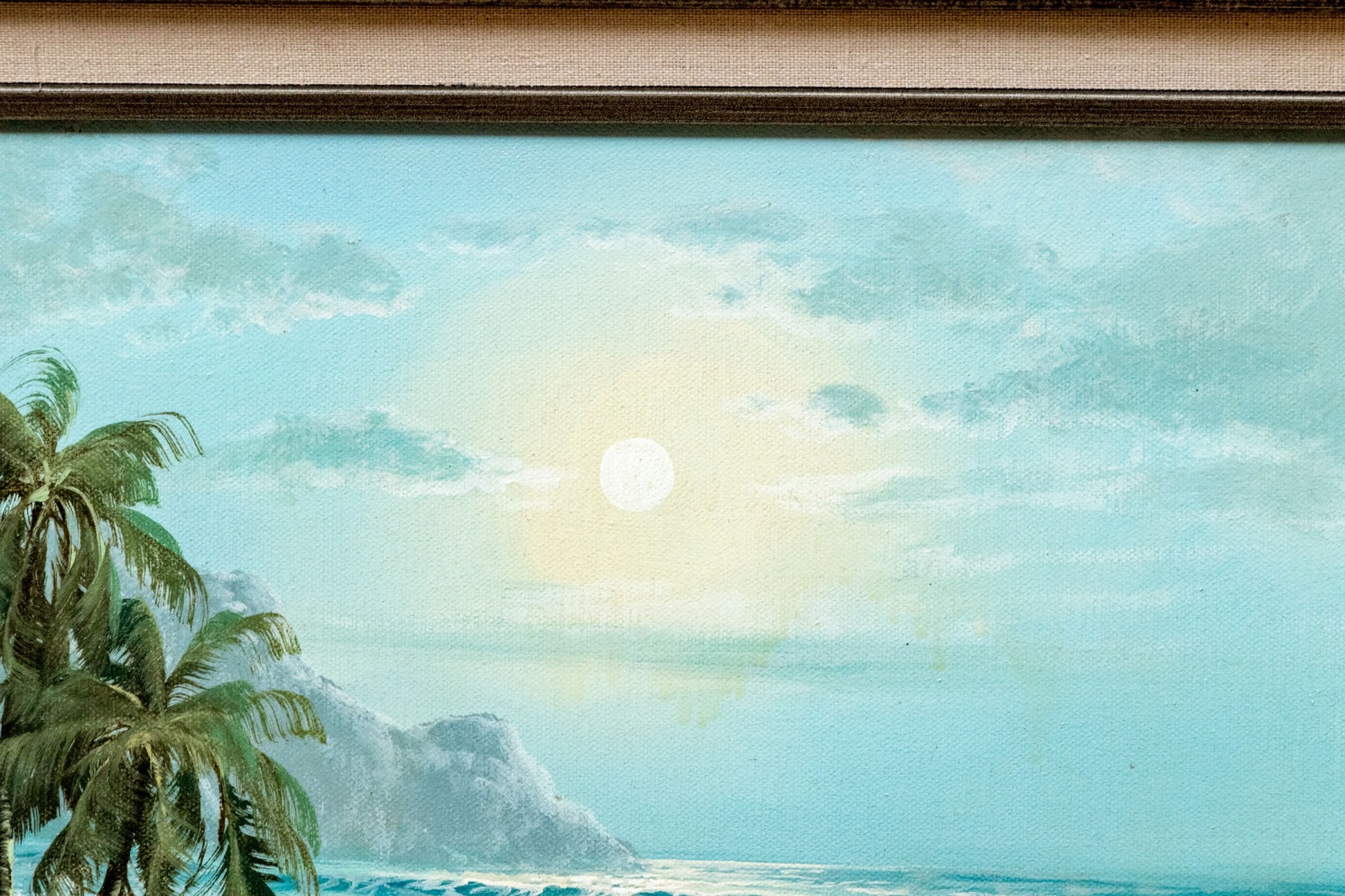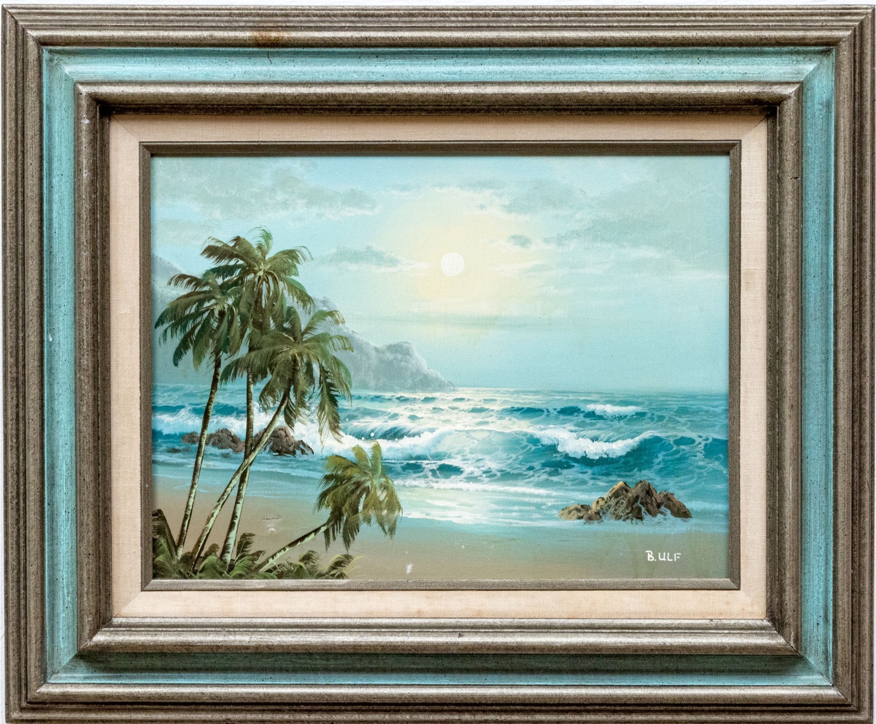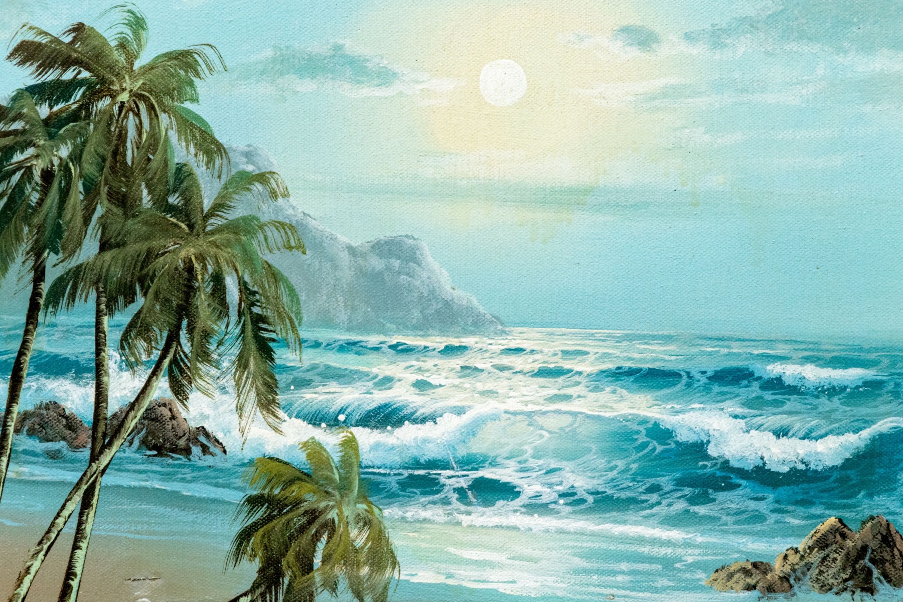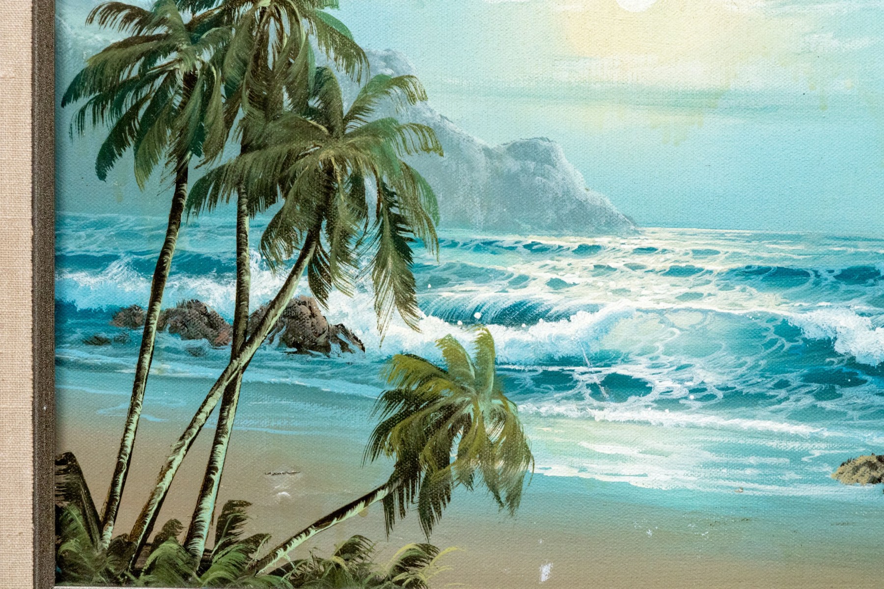 Signed in white lower right. The artist has handsomely painted a tropical, coastal landscape with palm trees, waves crashing into the beach with mountainous range in the distance with the sun setting or rising to upper center.
