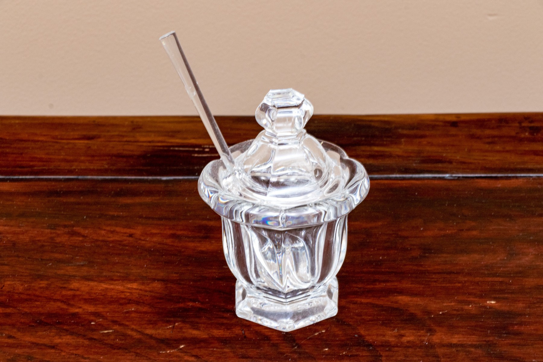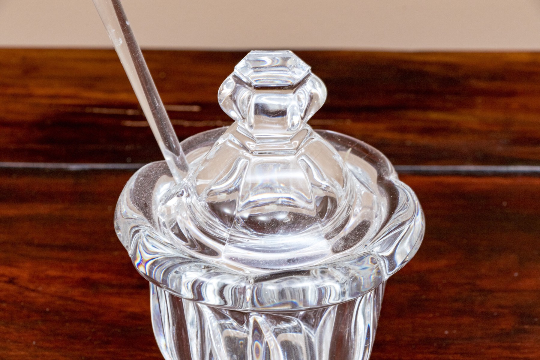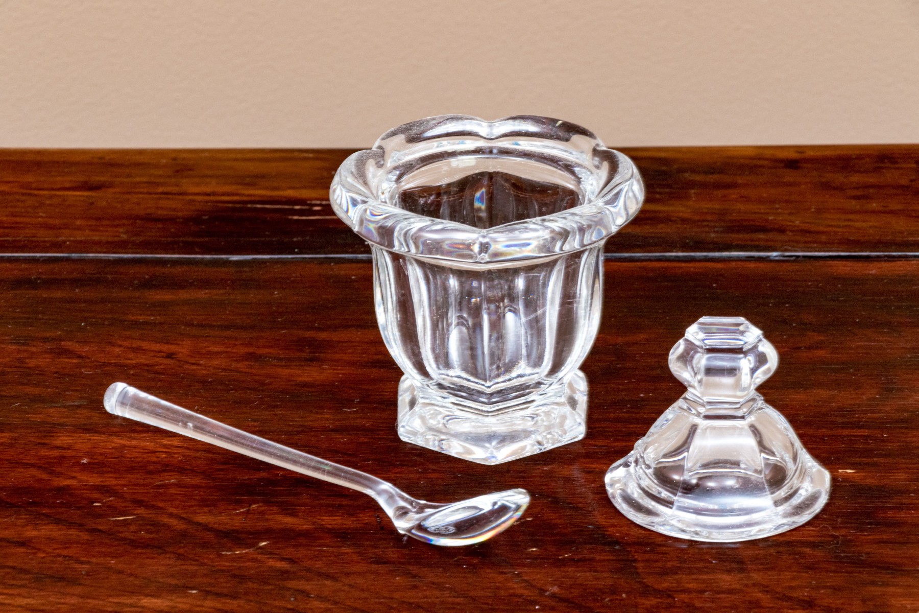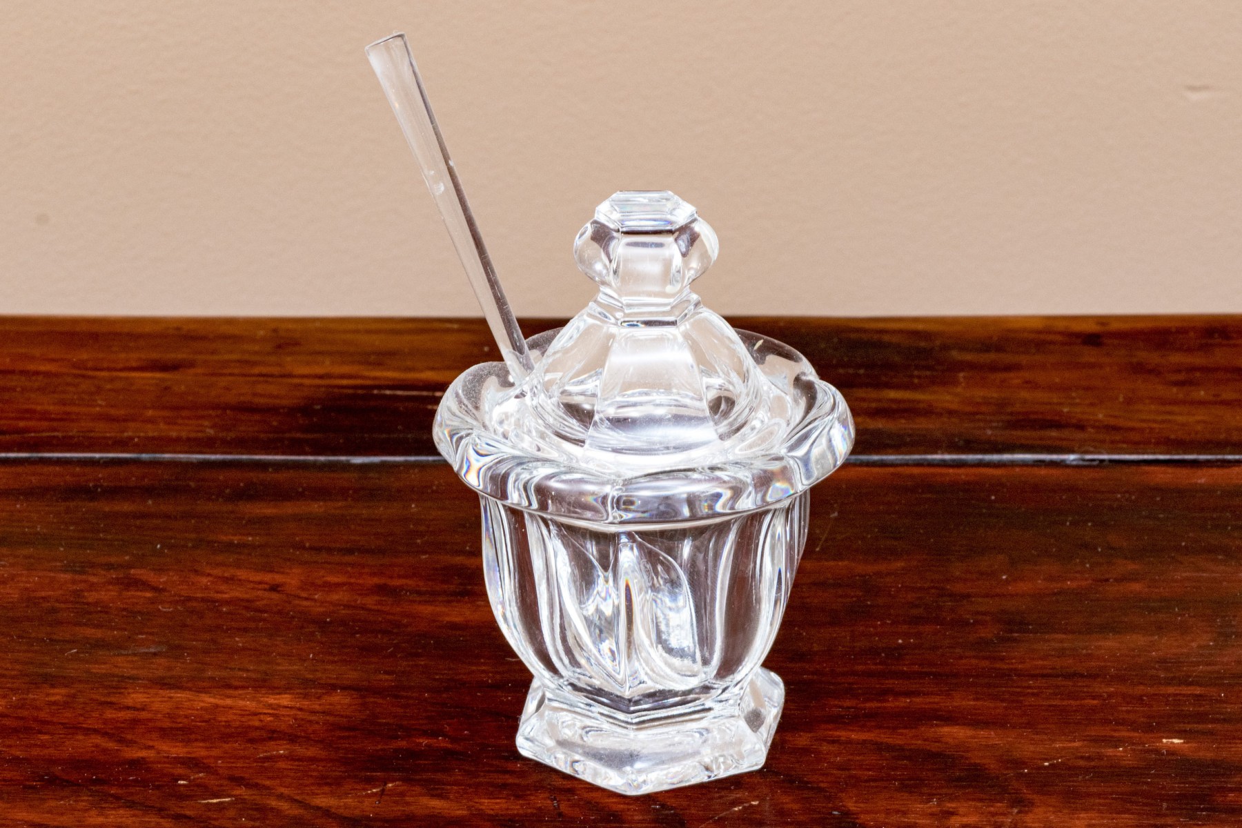 Vintage Baccarat Crystal mustard jar with spoon, marked beneath.