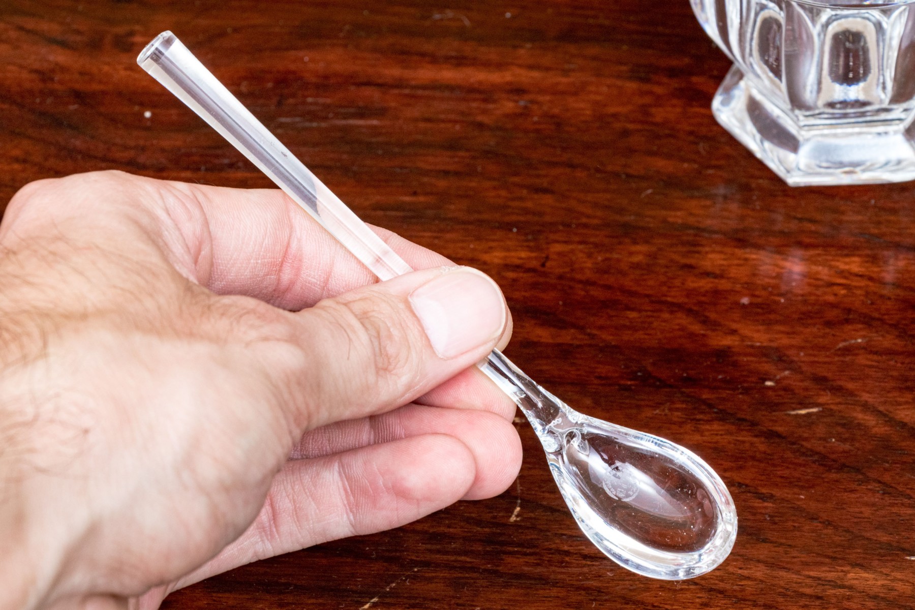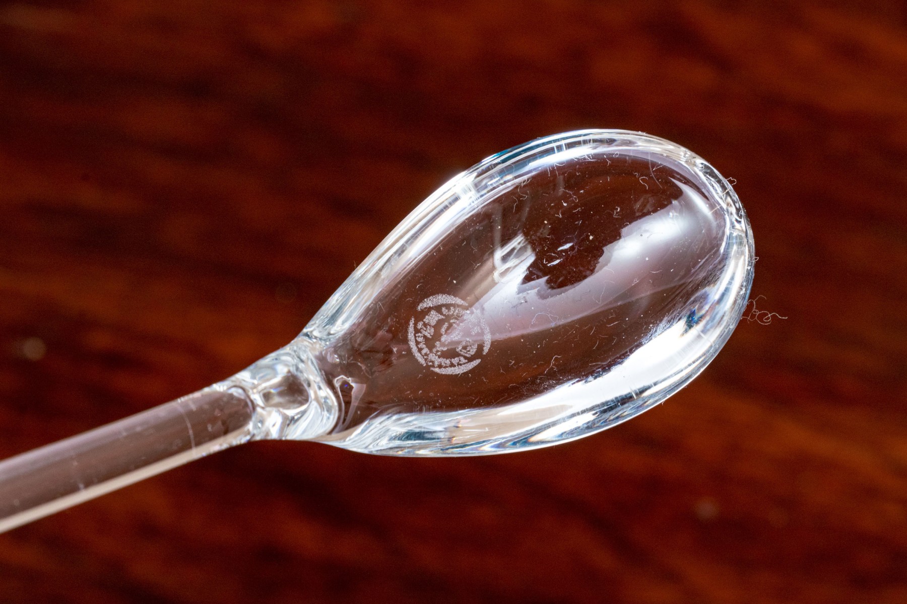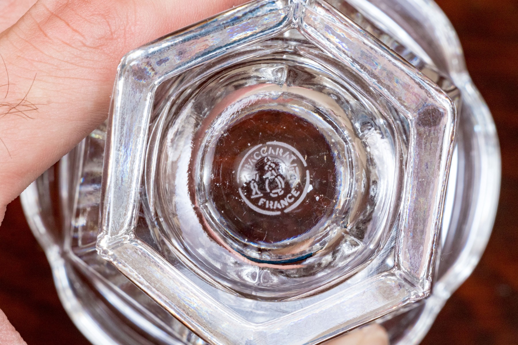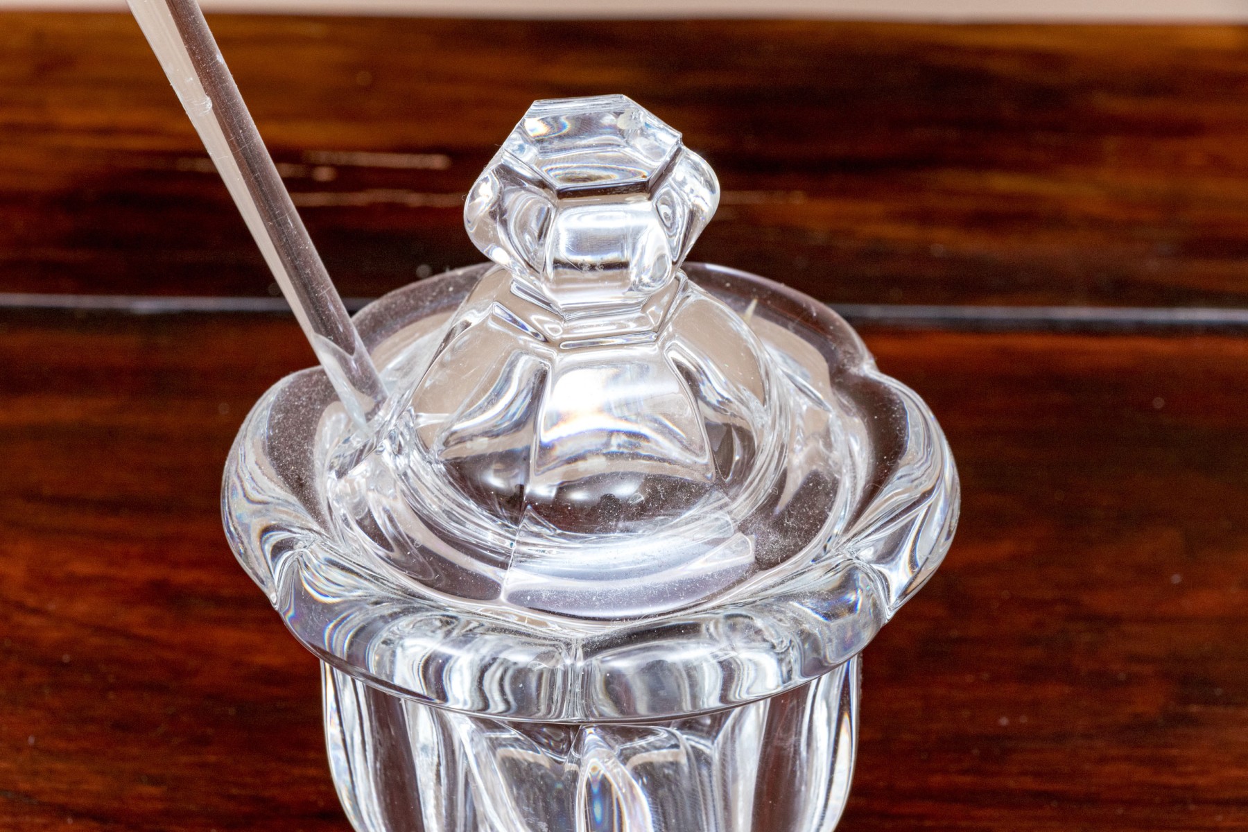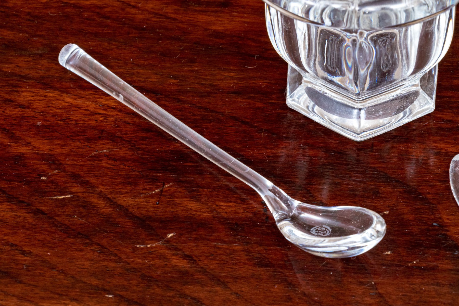 Vintage Baccarat Crystal mustard jar with spoon, marked beneath.