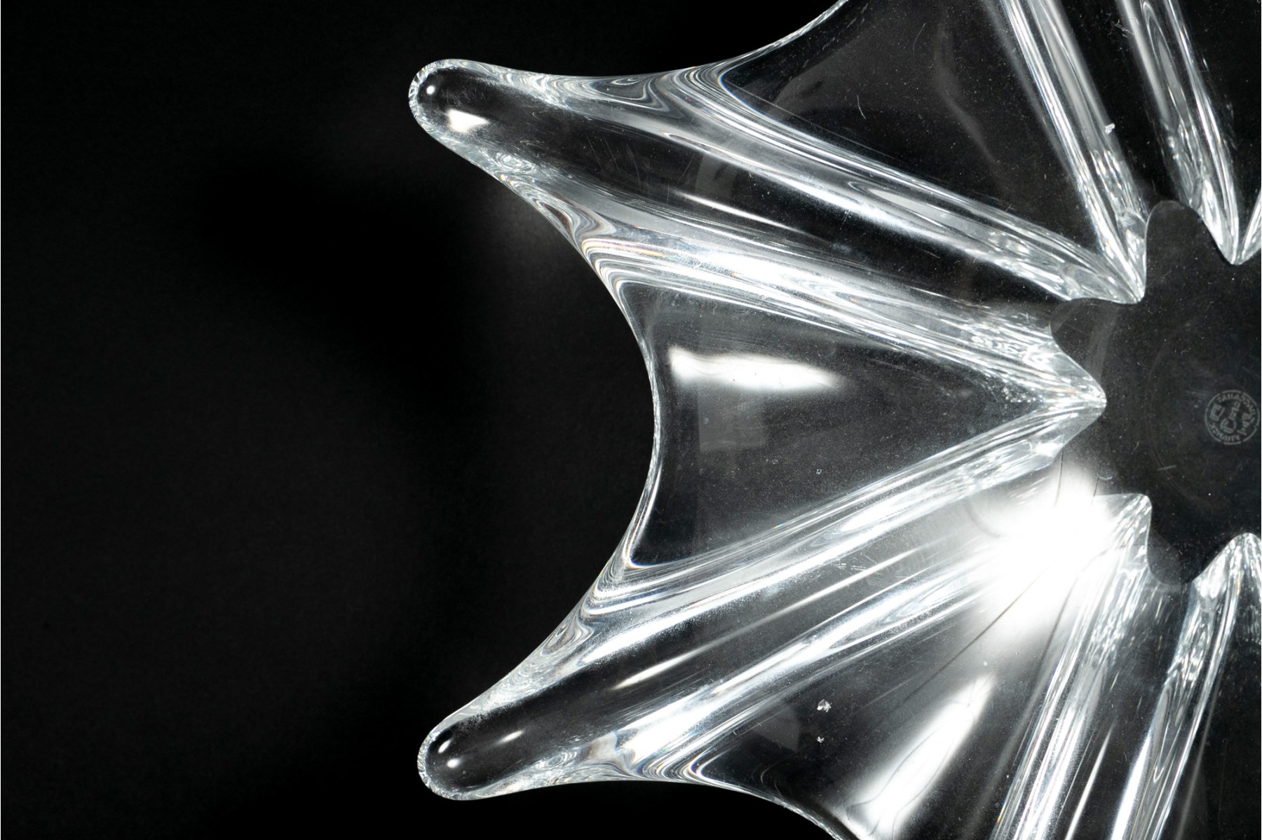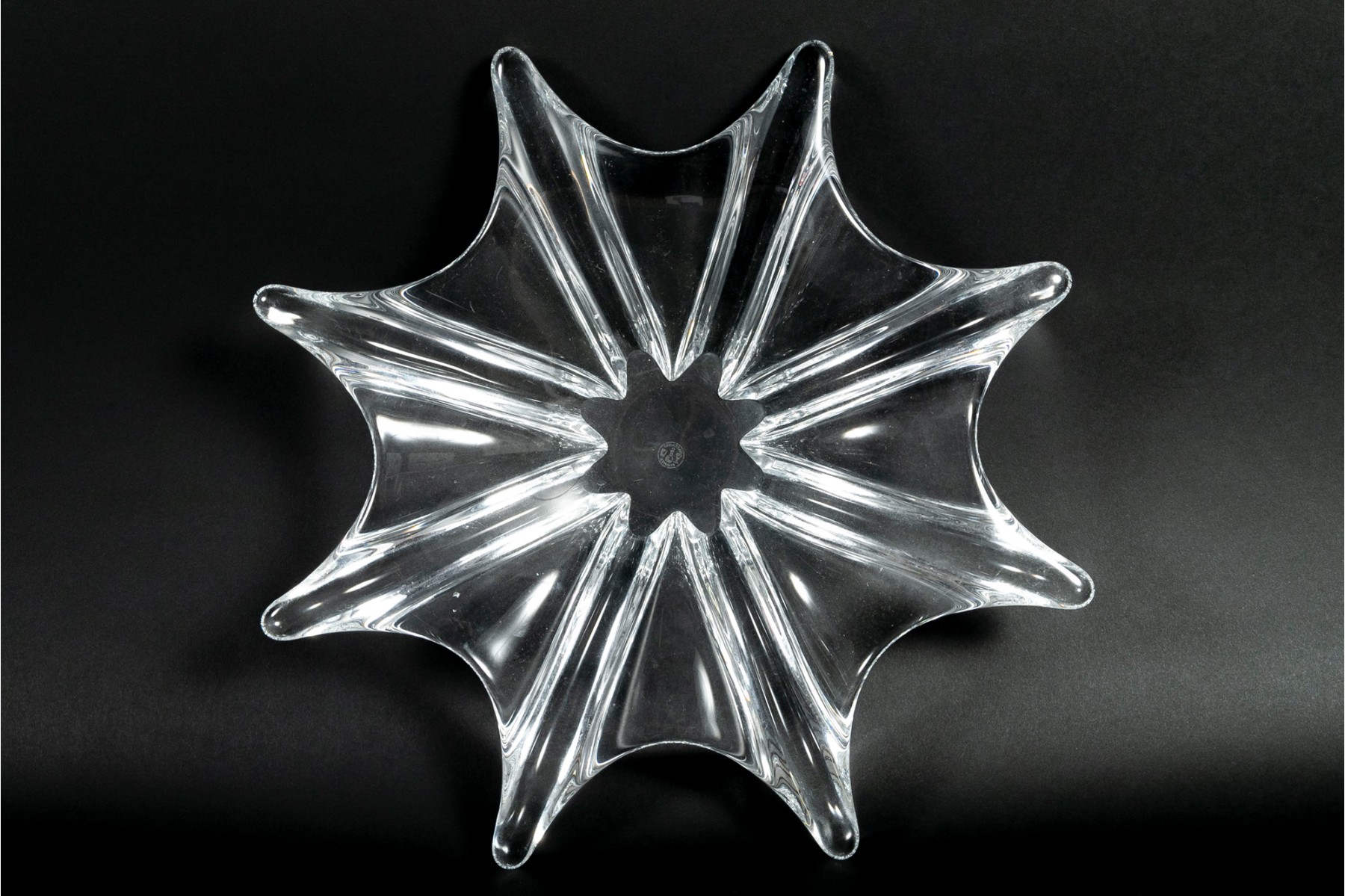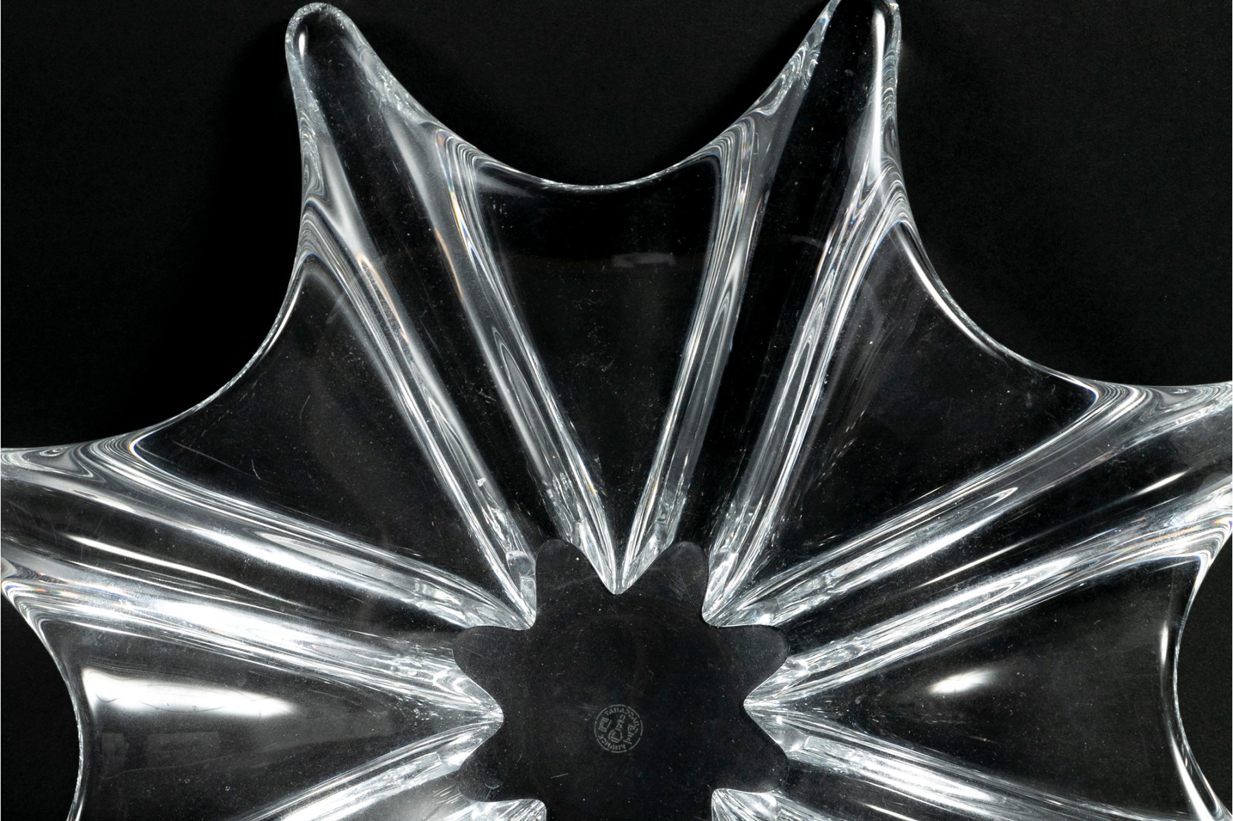 Baccarat Stella crystal centerpiece bowl displaying a beautiful and dramatic starburst form with deep scalloping and gently rounded points following a ribbed exterior.