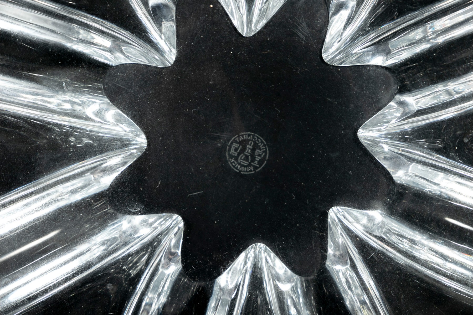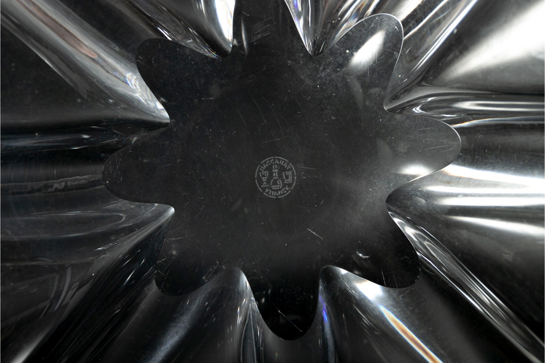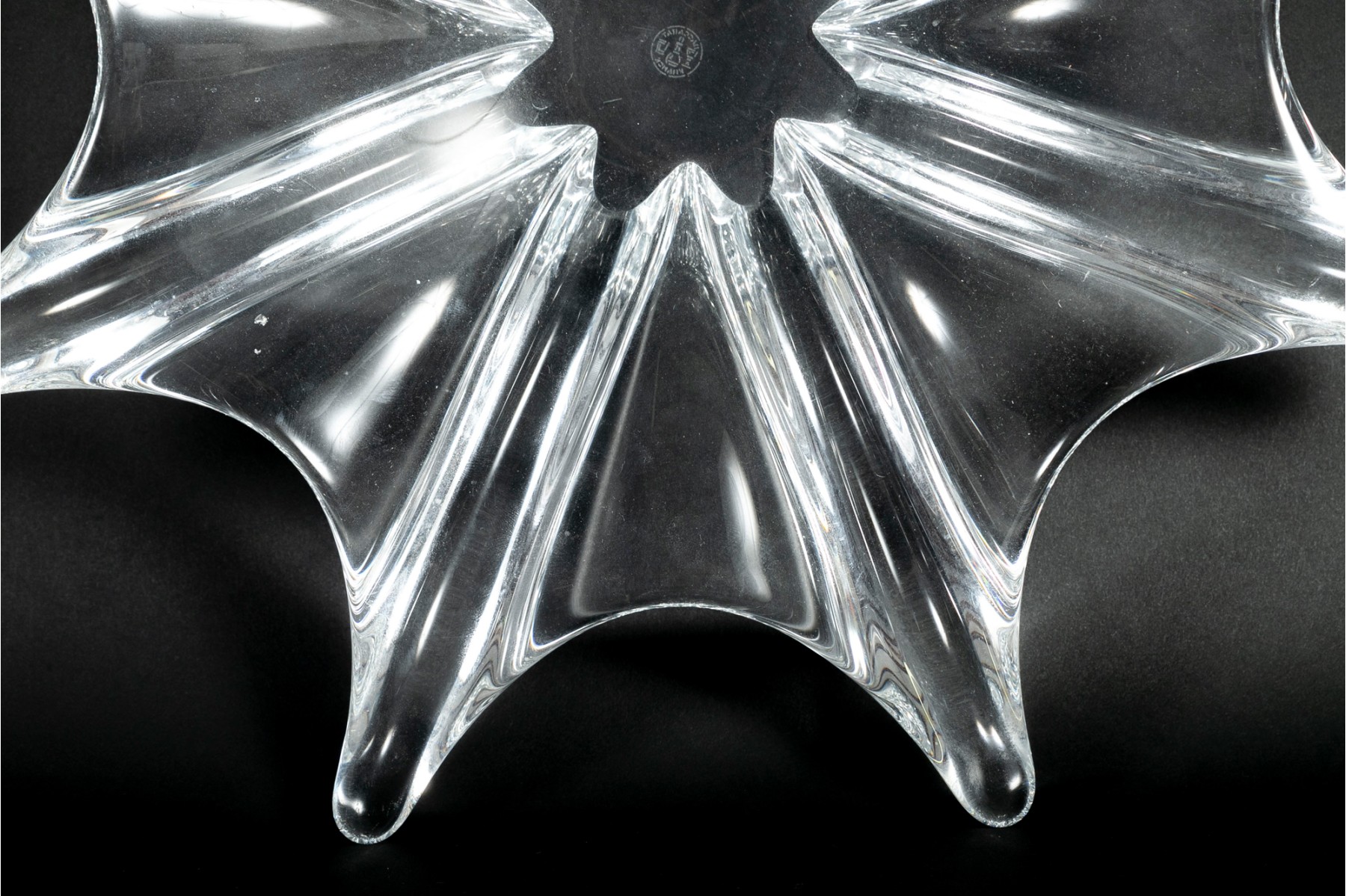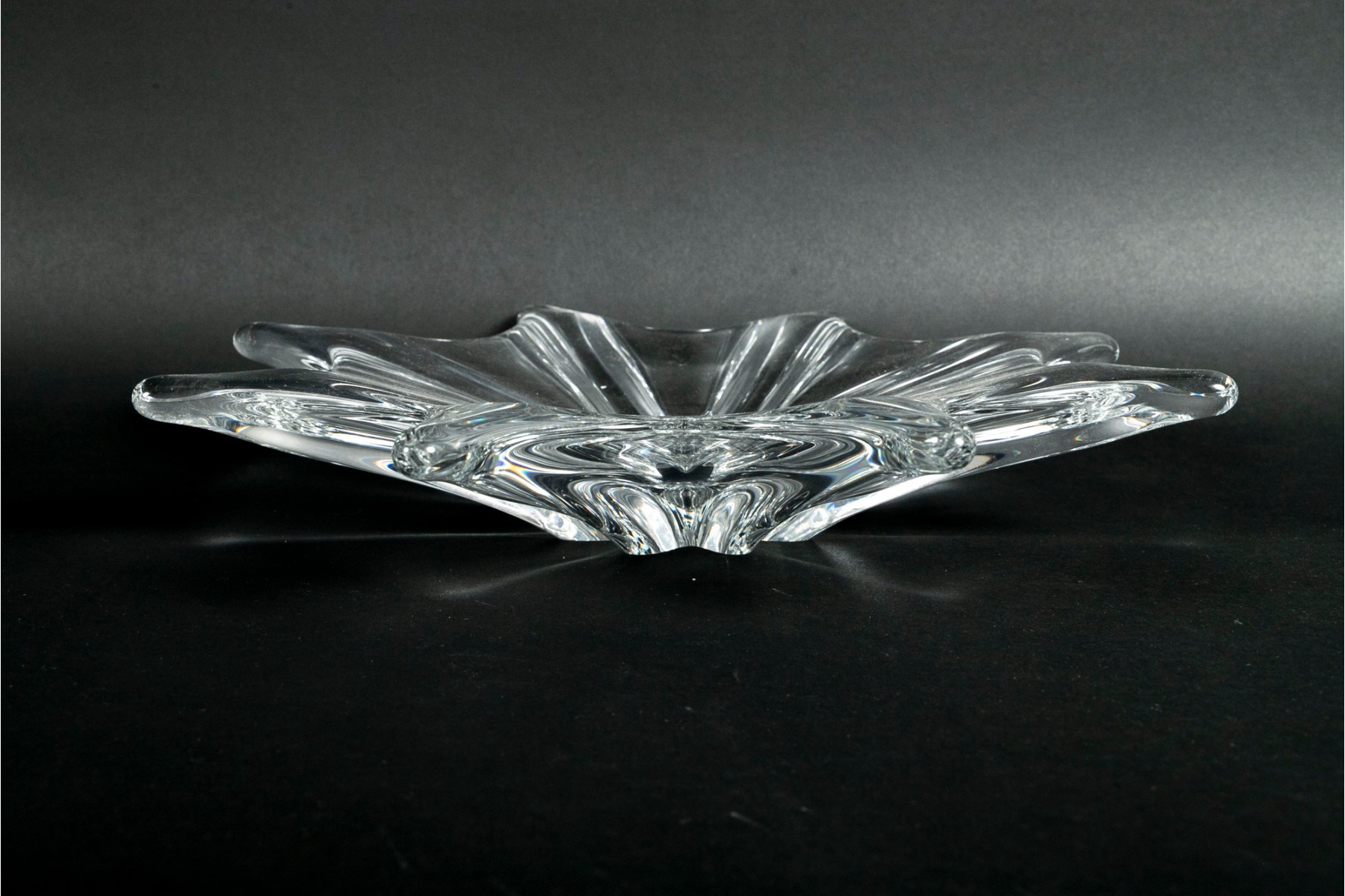 Baccarat Stella crystal centerpiece bowl displaying a beautiful and dramatic starburst form with deep scalloping and gently rounded points following a ribbed exterior.