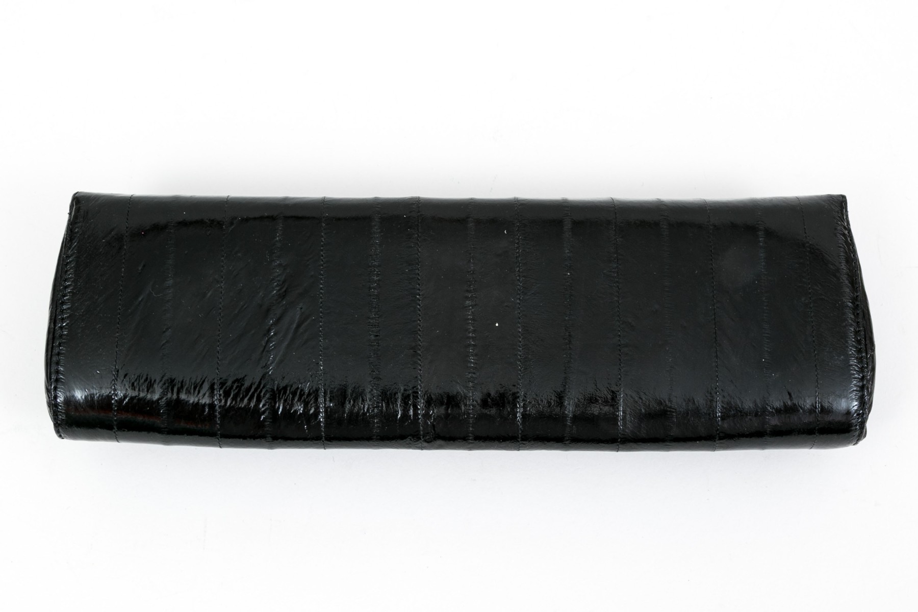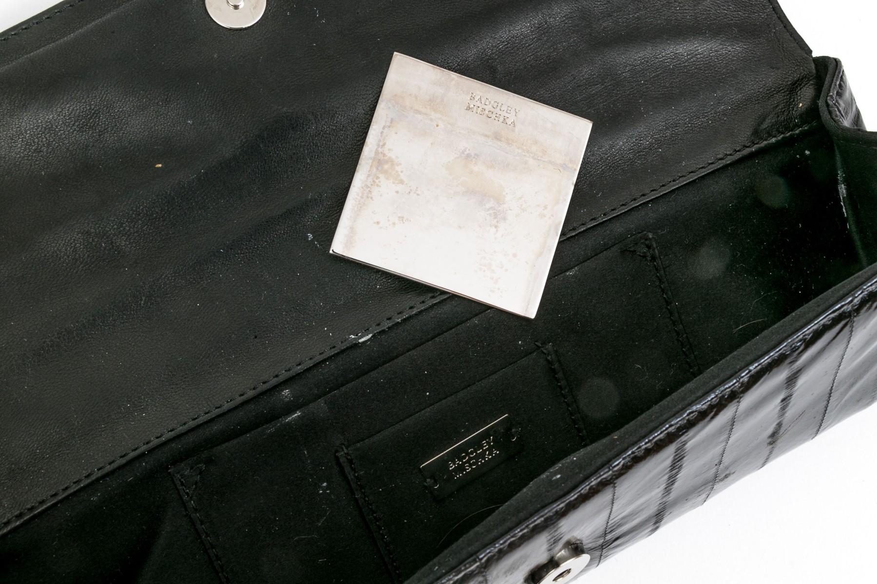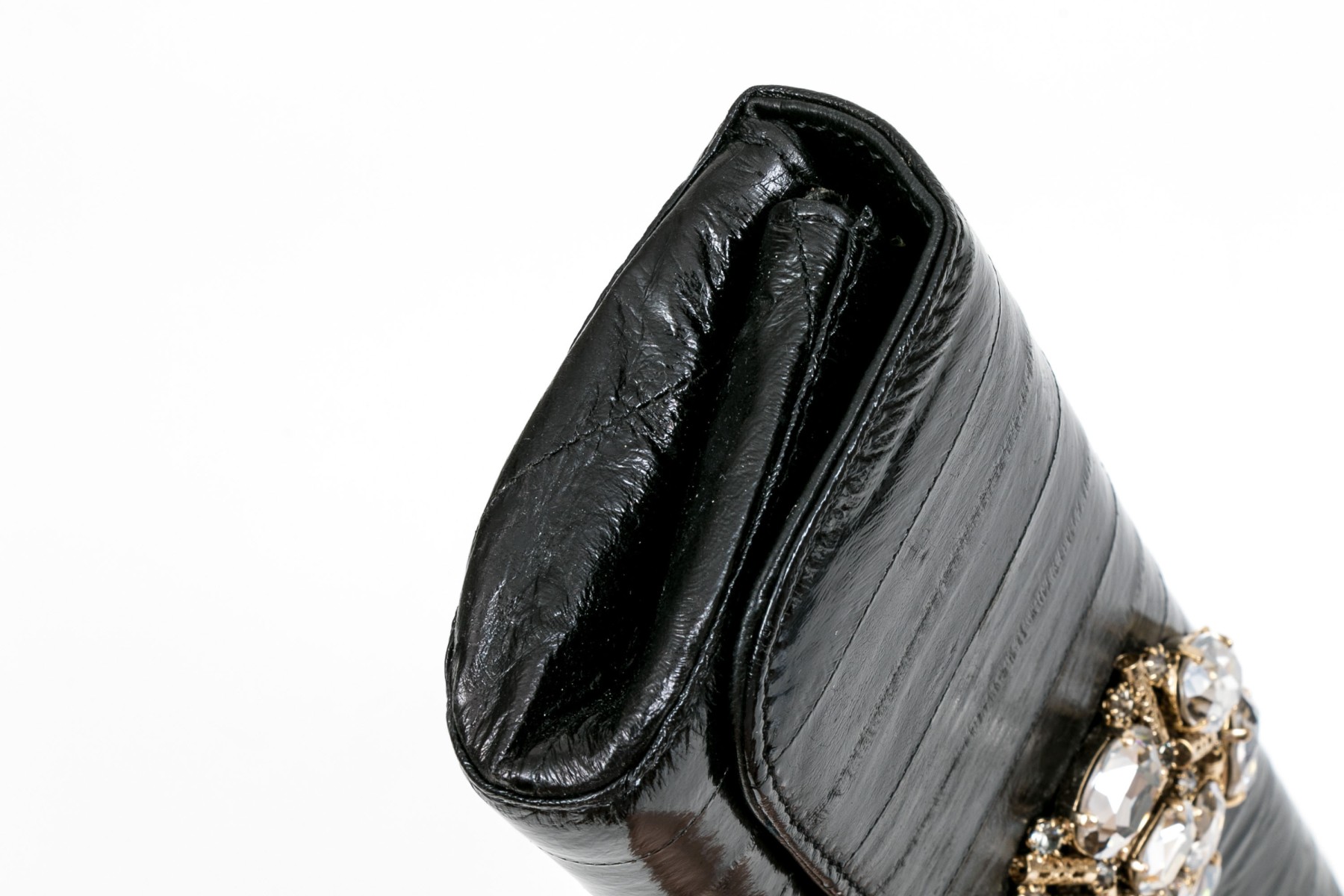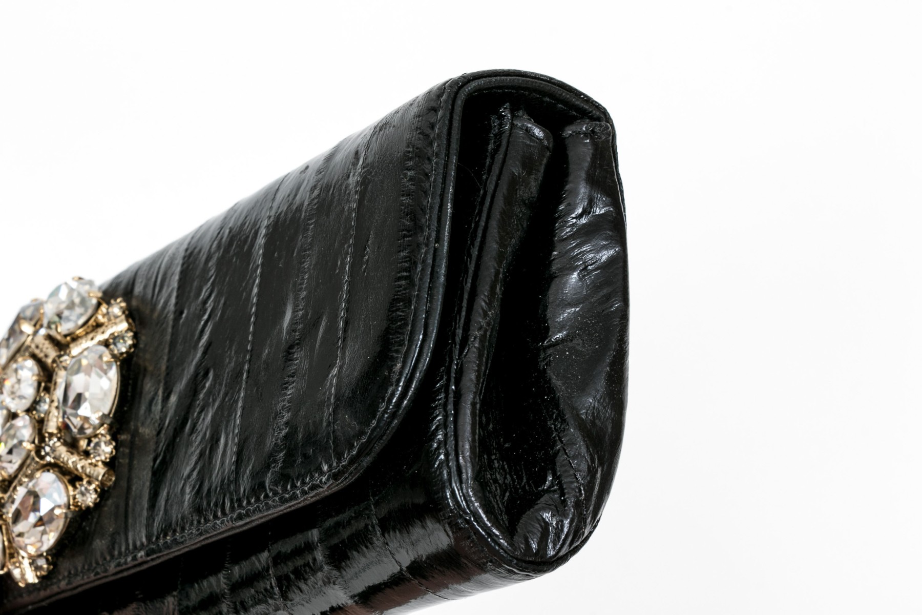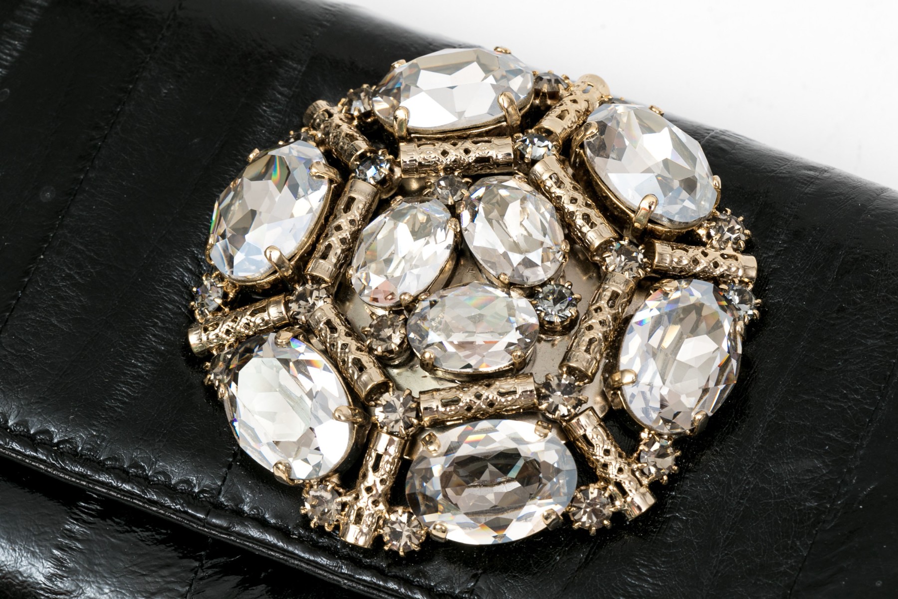 Badgley Mischka beautiful vintage black leather baguette clutch, bedazzled top