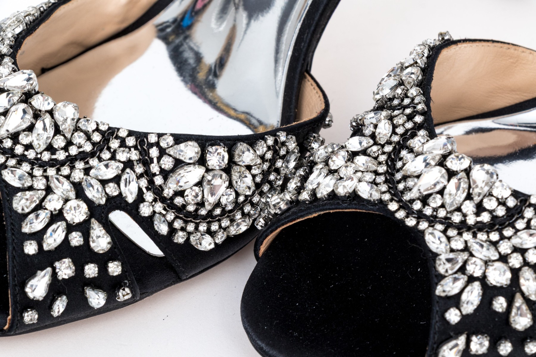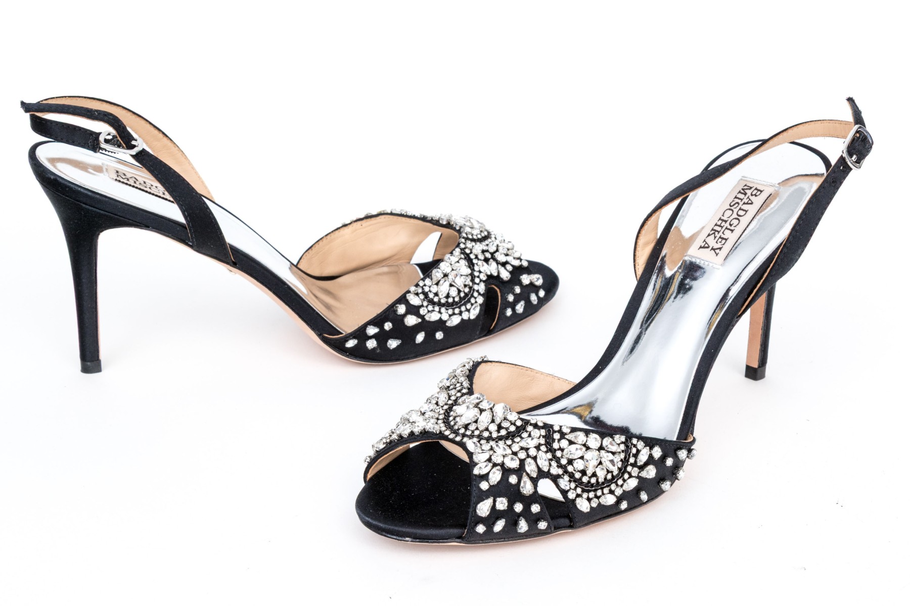 Badgley Mischka stunning black satin and rhinestone peep toe stiletto slingbacks, size 10