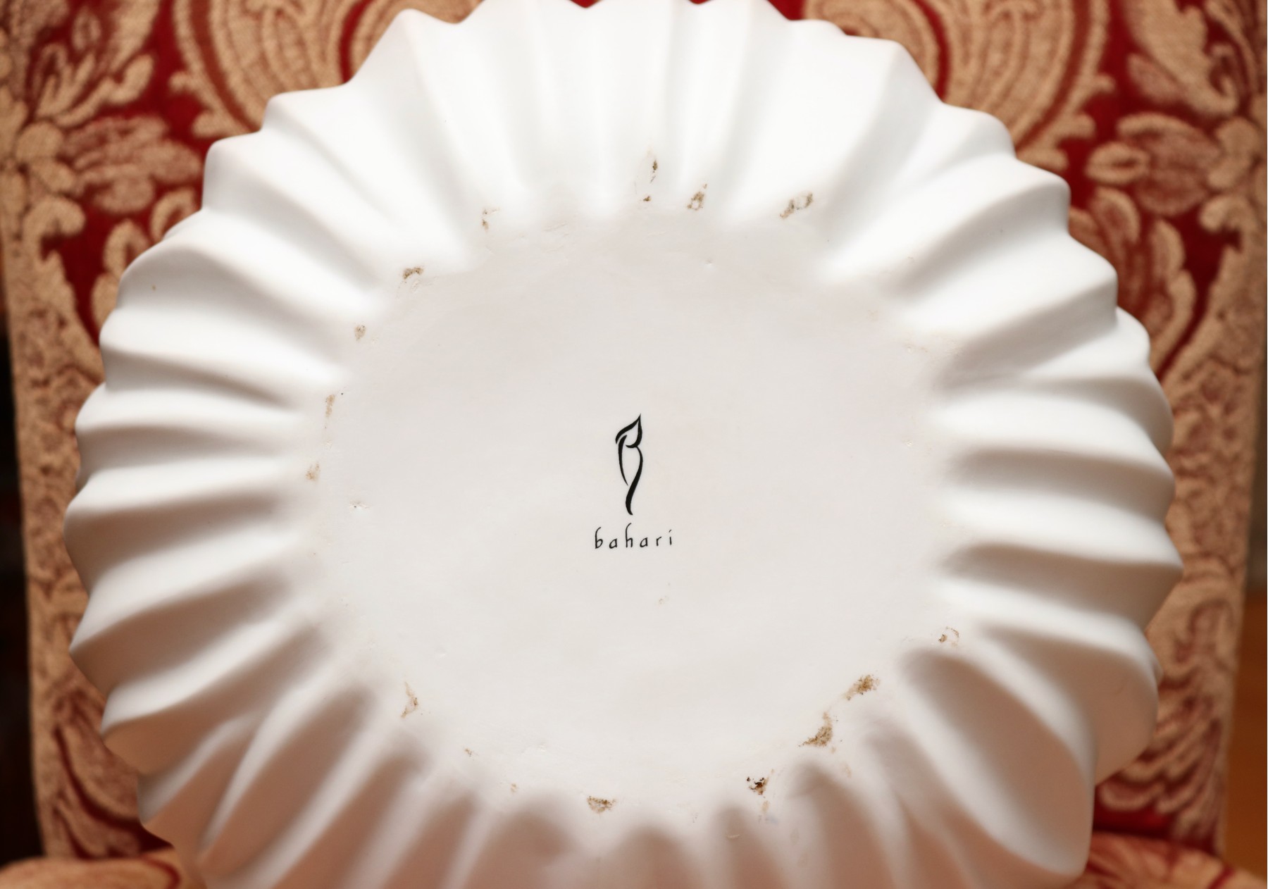 This striking white ceramic vase by Bahari features a softly pleated, organic silhouette that evokes the fluid motion of wind or water. With its matte exterior and sculptural form, this piece is a modern statement on its own or as a vessel for minimalist arrangements. The undulating contours cast subtle shadows that shift with the light, making it a beautiful focal point in any contemporary or coastal-inspired setting. Signed on the underside.