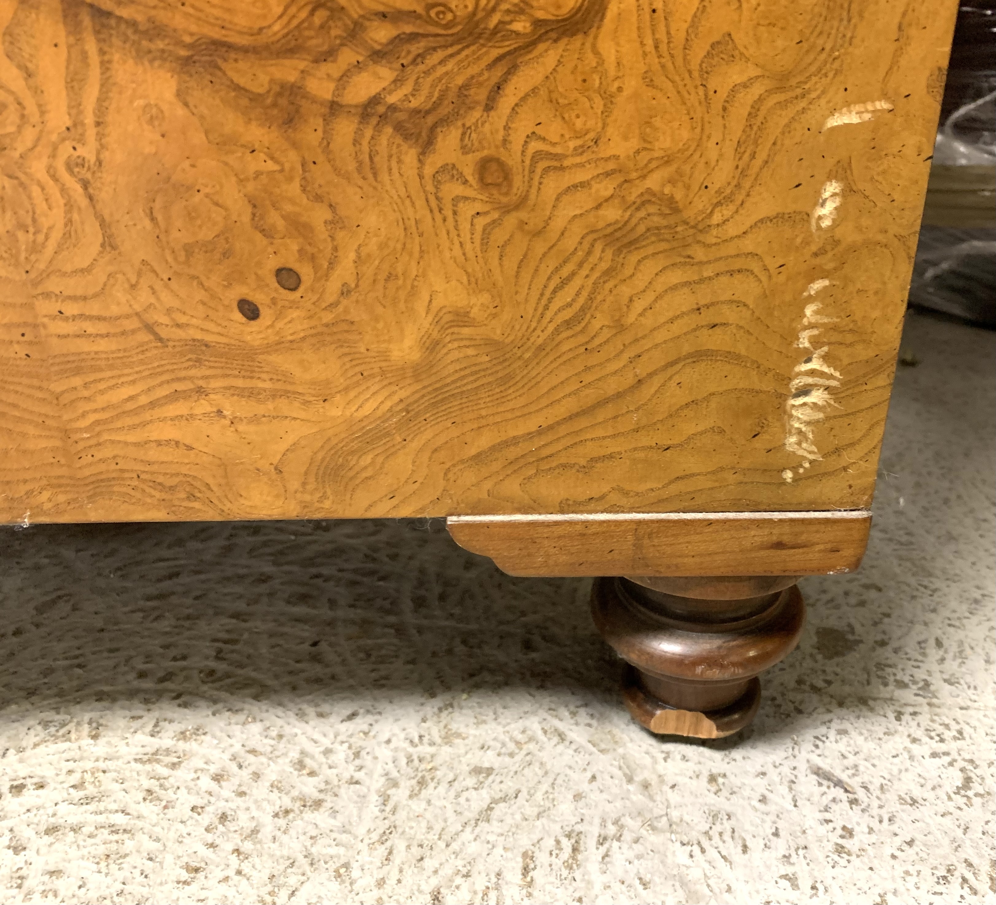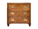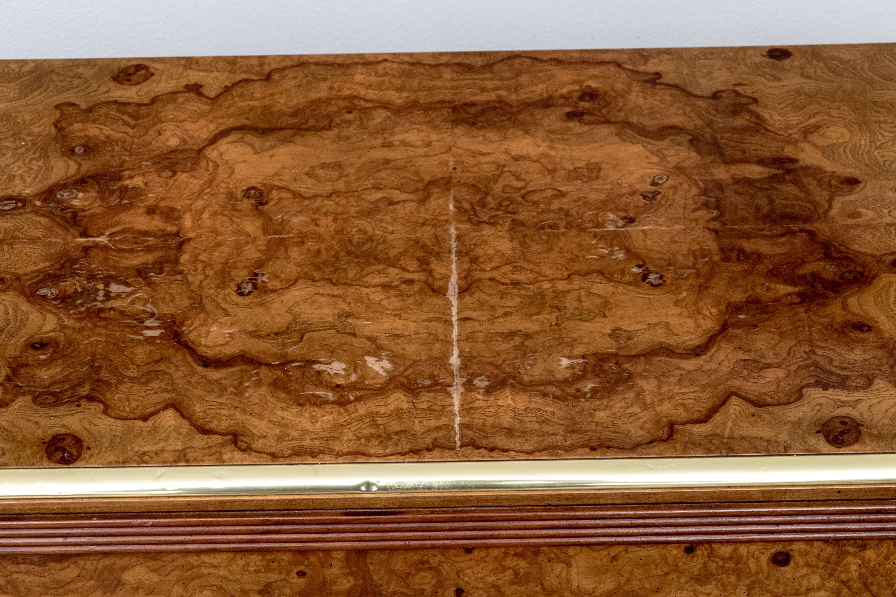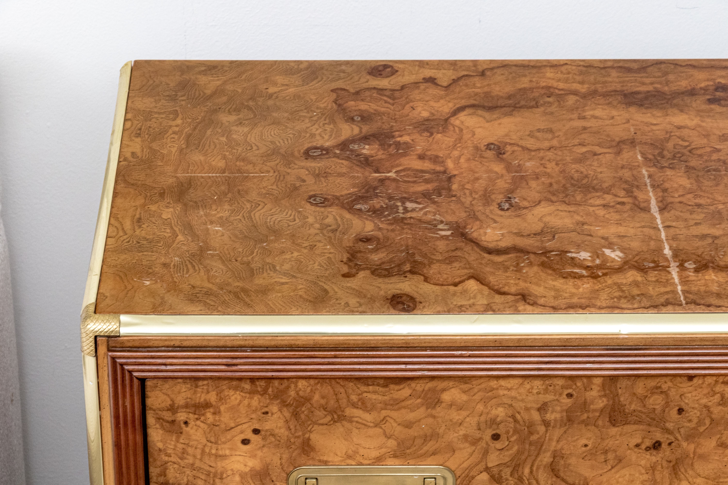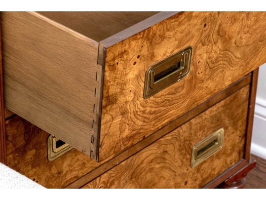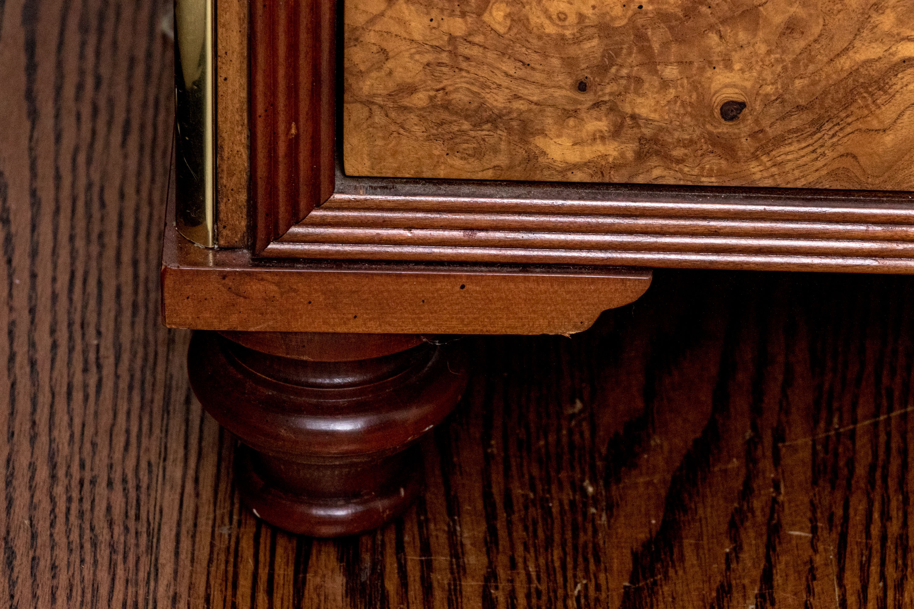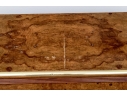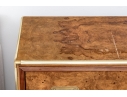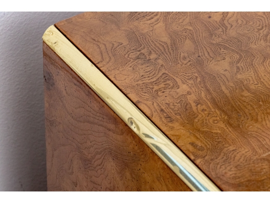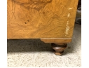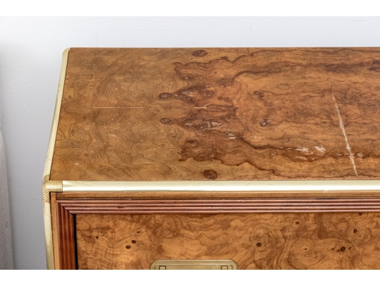 Condition: Various signs of age include wear along the seams of the quartered burl veneer, small dents along the brass trim, gouge to lower right and chip to back foot. Despite the wear the Chest retains a refined presentation. Please see photos for details of condition.