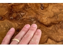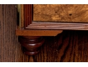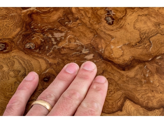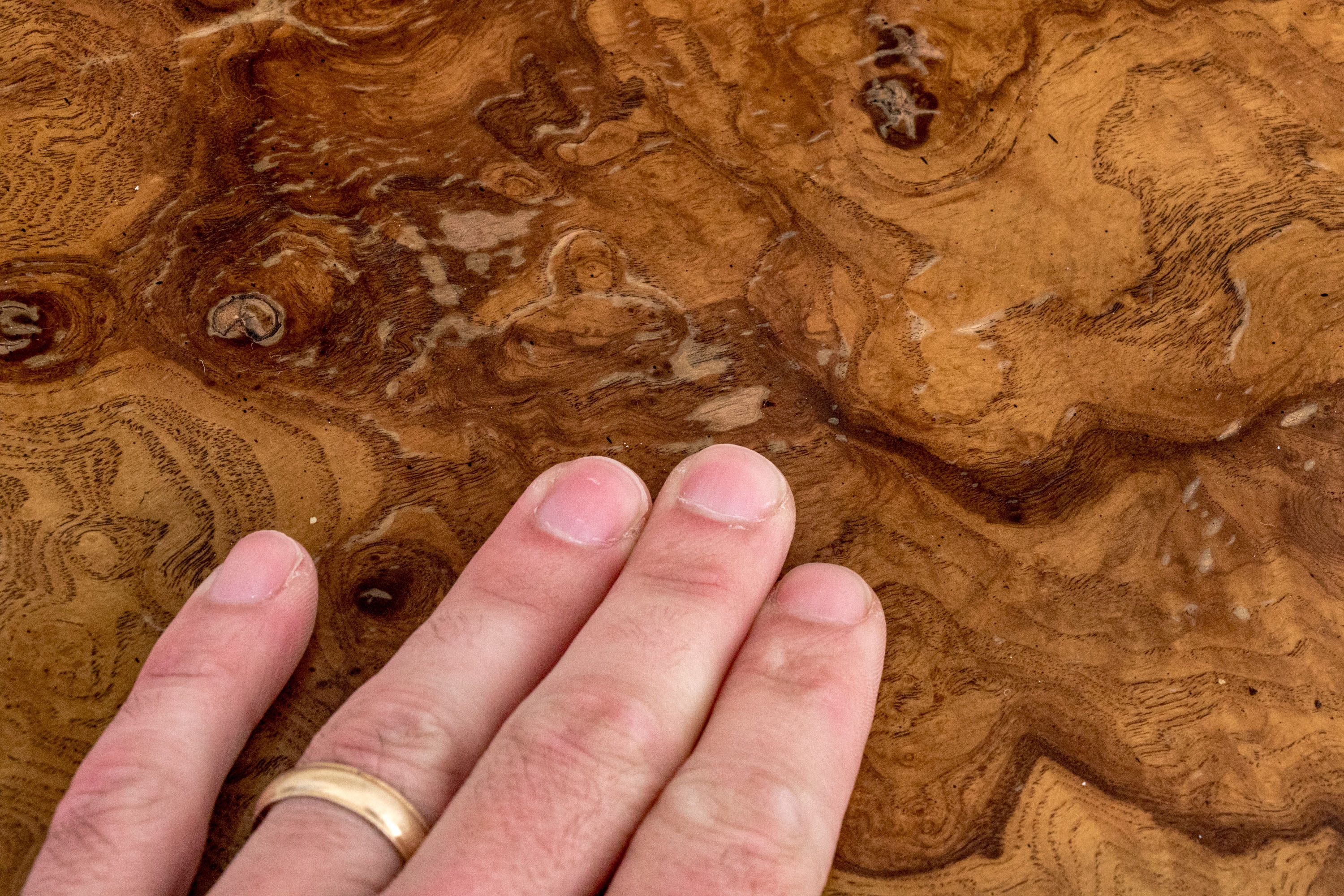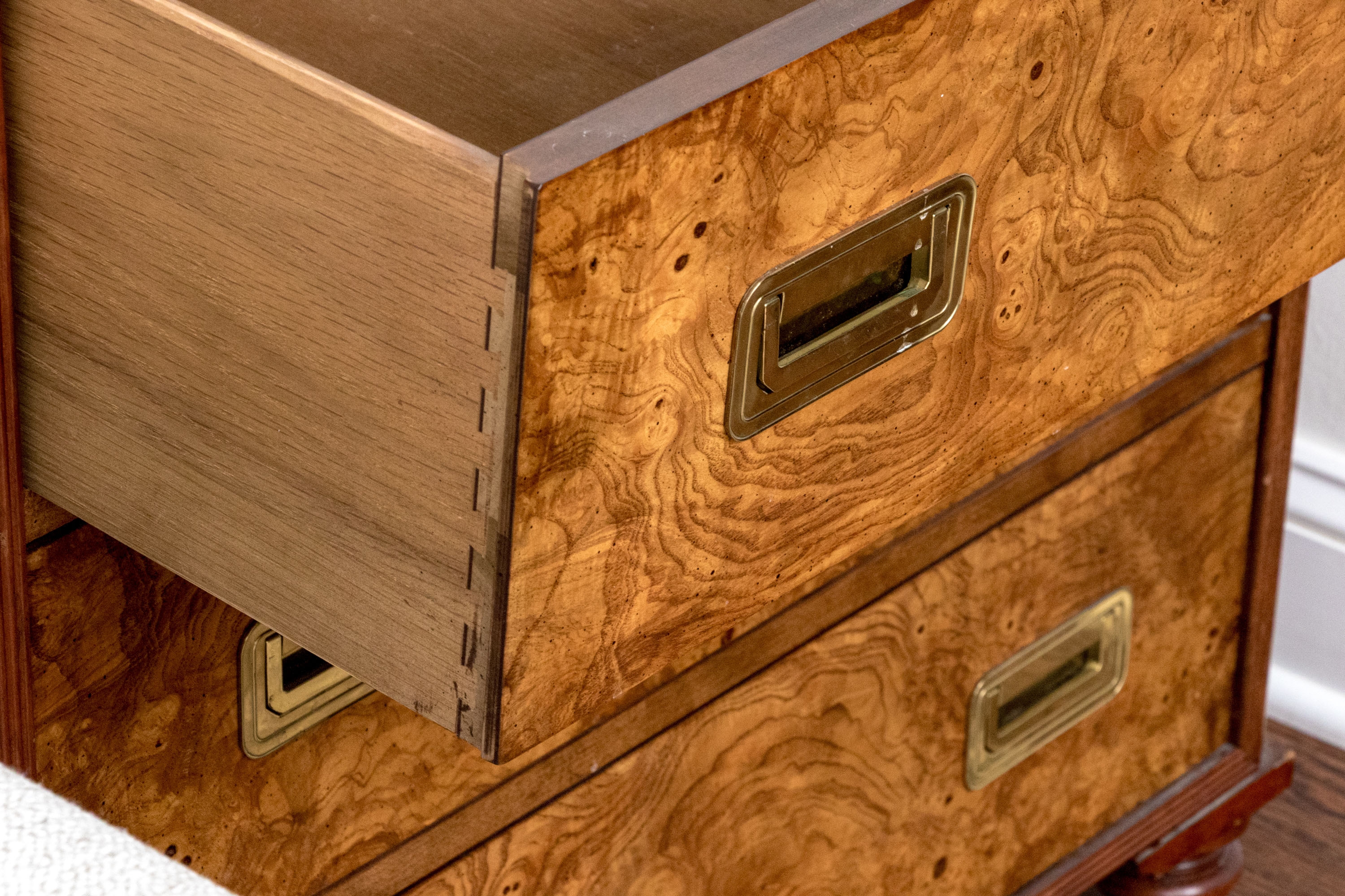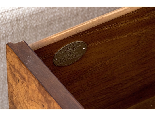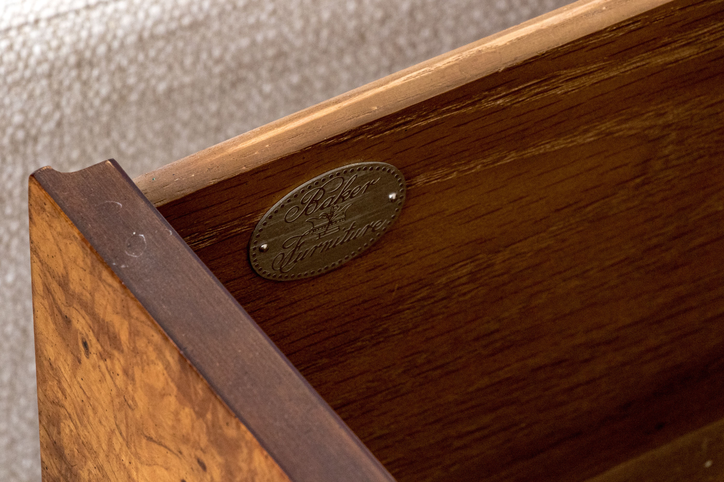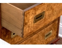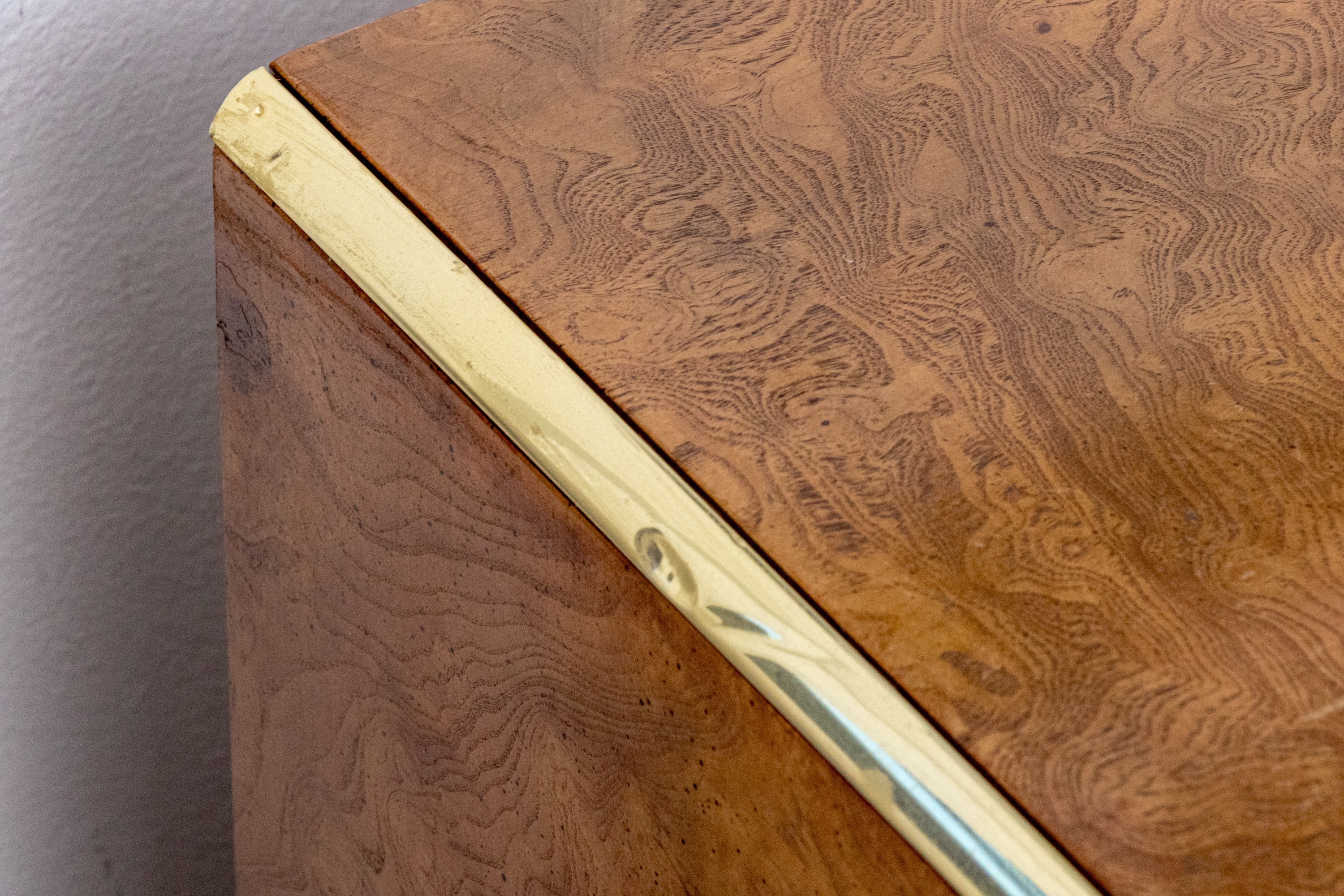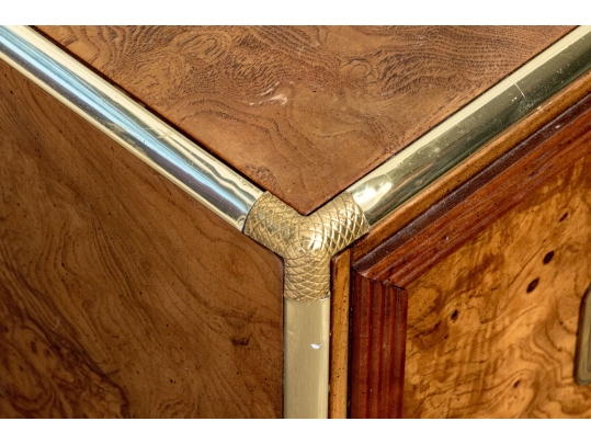 Condition: Various signs of age include wear along the seams of the quartered burl veneer, small dents along the brass trim, gouge to lower right and chip to back foot. Despite the wear the Chest retains a refined presentation. Please see photos for details of condition.