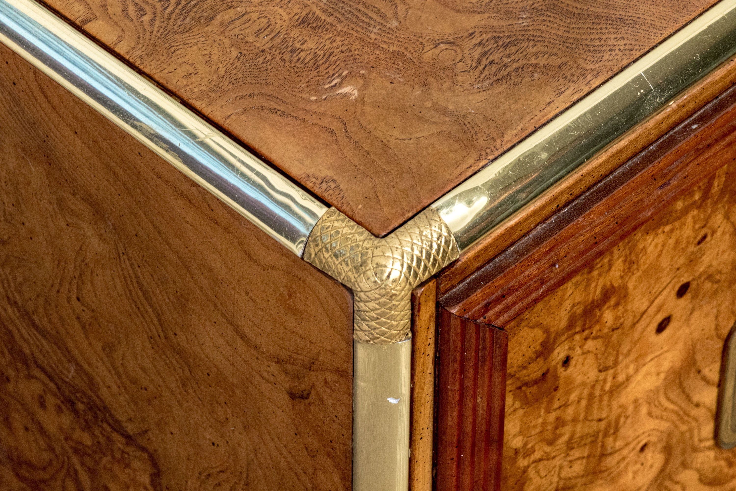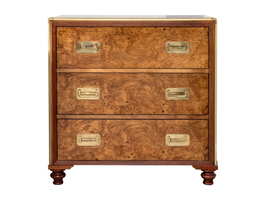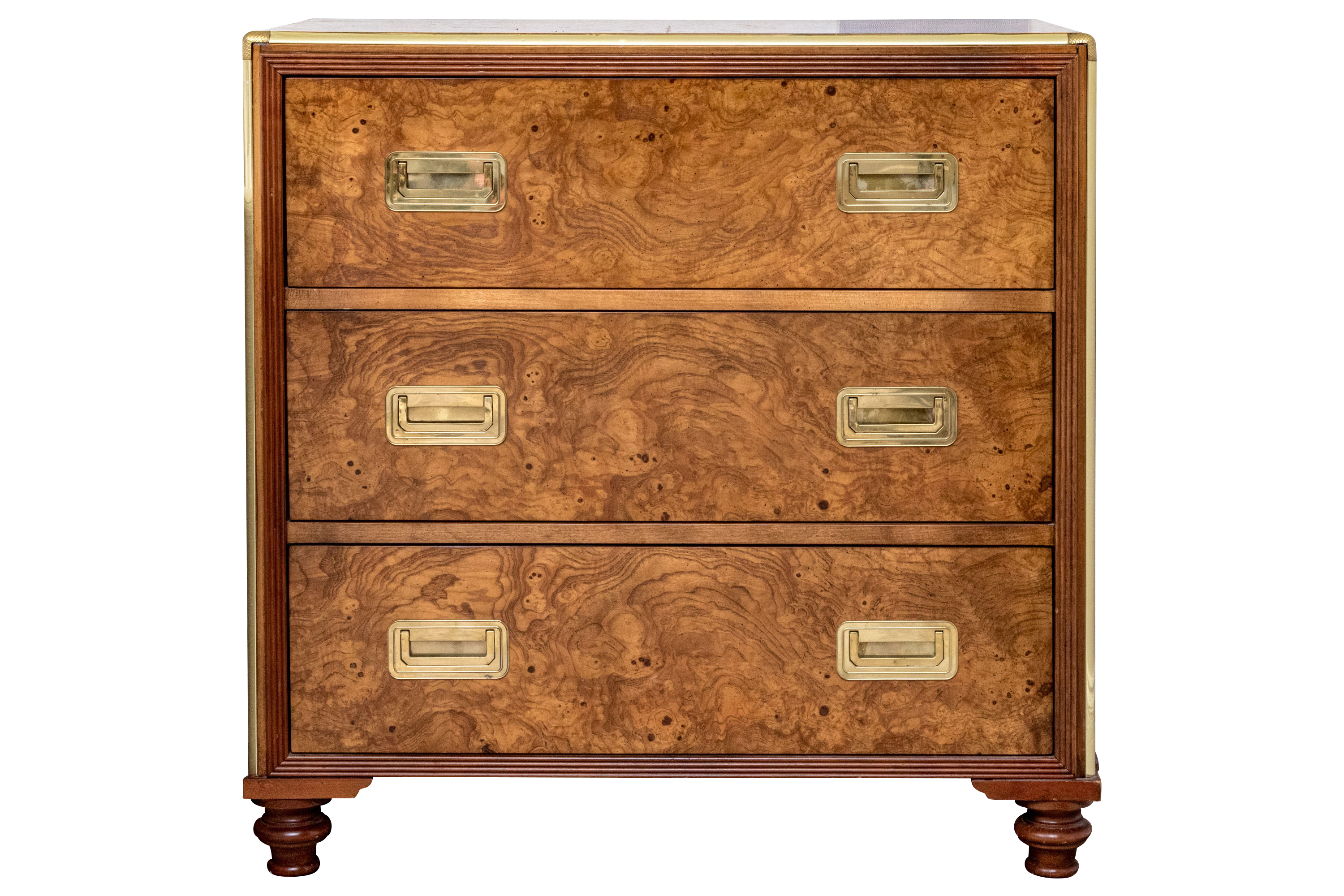 Baker Furniture campaign style three drawer chest with brass trim around the top and vertically flanking the drawers. The three drawers are framed with reeded wood trim and accentuated with embossed brass corners and inset brass hardware. The chest is raised up on bun feet.