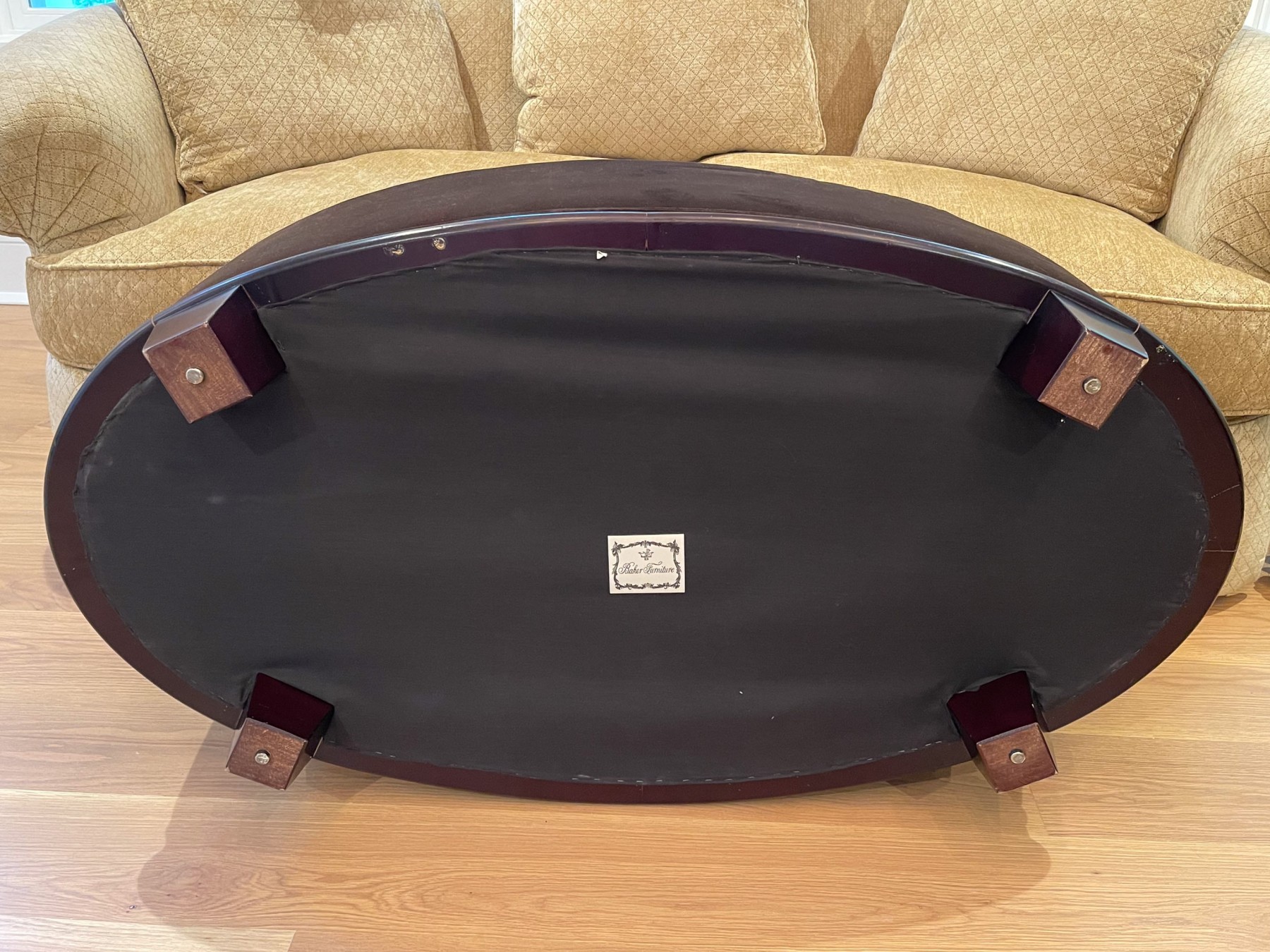 A handsome and finely crafted Baker Furniture upholstered oval ottoman.