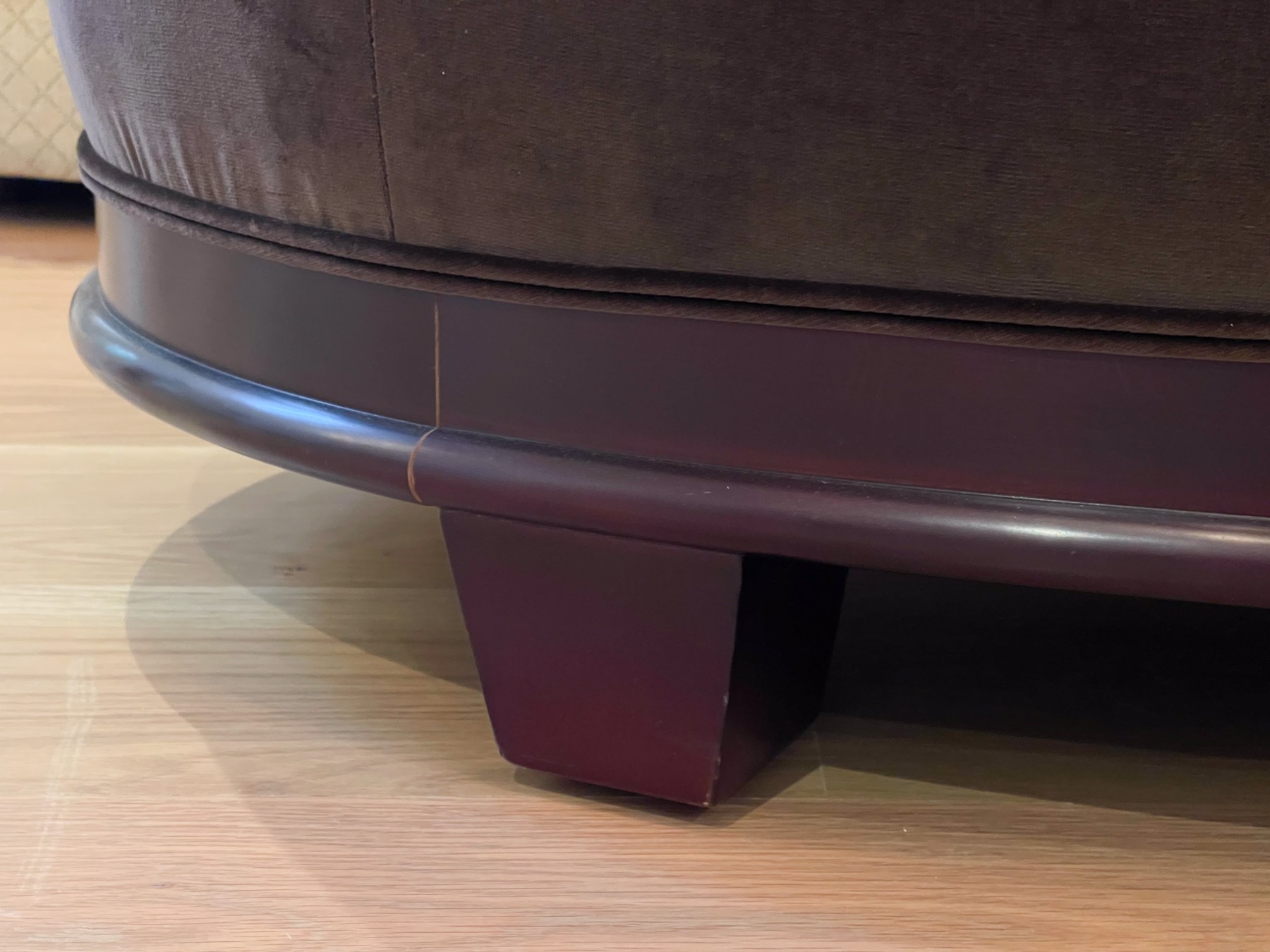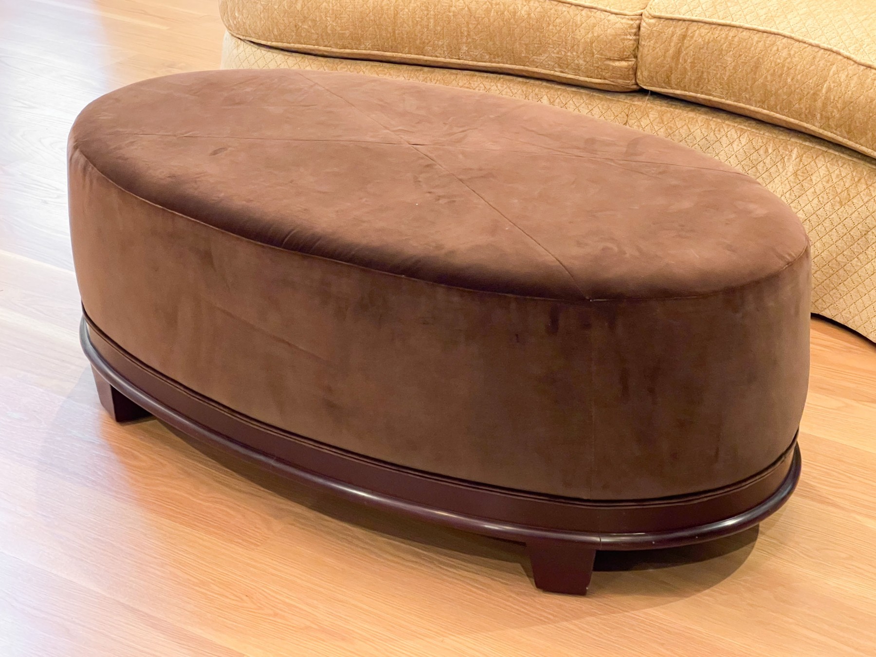 Raised on a handsomely finished wood frame with four short feet, the ottoman takes center stage within ones living room featuring elegant curves and velvety upholstery. Oval ottoman complements most furniture and captures the luxurious look.