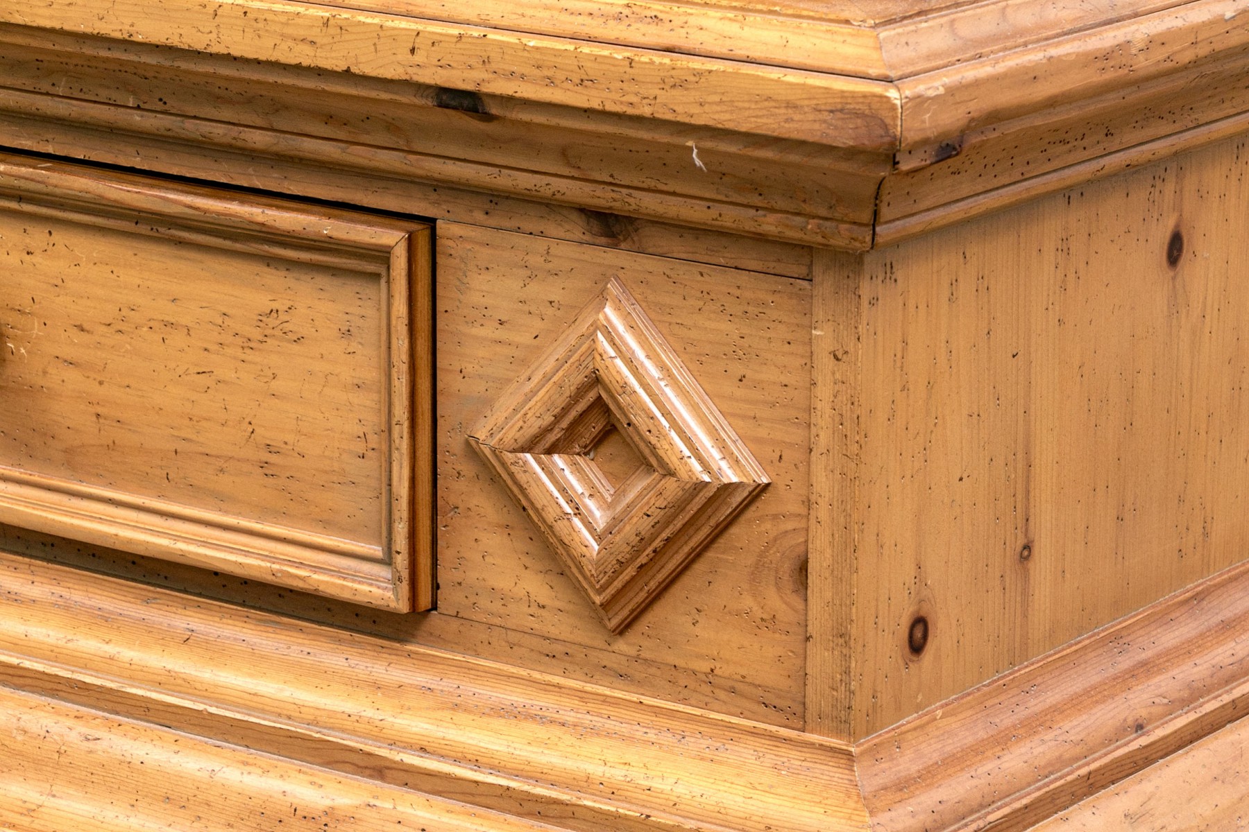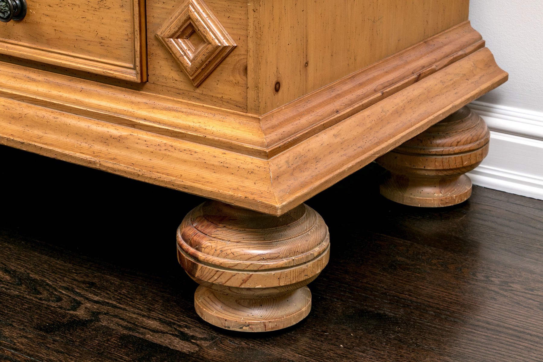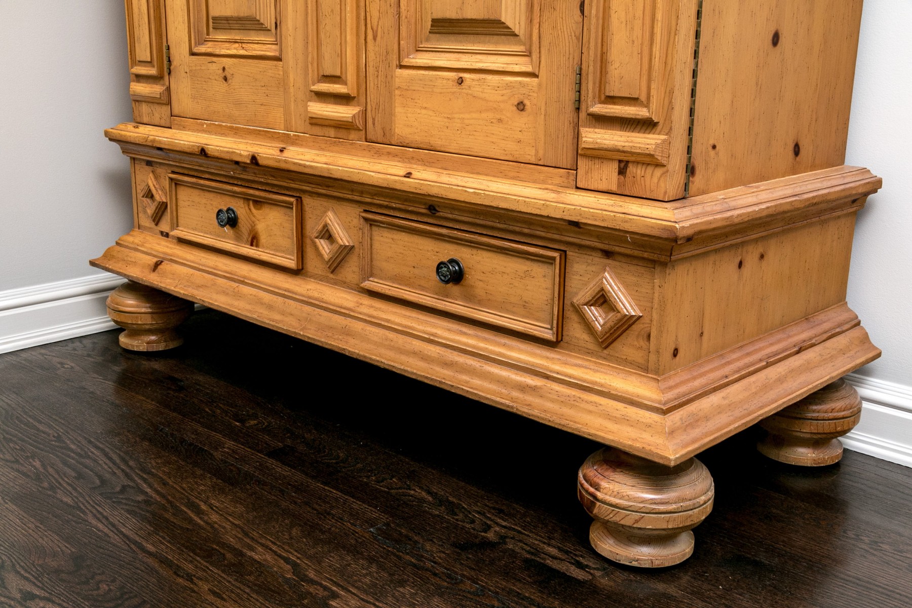 This Baker Milling Road pine armoire is a multifunctional storage piece with elegant design details. It features double doors that open to reveal two spacious interior shelves, an open compartment, and a small drawer, all thoughtfully designed for organized storage. The back of the armoire includes a large cutout for electrical wiring, making it suitable for media use. Below the double doors, you'll find two additional drawers, and the piece is crowned with a substantial cornice. It stands firmly on large, sturdy bun feet.