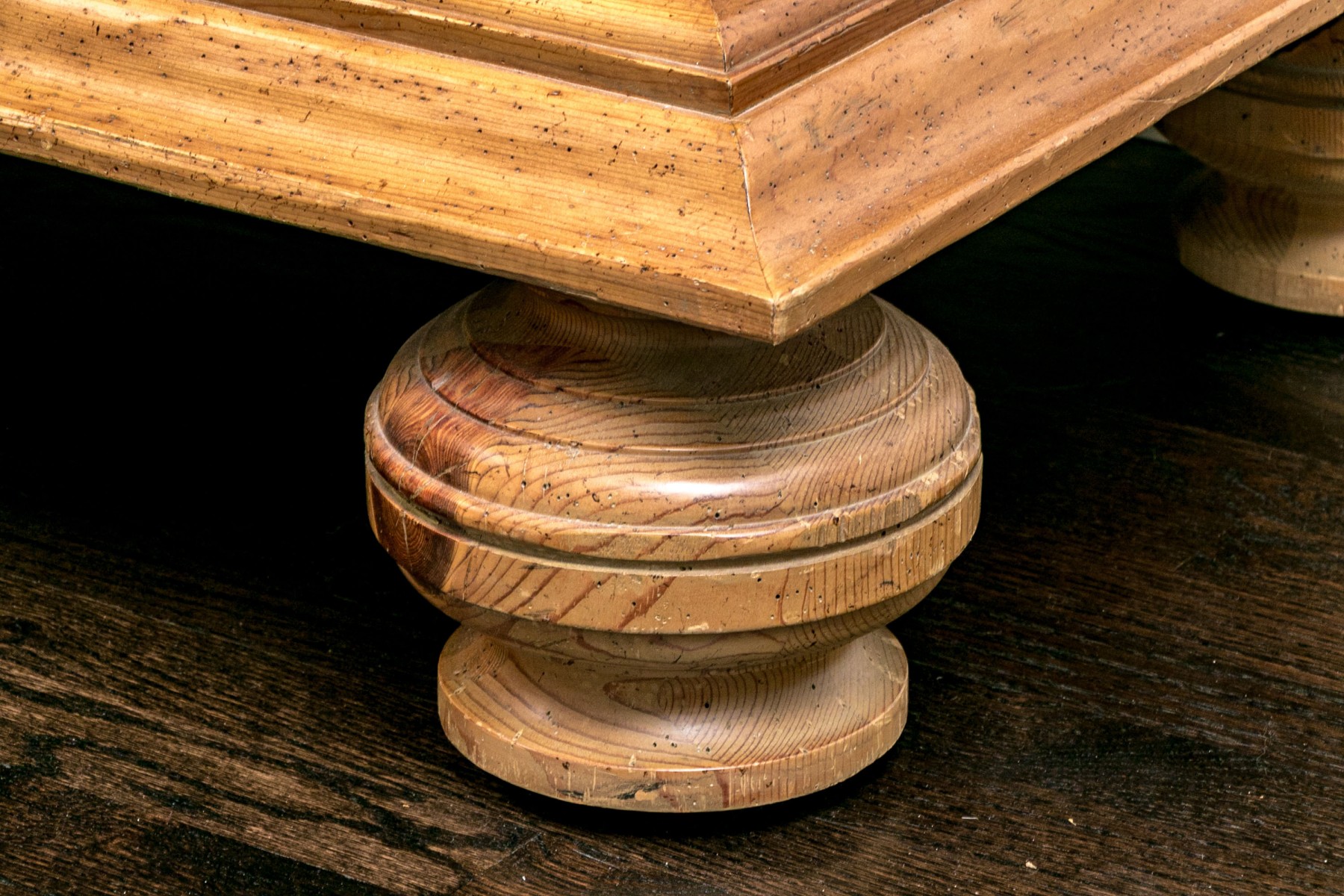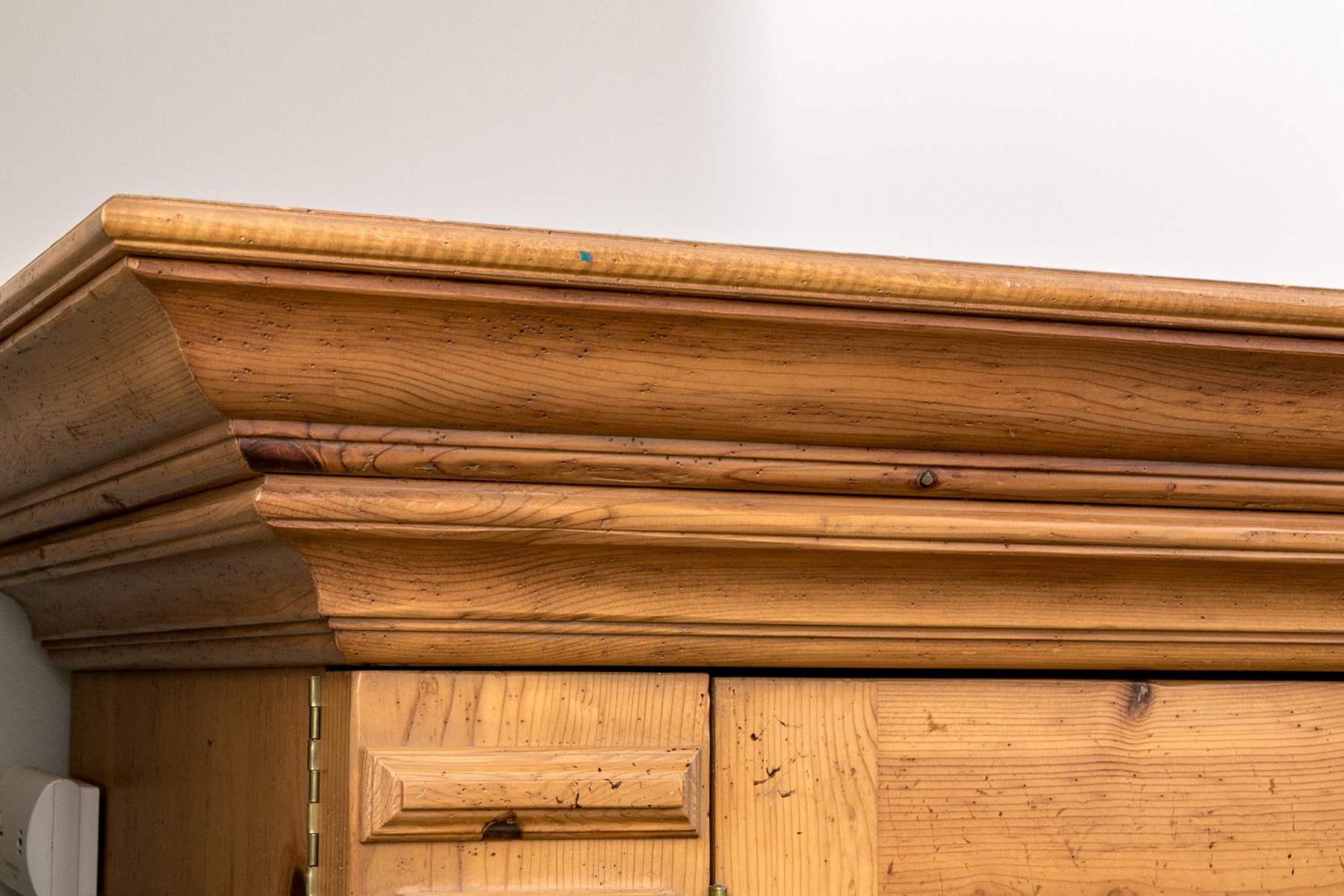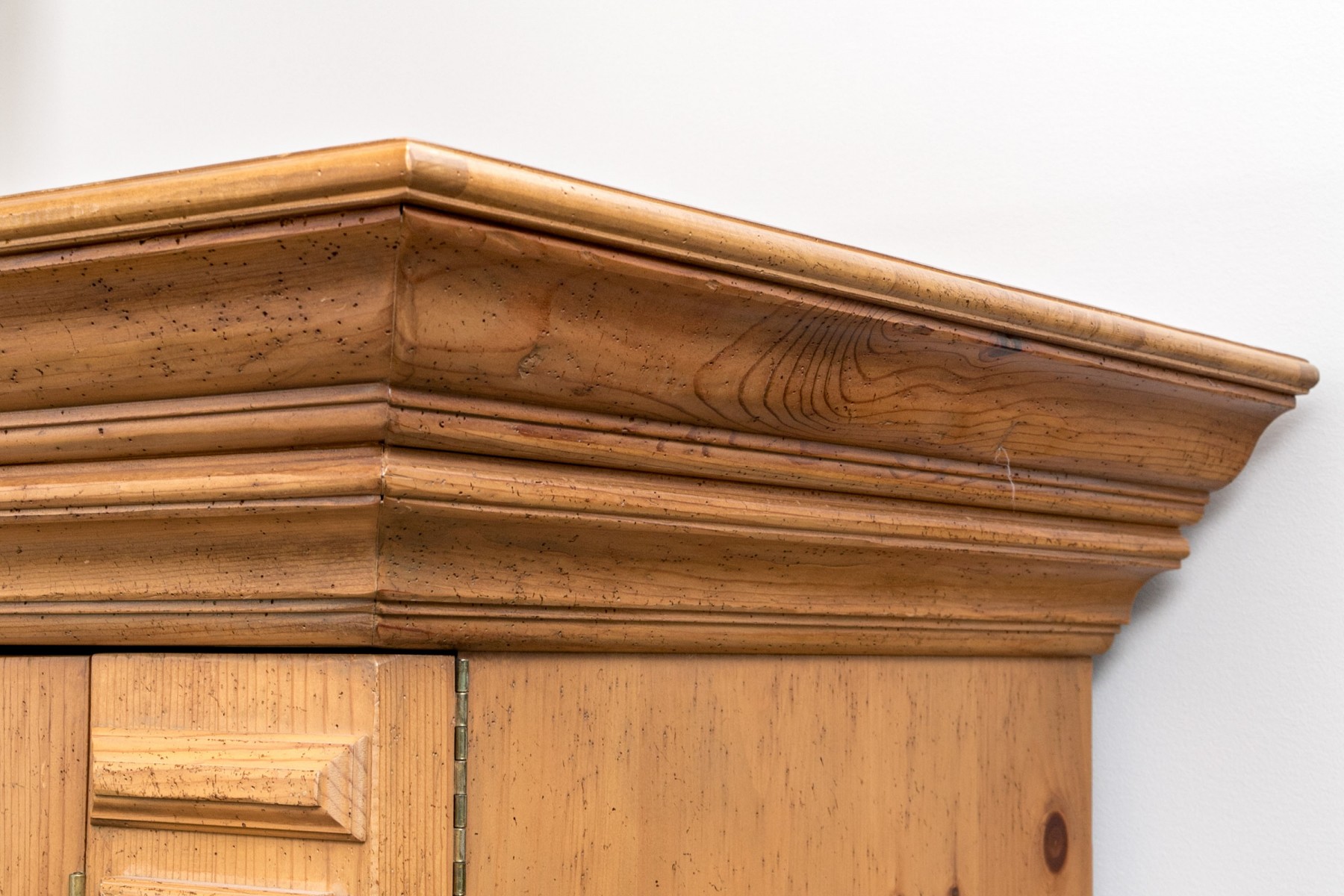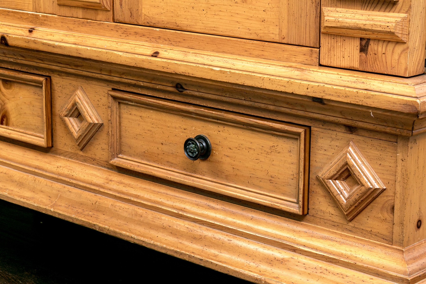 This Baker Milling Road pine armoire is a multifunctional storage piece with elegant design details. It features double doors that open to reveal two spacious interior shelves, an open compartment, and a small drawer, all thoughtfully designed for organized storage. The back of the armoire includes a large cutout for electrical wiring, making it suitable for media use. Below the double doors, you'll find two additional drawers, and the piece is crowned with a substantial cornice. It stands firmly on large, sturdy bun feet.