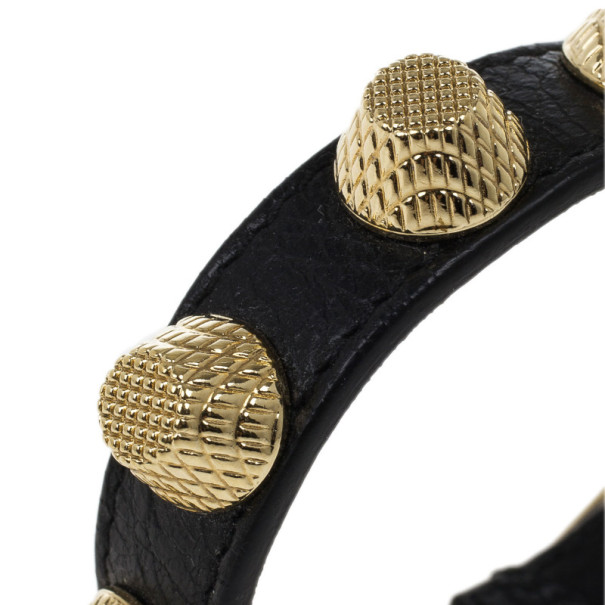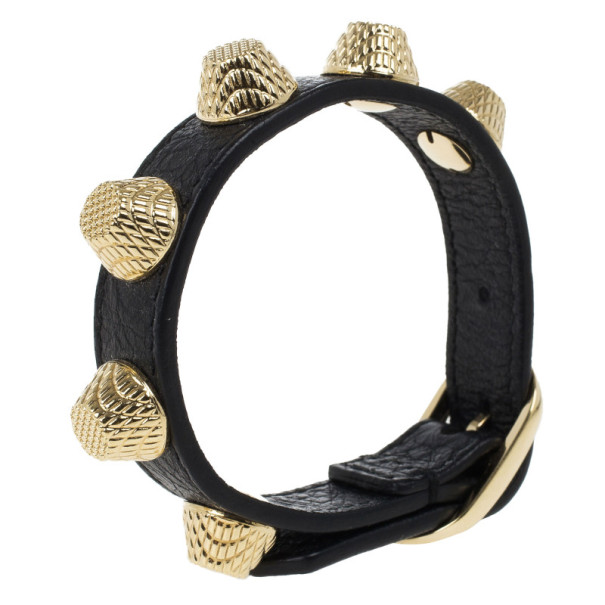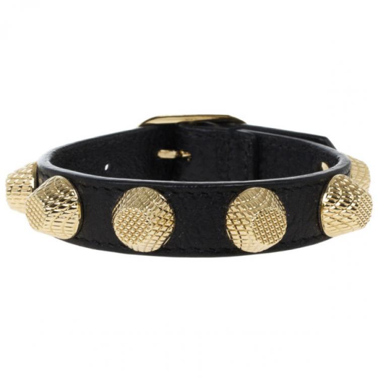 Channel effortless edge with this iconic Balenciaga Arena bracelet. Crafted from supple black leather, it strikes the perfect balance between feminine charm and bold attitude. The oversized gold-tone Giant studs—a signature Balenciaga detail—add a touch of rocker chic, making it a standout accessory whether stacked or worn solo. Finished with an adjustable buckle closure for a comfortable, customized fit.