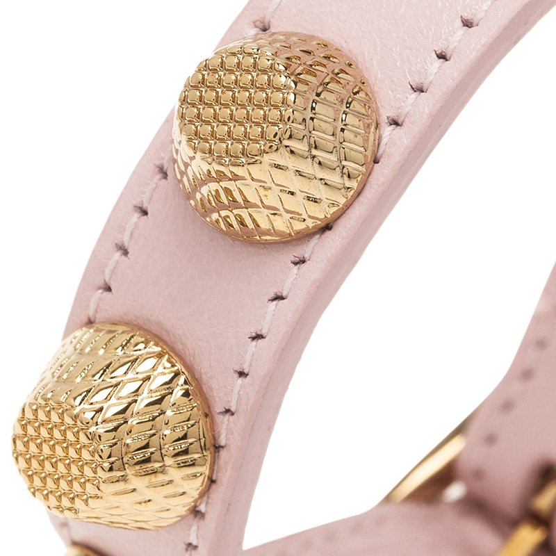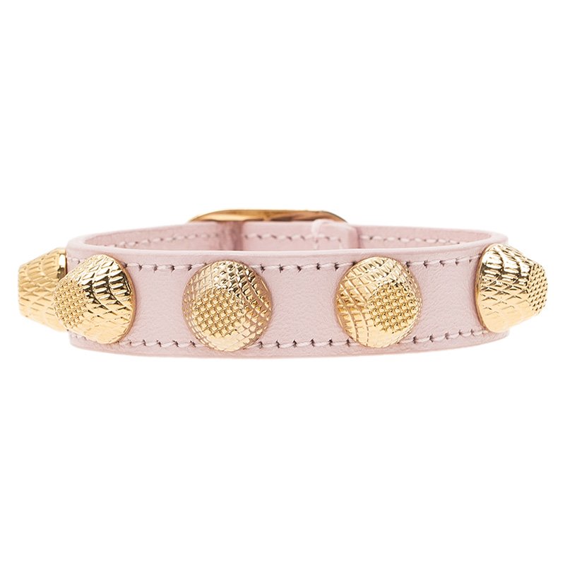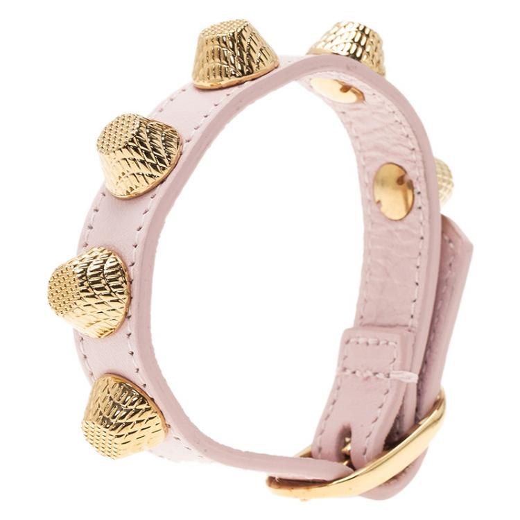 Channel effortless edge with this iconic Balenciaga Arena bracelet. Crafted from supple pink leather, it strikes the perfect balance between feminine charm and bold attitude. The oversized gold-tone Giant studs—a signature Balenciaga detail—add a touch of rocker chic, making it a standout accessory whether stacked or worn solo. Finished with an adjustable buckle closure for a comfortable, customized fit.